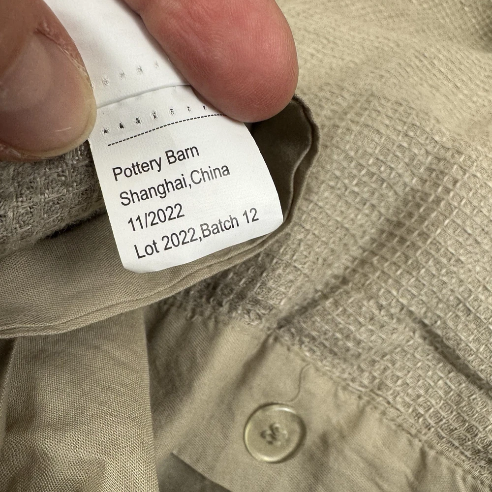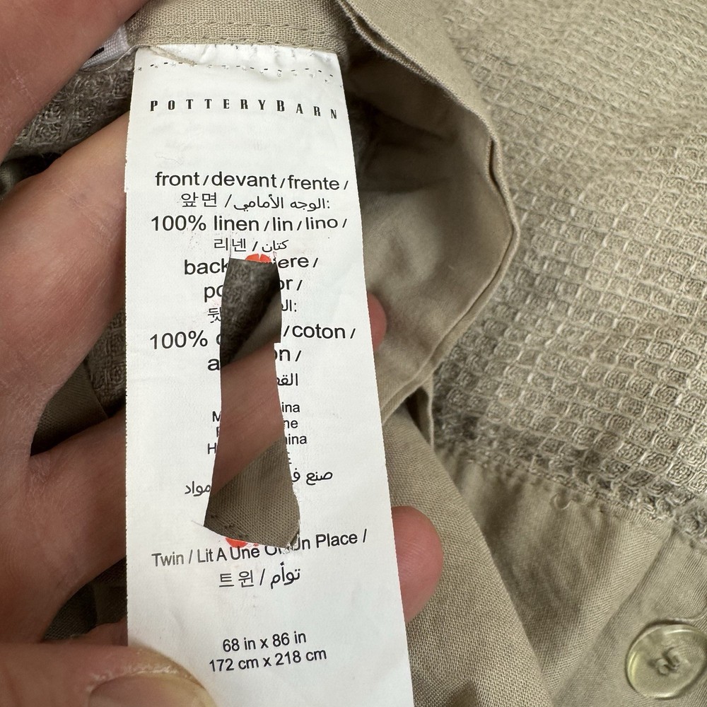 Pottery Barn European Flax Linen Waffle Duvet Cover Twin Dark Flax Cut Tags Read Gently used item / has been laundered There is a small red mark by one of the buttons of the duvet There is a little bit of wrinkling throughout from storage / handling Internal tags have been cut / reference all photos Dimensions: 68”x86”