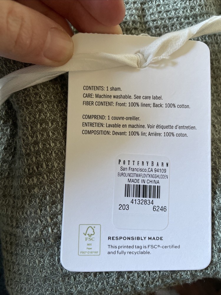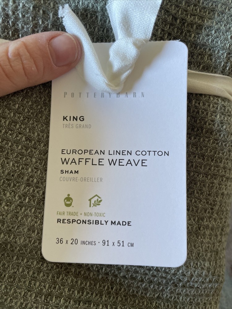 Enhance your bedroom decor with this elegant Pottery Barn European Linen Cotton Waffle Weave King Sham. The sham is crafted from a high-quality blend of linen and cotton, ensuring comfort and durability. It features a stylish waffle pattern in a beautiful Loden color that will complement any bedding set. Measuring 36 inches in length and 20 inches in width, this king-sized sham is perfect for your bed. It is a brand new item with tags attached, making it a great addition to your collection. Ideal for any bedroom, this Pottery Barn European Cotton model sham is a must-have for those who appreciate luxury and style.