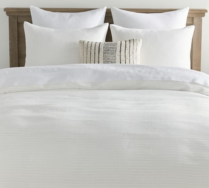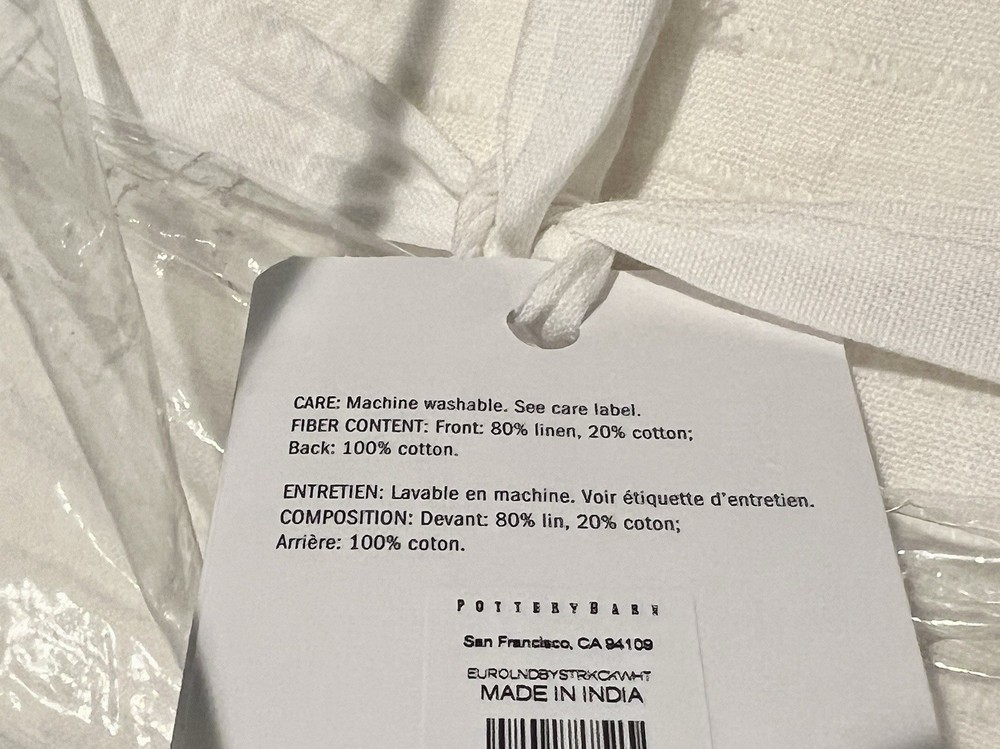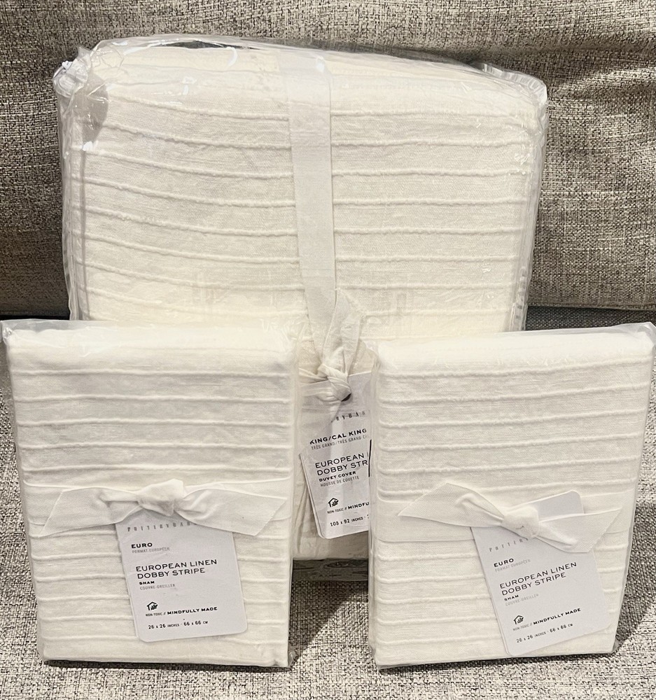 European Linen Dobby Stripe Bedding Set from Pottery Barn. Sold out! Color: Off White (Pottery Barn calls the color of this bedding set "white," but it is more of an off white.) This bedding set includes the following three items: 1 European Linen Dobby Stripe King/Cal King Duvet Cover (fits either a king or cal-king size mattress) 92" length x 108" width 2 European Linen Dobby Stripe Euro Shams 26" x 26" All items are brand new with tags. Front is dobby woven from 80% linen and 20% cotton; reverses to 100% cotton. Prewashed for a super soft hand feel. Duvet features a hidden button closure with interior ties that keep insert in place; shams feature an envelope closure. Imported. Machine wash. The "stripe" in this bedding set is not a different color than the rest of the bedding set; the "stripe" is a design within the fabric. Additional items shown in the last photo, not mentioned above, are not included. ********** Buyer to pay $18.95 shipping. Stored in a smoke-free and pet-free environment. Please ensure shipping address is correct before submitting payment. This eBay seller has no affiliation with Pottery Barn.