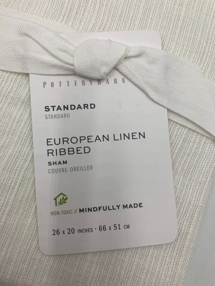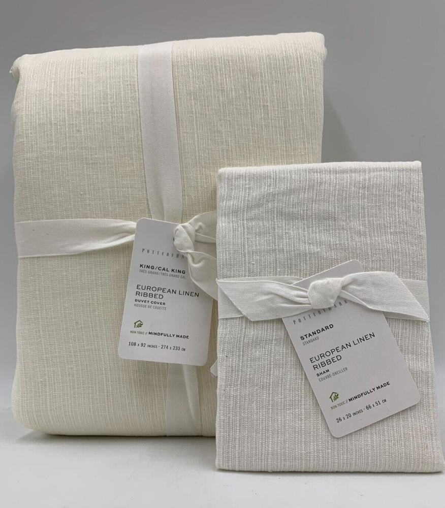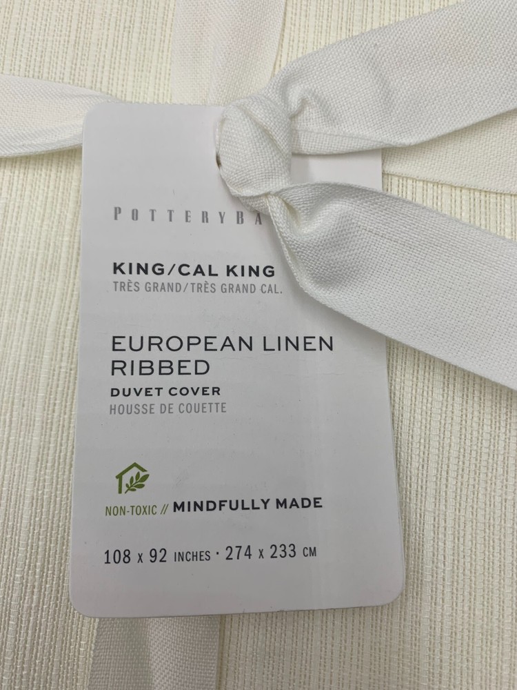 Pottery Barn European Ribbed Linen Duvet King Cal King & 1 Std Sham White #7965E Item is brand new! Auction includes: 1 King/Cal. King Duvet Cover & 1 standard sham **No longer available at Pottery Barn Front is ribbed woven from 100% linen. Reverses to solid. Prewashed for a super soft hand feel. STANDARD 100 by OEKO-TEX® Certified Duvet features a hidden button closure with interior ties that keep insert in place; sham features an envelope closure and flange edges. Duvet cover and insert sold separately. Machine wash. Imported. DIMENSIONS Duvet King/Cal. King: 92" l x 108" w Sham Standard: 20" h x 26" w CARE AND MAINTENANCE Machine wash in warm water. Use only non-chlorine bleach when needed. Tumble dry on low heat; remove promptly. Warm iron if needed.