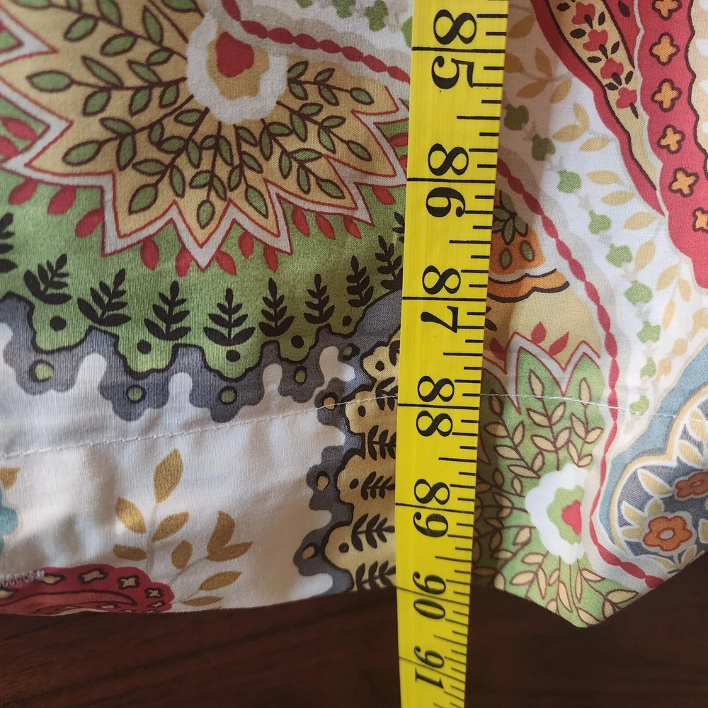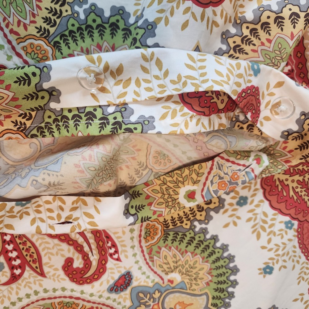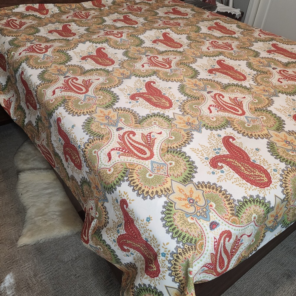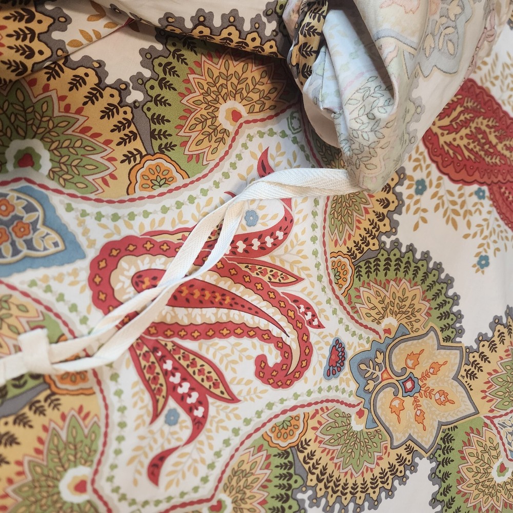 Pottery Barn Linden Paisley Multi Warm Colors FULL QUEEN Duvet Cover Cotton Reverse side same print Inside corner ties Clear button closure 92 inches wide x 90 inches long Shown on queen size bed