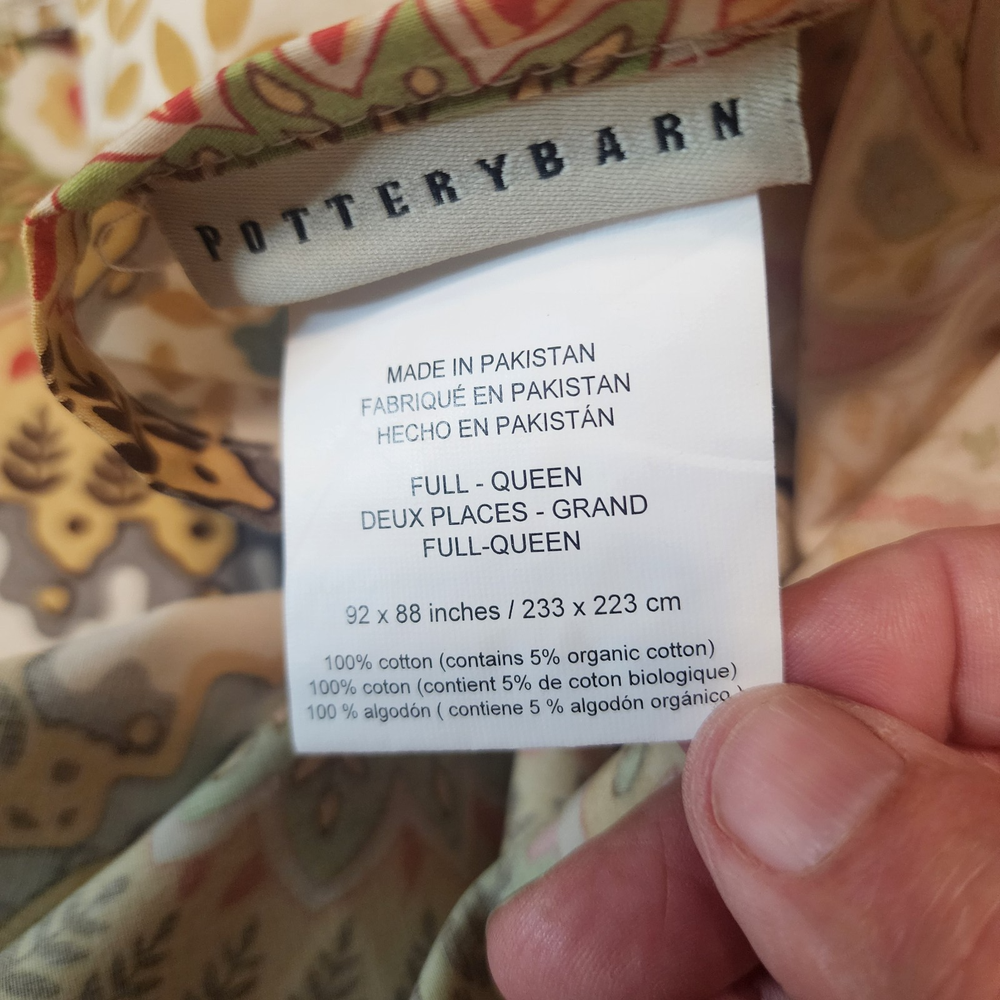 Pottery Barn Linden Paisley Multi Warm Colors FULL QUEEN Duvet Cover Cotton Reverse side same print Inside corner ties Clear button closure 92 inches wide x 90 inches long Shown on queen size bed...