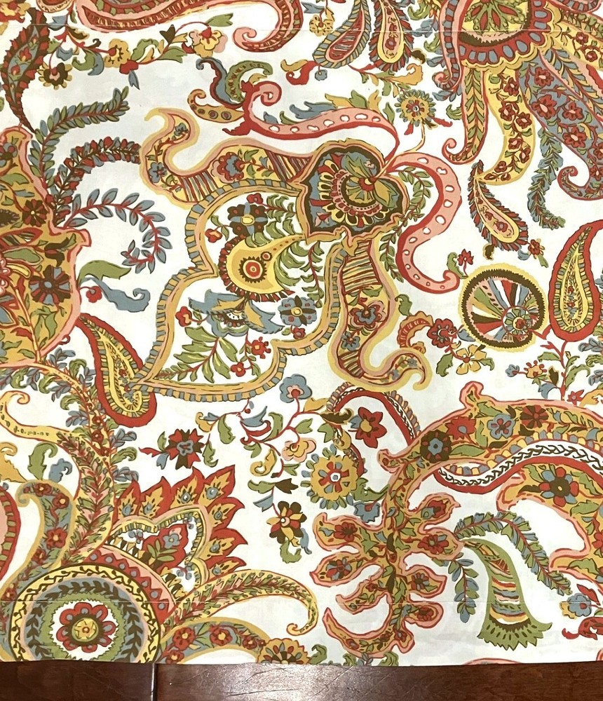 This Pottery Barn Felicity paisley duvet set includes a queen/full duvet cover and two king pillow shams in a beautiful paisley pattern with shades of red, gold, blue, and green. Made from 100% cotton (including 5% organic cotton), this three-piece set is designed for a queen or full size bed and features a French Country style. The set is machine washable for easy care and has a button closure on the duvet cover. The queen duvet cover and king pillow shams (39" x 24") are in very good used condition with no rips, tears, or stains.
