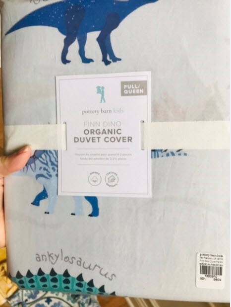 POTTERY BARN KIDS FINN DINO DUVET COVER Colorful prints of friendly dinosaurs adorn this sweet duvet cover and shams. Crafted from pure organic cotton, this bedding is GOTS certified—the gold standard of organic textiles—for a healthier night’s sleep. Duvet cover is made of 100% organic cotton percale. Digitally printed design. Duvet cover and shams reverses to same pattern on back. Duvet cover has button closures and shams have 5" overlap on the back. 200-thread count. Machine wash. Imported. Auct ion is for QUEEN duvet with TWO STANDARD SHAMS. Item is BRAND NEW in ORIGINAL PACKAGING! A d d i T i O N a l P h o T O s A v a i L a B Le U p O n R e Q u e S T PURCHASED DIRECTLY FROM POTTERY BARN KIDS. AUTHENTIC.
