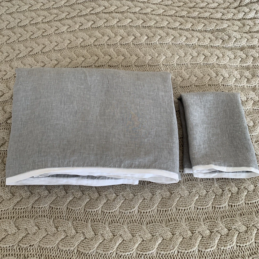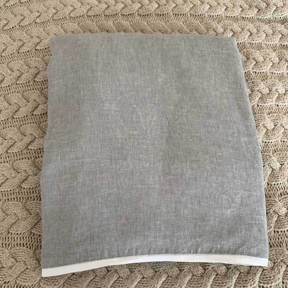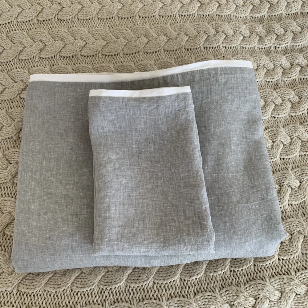 Nice used condition. No stains, rips or holes. Please examine photographs carefully and ask question if you have any concerns. 100% Linen. White trim along all sides of the gray linen duvet. Set Includes: 1 King Duvet 1 Standard Pillowcases Always Happy to Combine Shipping.