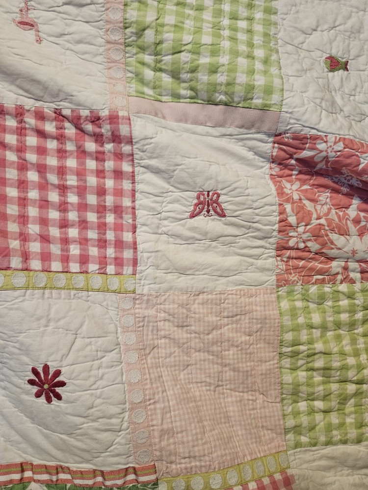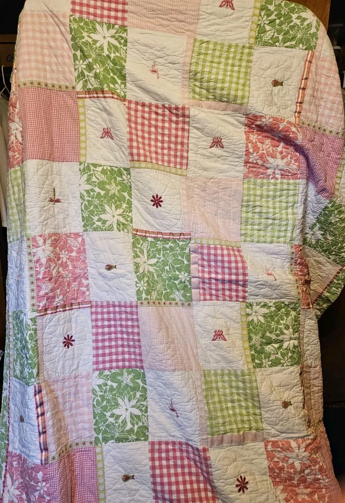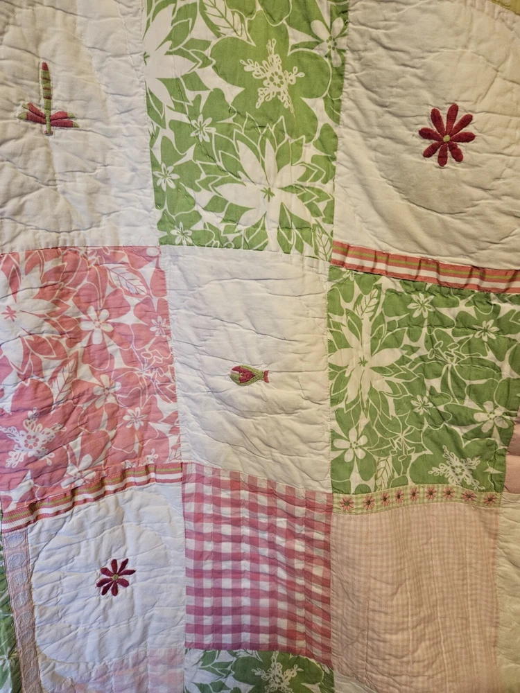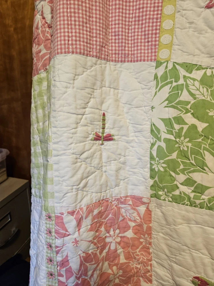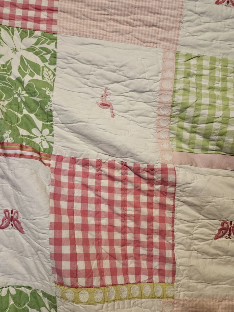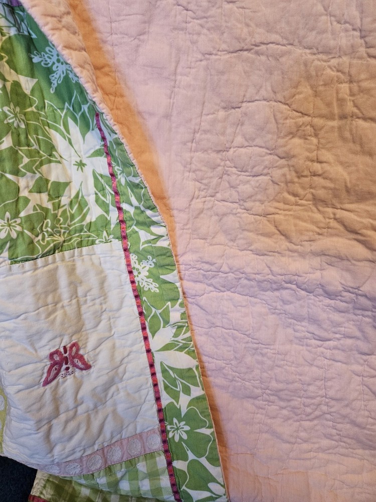 Absolutely love this charming quilt! The vibrant butterfly, flower, and flamingo design is so cheerful, perfect for a kids' room. It’s incredibly soft and in fantastic pre-owned condition—no stains or holes, just cozy comfort. The patchwork detailing adds a lovely handmade touch. Super happy with this find!