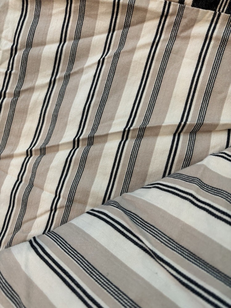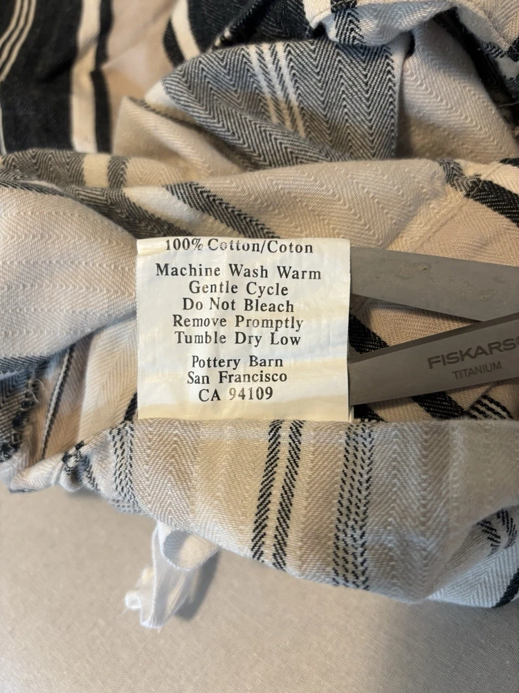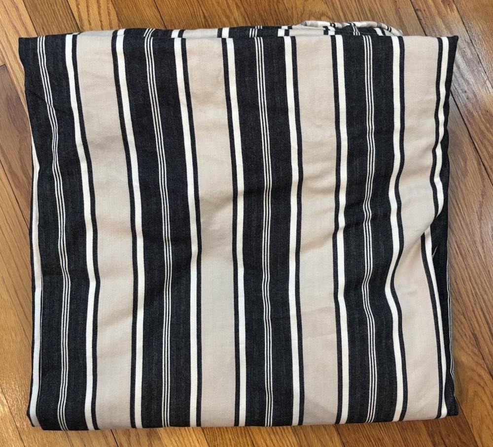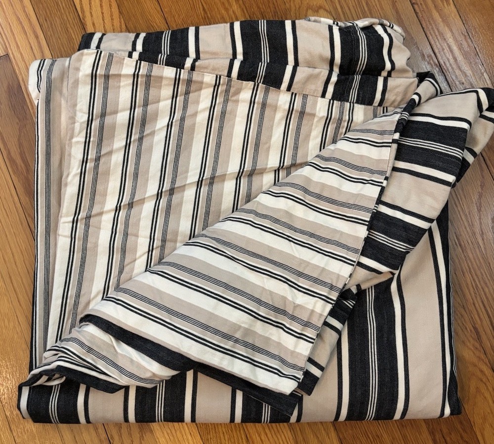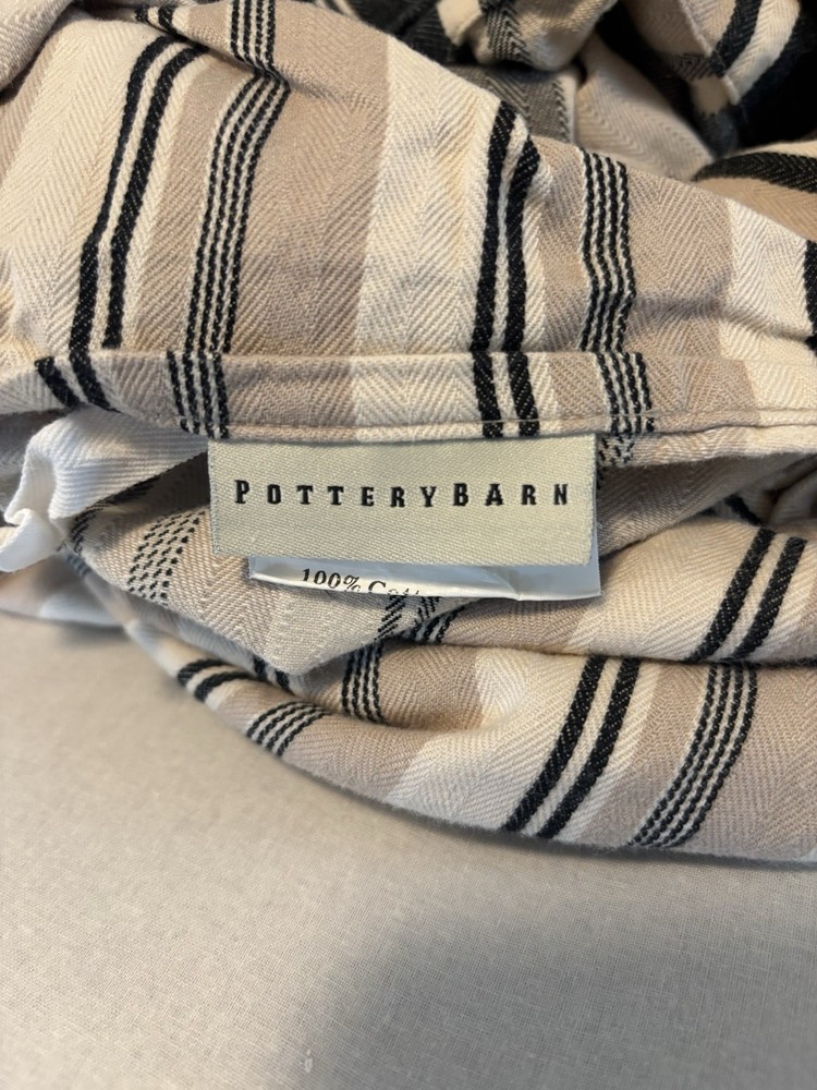 This listing is for a Pottery Barn black and tan and ivory striped duvet as shown. This duvet is 100% cotton and care instructions state machine washing is fine. It measures approximately 82" by 82"--please confirm this will fit your bed. It is in good used condition with no holes, stains, loose seams, or odors. There may be some light wash fade--these colors are 'soft'. This duvet is coming from a smoke- and pet-free home. This duvet will be sent to you via USPS or UPS (no P.O. Boxes, please) using the least expensive service for $16.95. I ship all items the next business day after your payment clears. Please note that I only ship to the 48 contiguous states. View my feedback--100% positive--and buy with confidence. If you have any questions, please ask. Thanks!