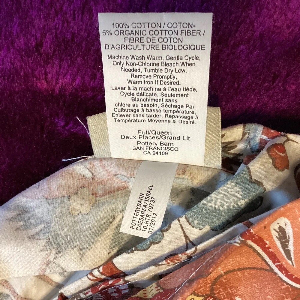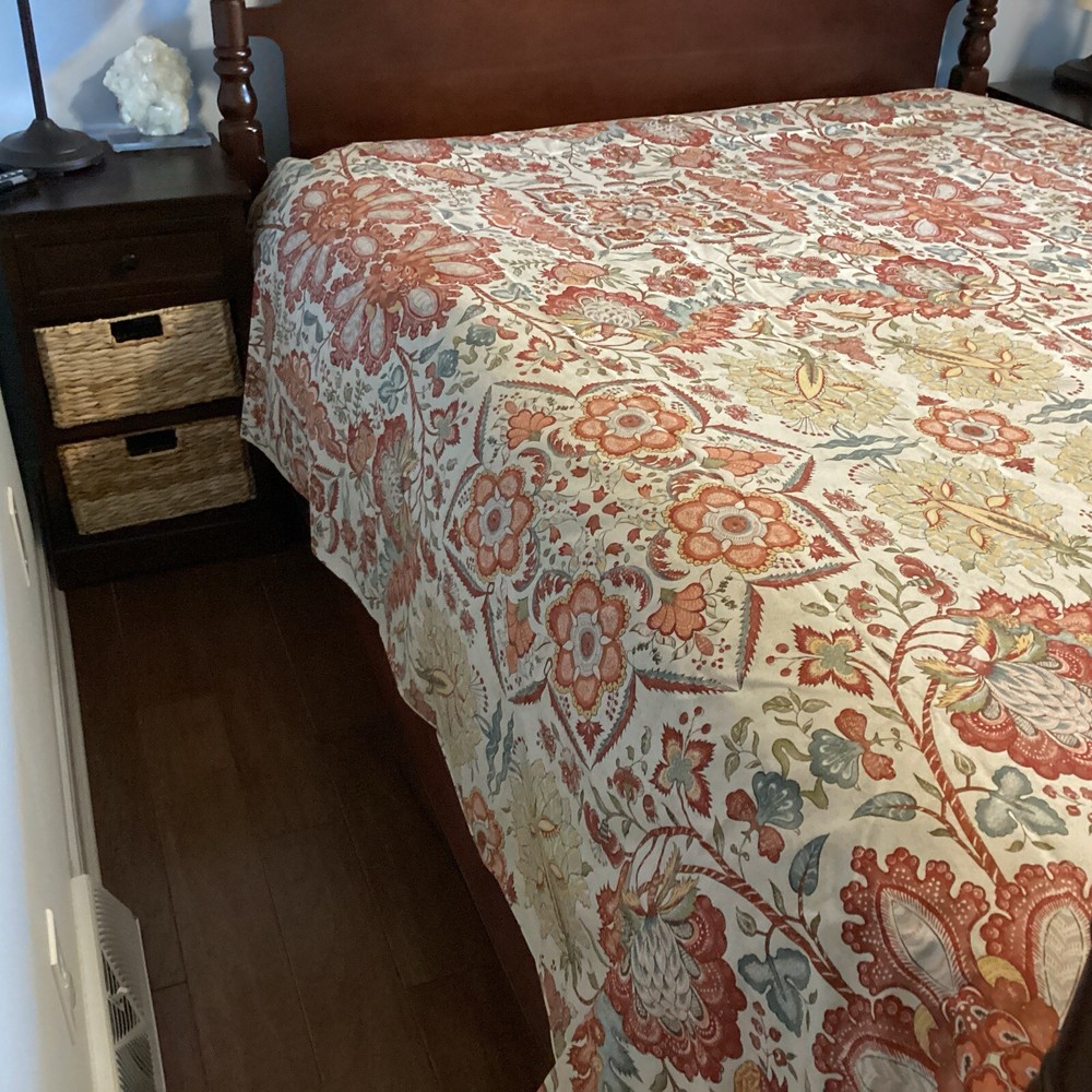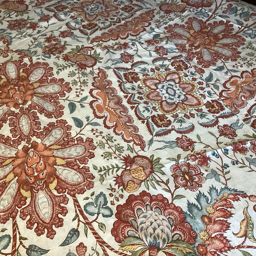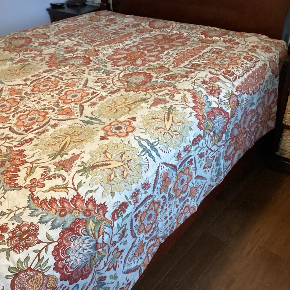 This beautifully designed Pottery Barn duvet cover in the CORA Paisley Floral pattern is the perfect addition to any bedroom. Made from 100% cotton, this queen-sized duvet cover measures 88" in length and 90" in width. The bold floral design in a mix of red, green, blue, and cream colors will add a touch of luxury to your bedding. The duvet cover is the same material/pattern on both sides. The duvet cover includes easy care instructions, is machine washable and reversible, making it a practical and stylish choice for both teens and adults. The closure type is buttons, and the set includes one duvet cover. This cover is perfect for all seasons and will keep you comfortable year-round. New without tags! Duvet was taken out of the packaging and placed in a linen closet and was never used. Photographed on a queen size bed.