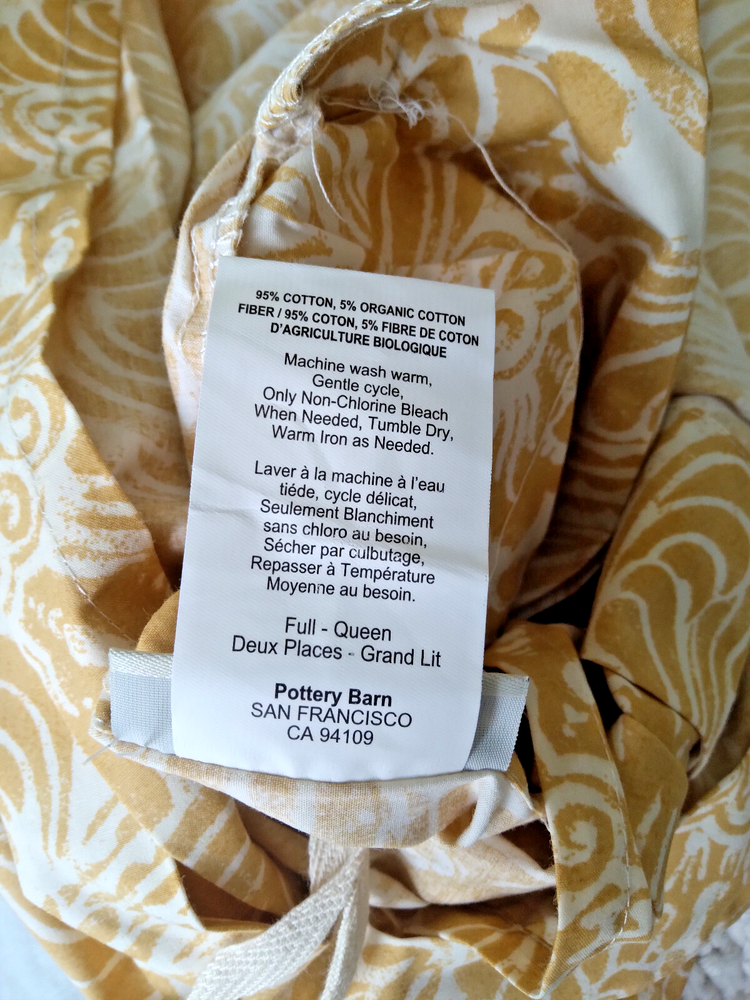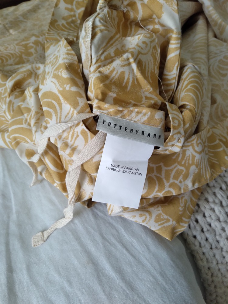 You are purchasing a new Pottery Barn duvet cover with button closure. It has corner ties inside for the filler. The color is a buttery golden yellow. This is a new never used item and it does not have the original tags or packaging. Please view the photos for all the details. The buyer will pay for the cost of shipping. The sale will be final, no returns. Please be sure to check out my other listings.