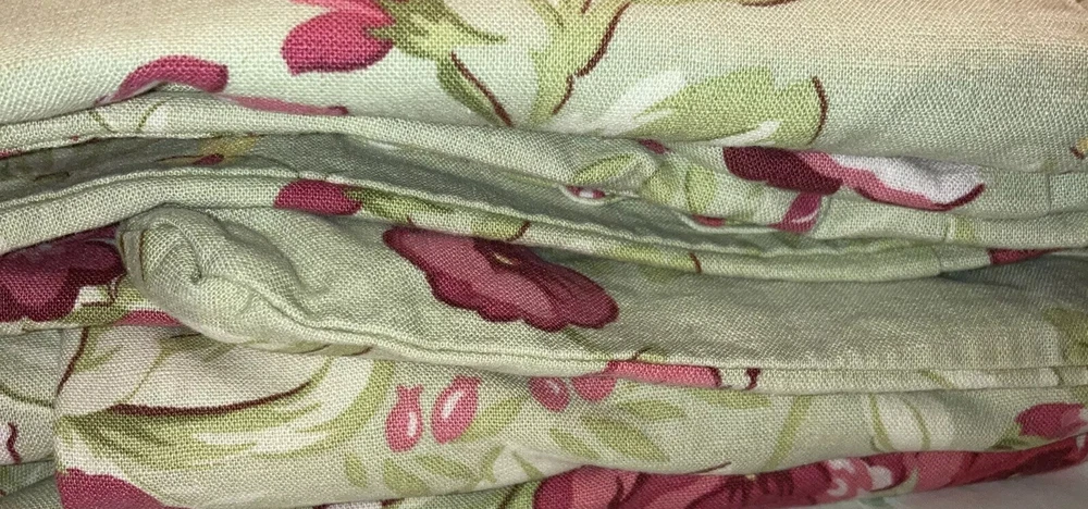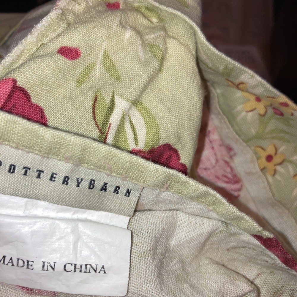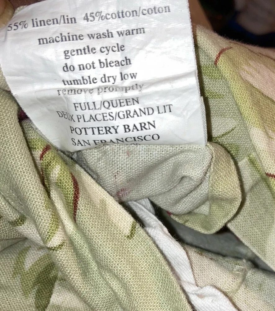 Pottery Barn Multicolor Full /Queen 55% Linen and 46% Cotton Duvet Cover. Colors include red roses, beige on sage background. Excellent Preowned condition. No holes, rips or stains. Shipped with usps Priority mail.