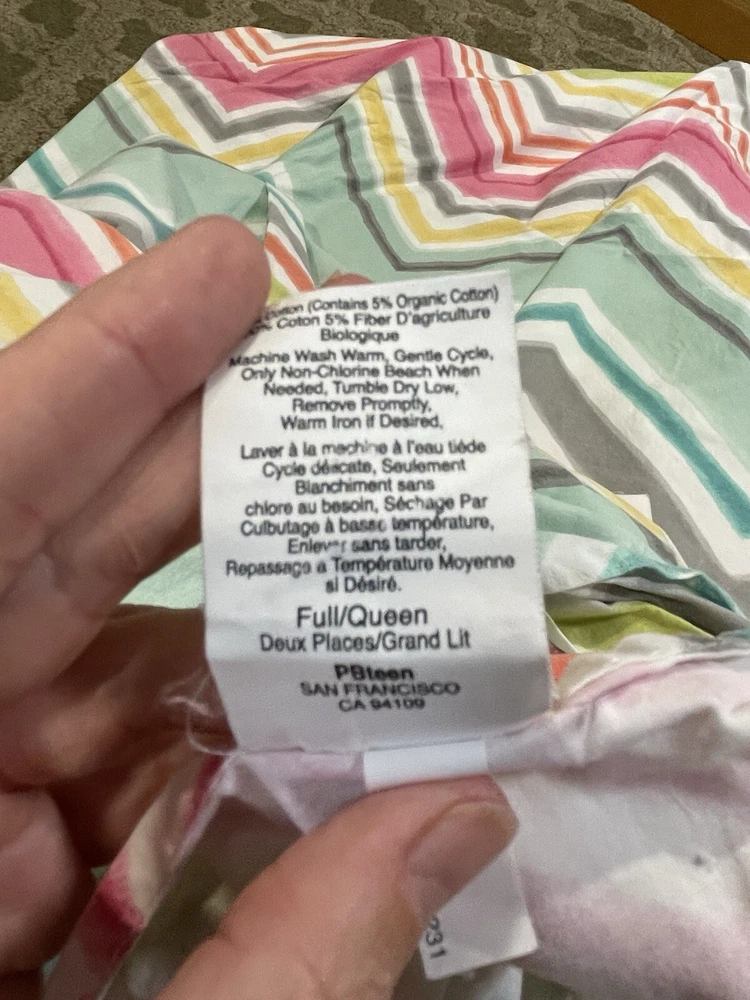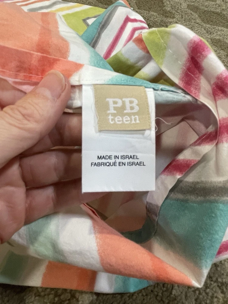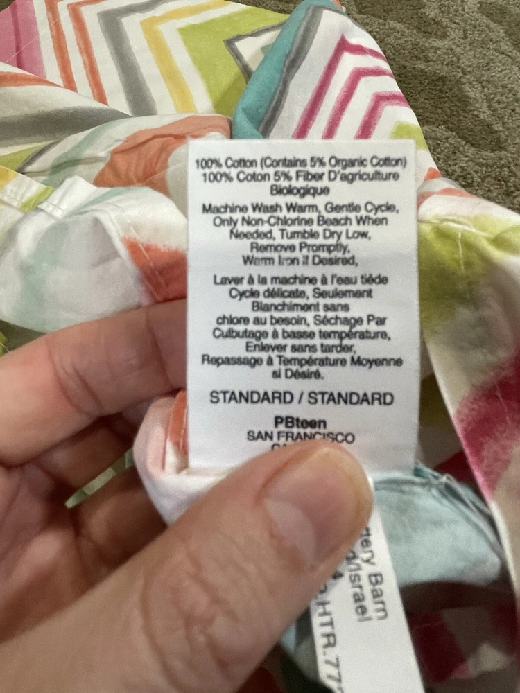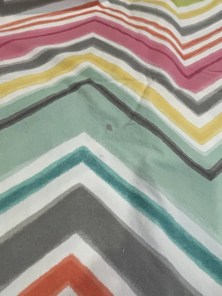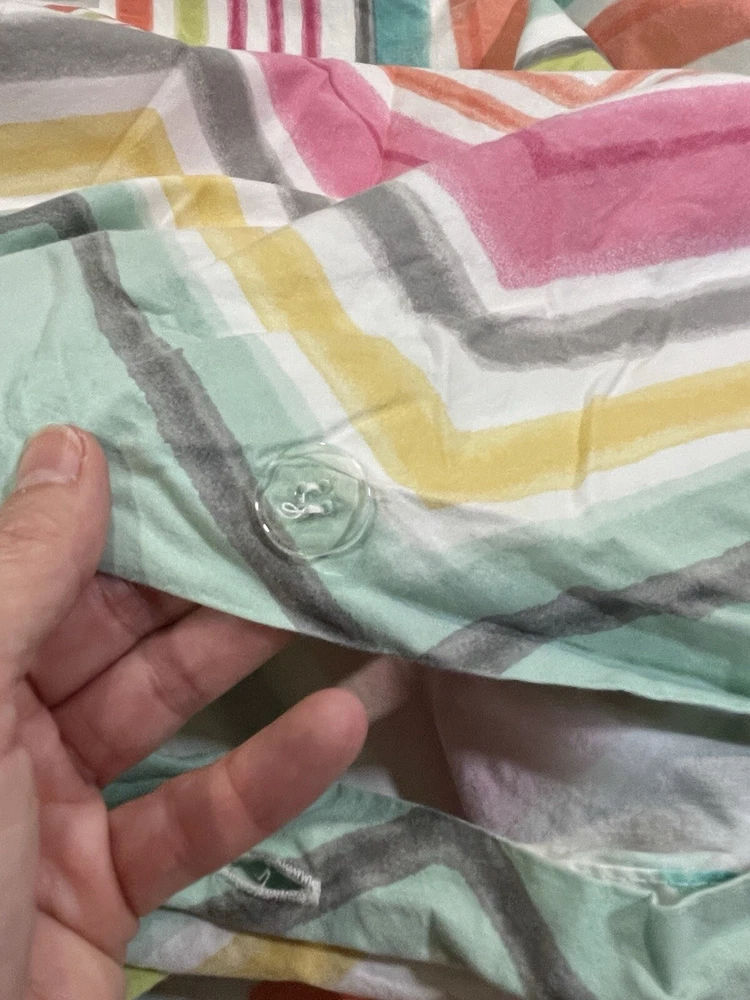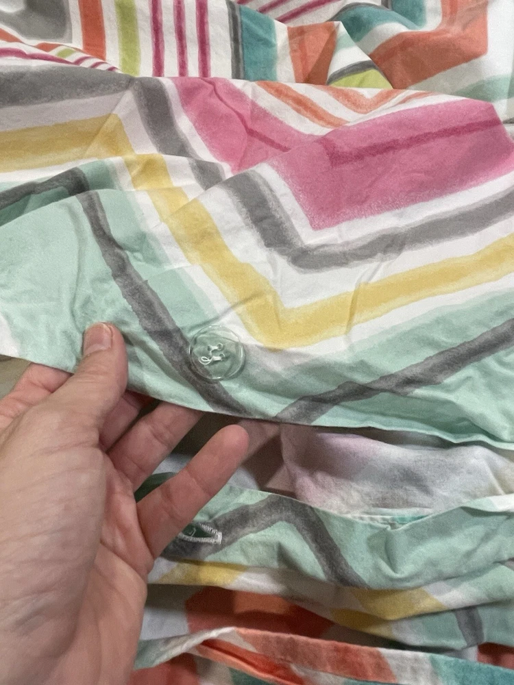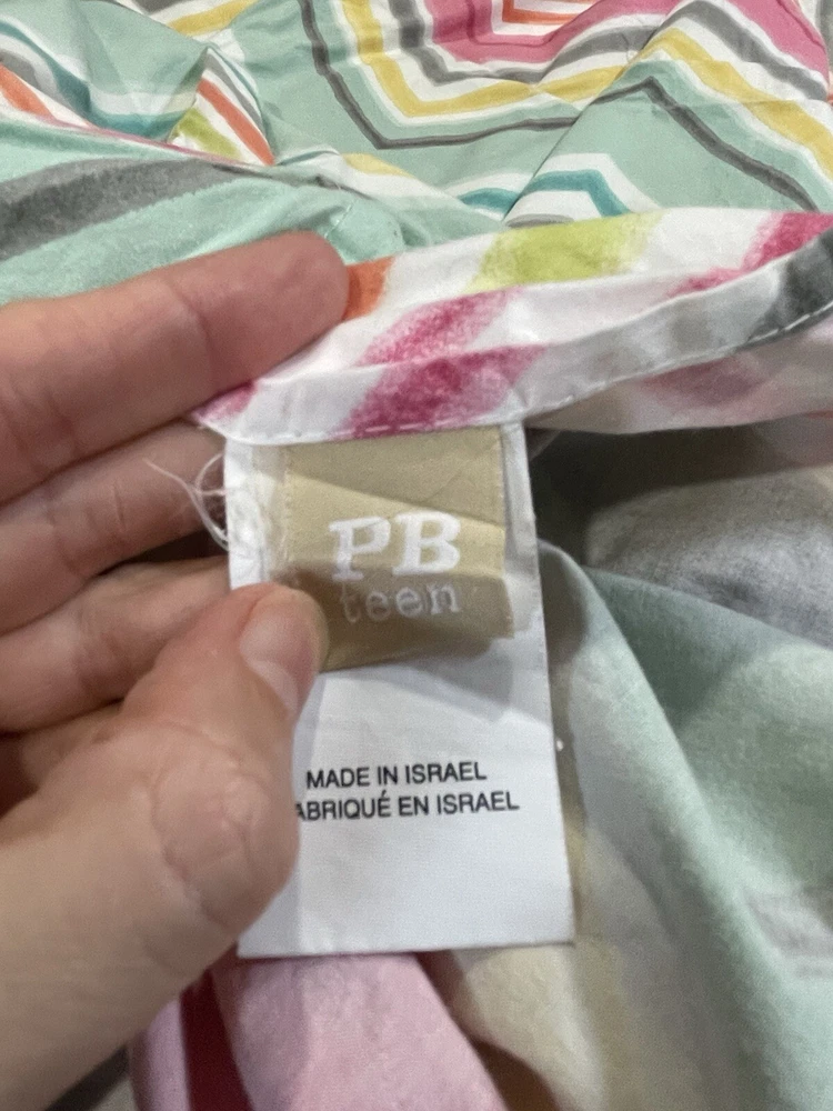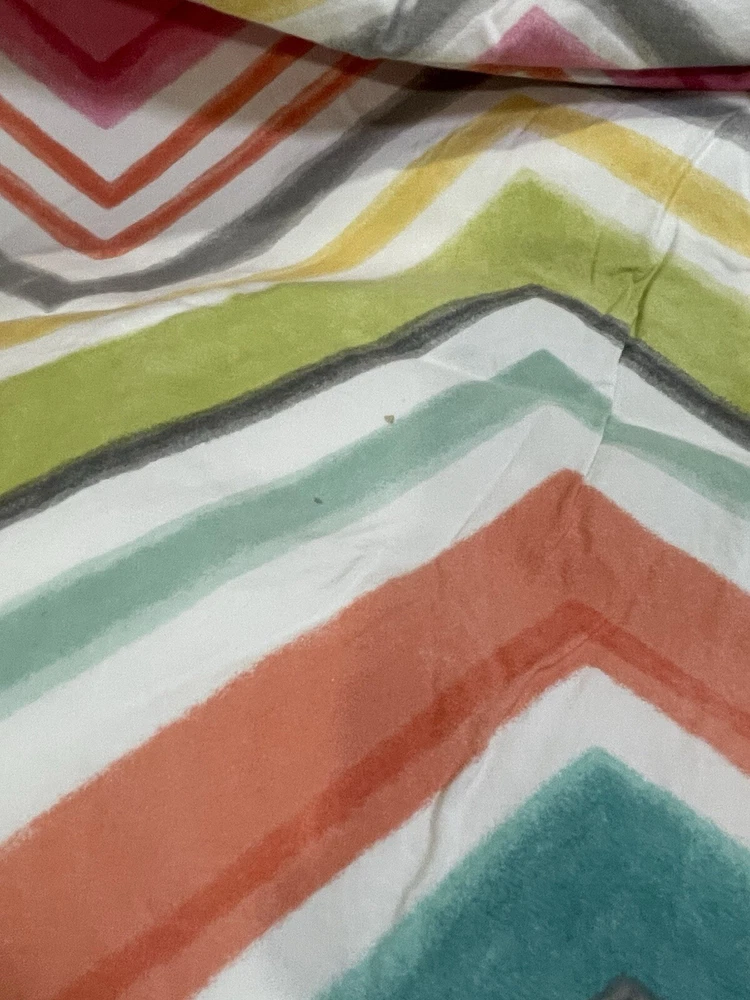 Pottery barn teen Queen/full duvet cover (cover only, no insert) Corner ties, button closure at top 2 matching standard pillow shams Cotton Multicolor, bright, fun, chevron Please see pics; has some issues.