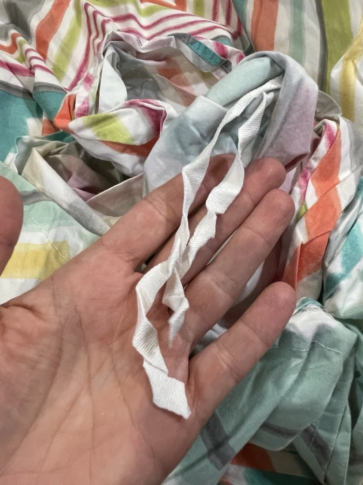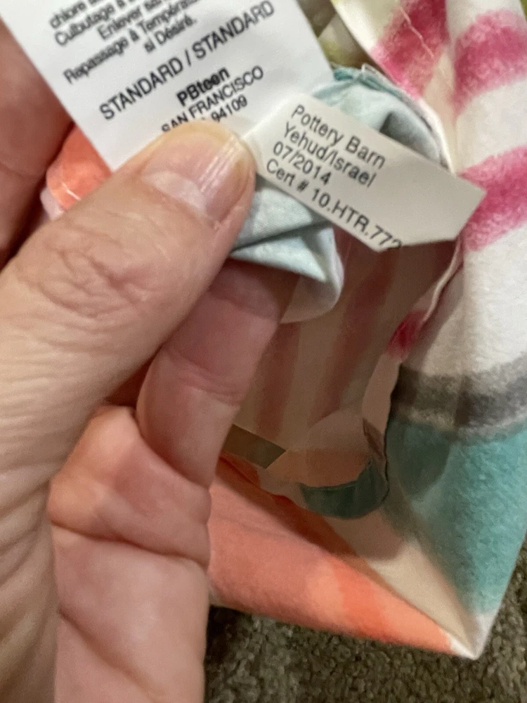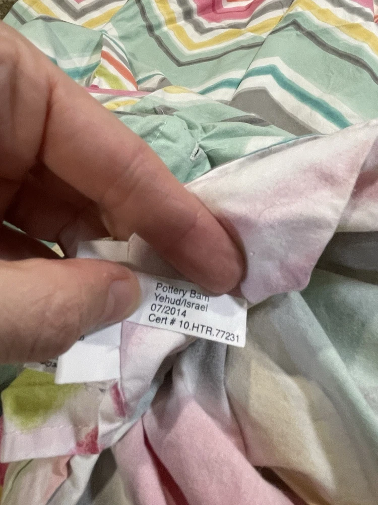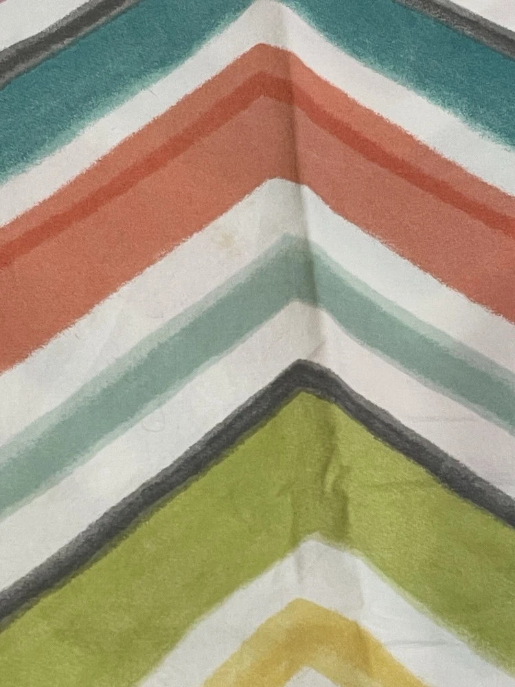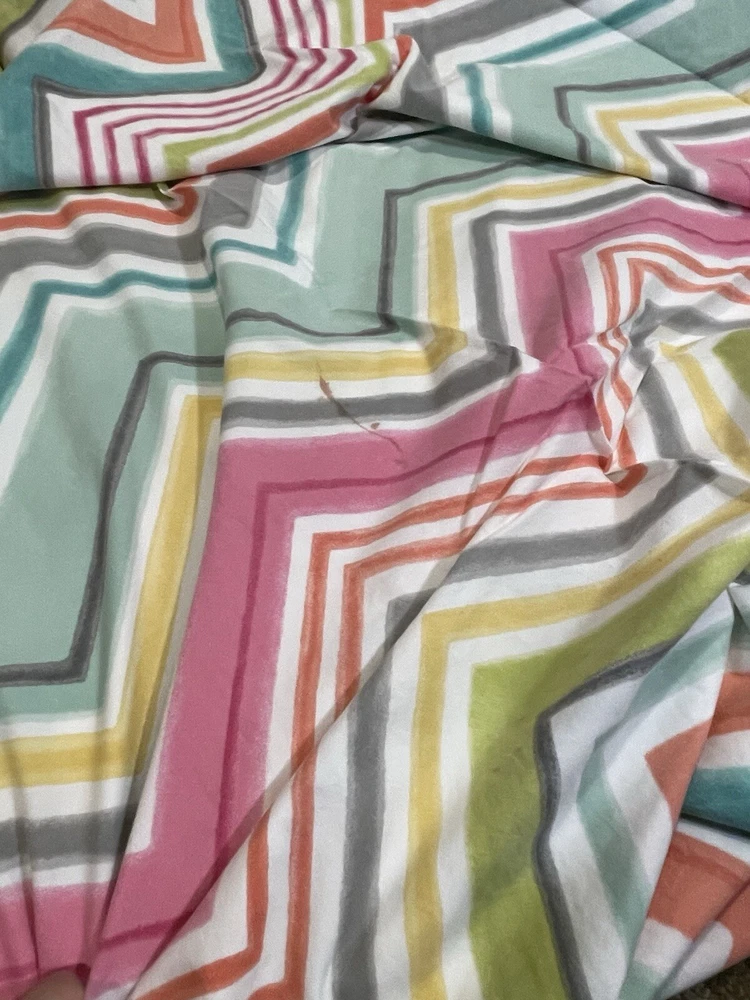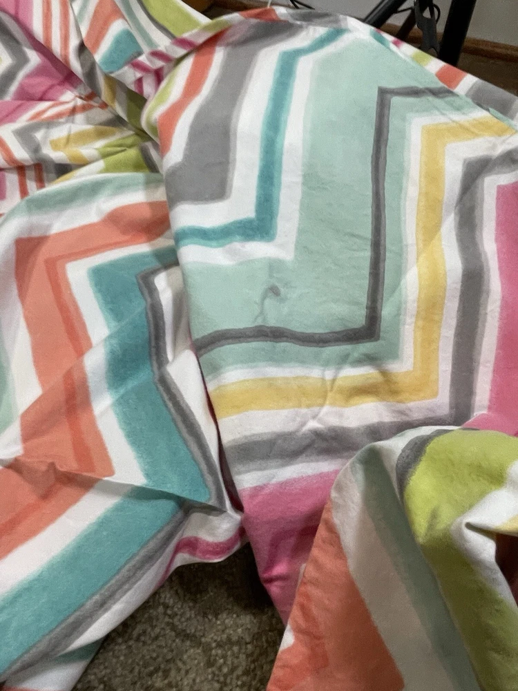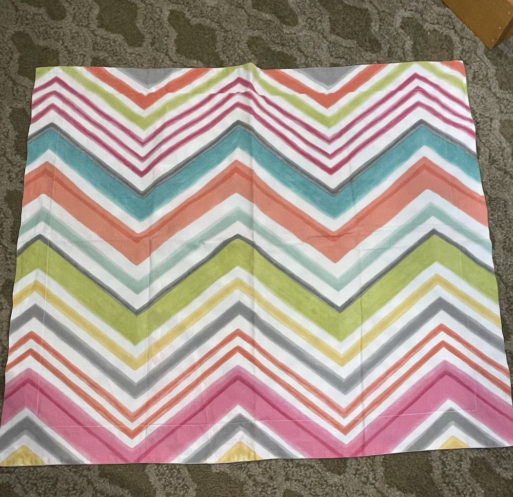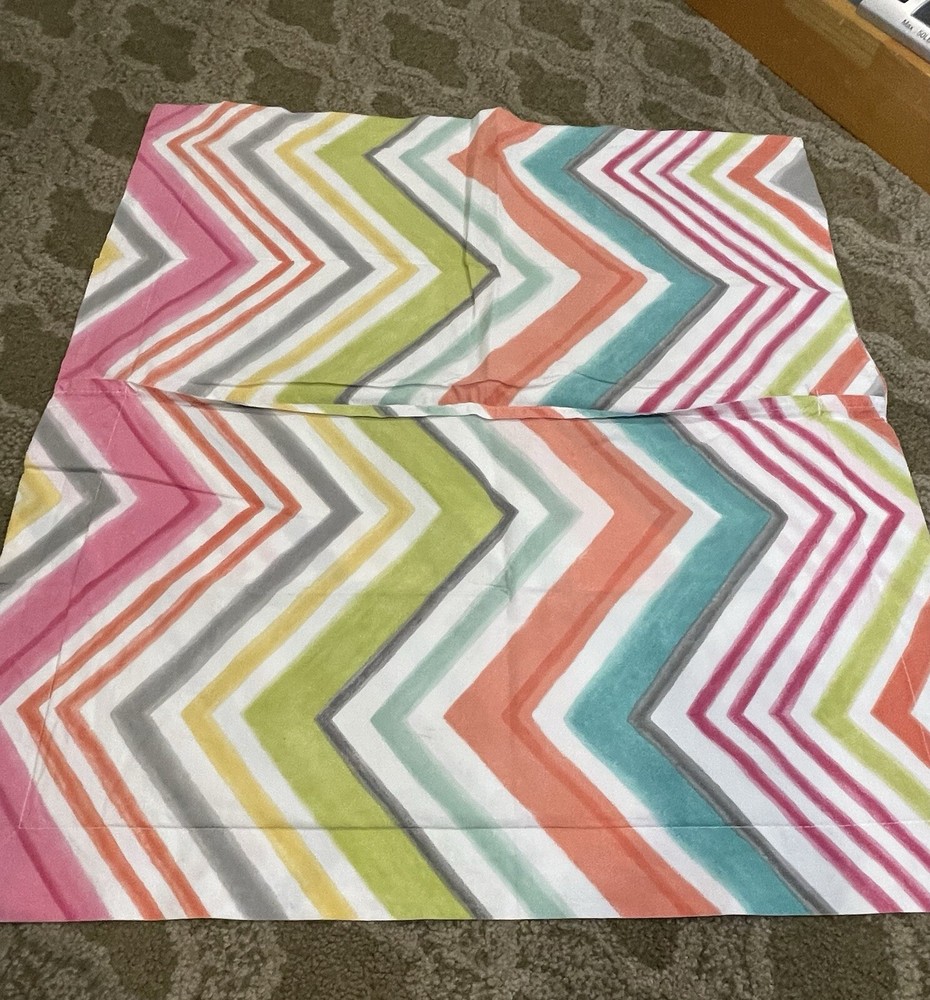 Pottery barn teen Queen/full duvet cover (cover only, no insert) Corner ties, button closure at top 2 matching standard pillow shams Cotton Multicolor, bright, fun, chevron Please see pics; has some issues.