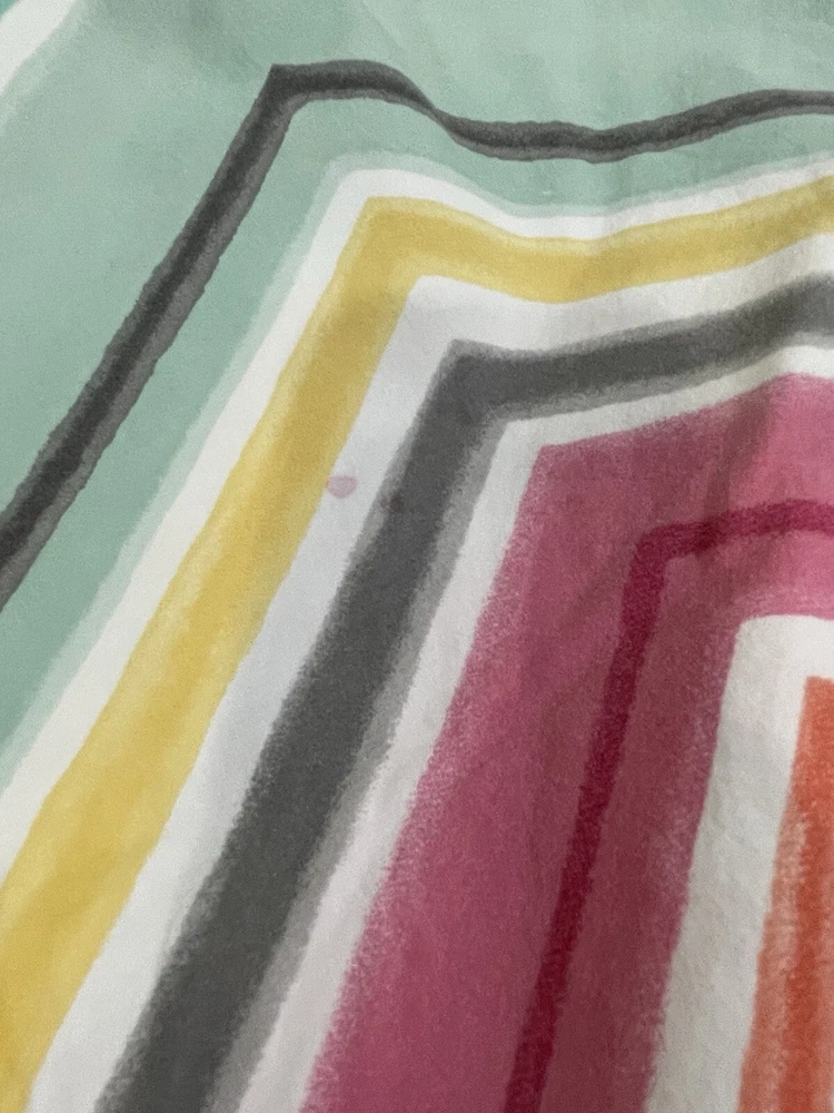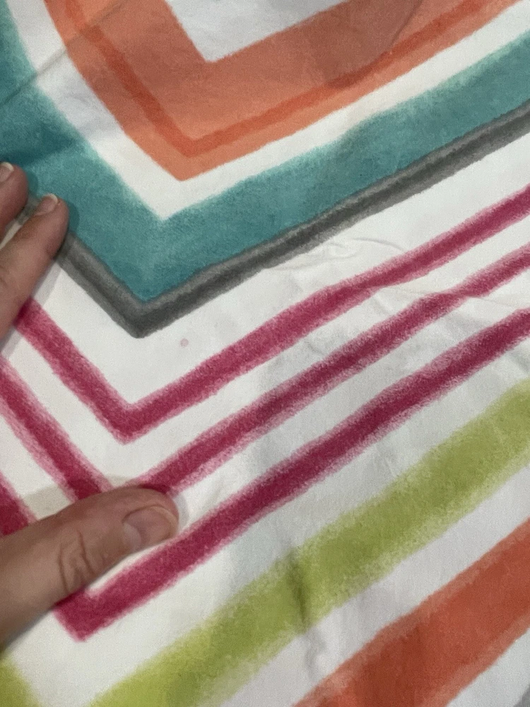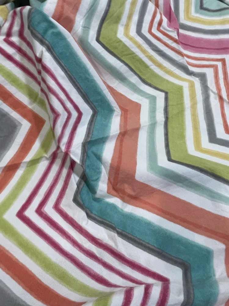 Pottery barn teen Queen/full duvet cover (cover only, no insert) Corner ties, button closure at top 2 matching standard pillow shams Cotton Multicolor, bright, fun, chevron Please see pics; has some i...