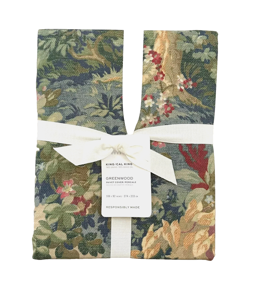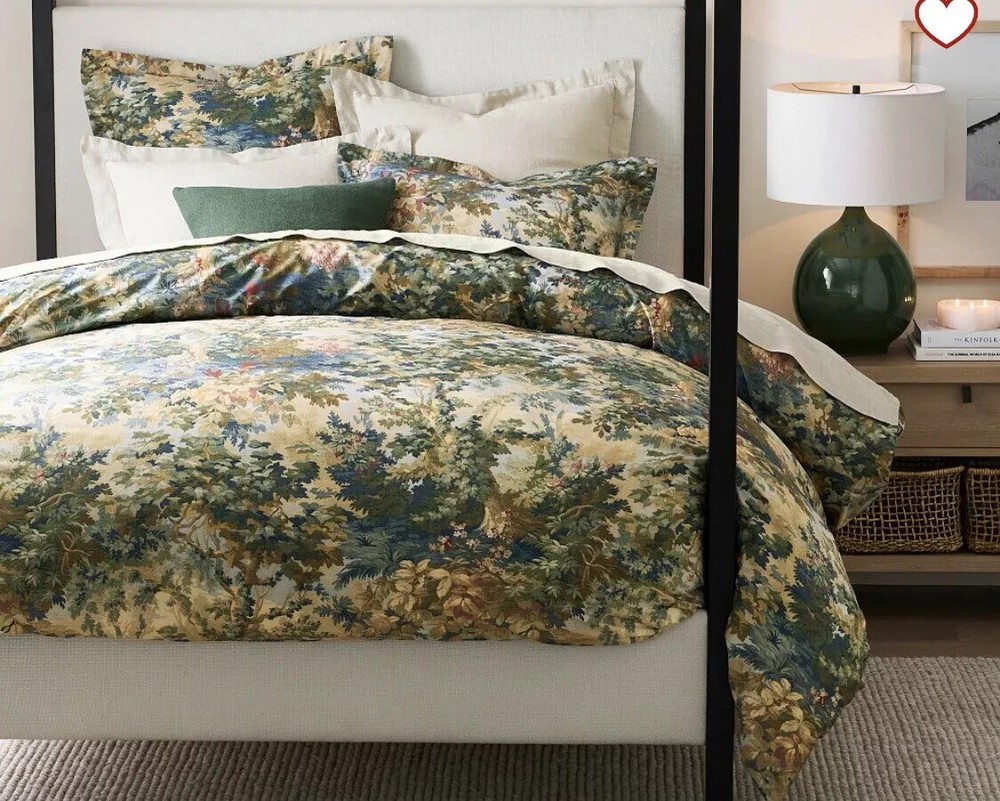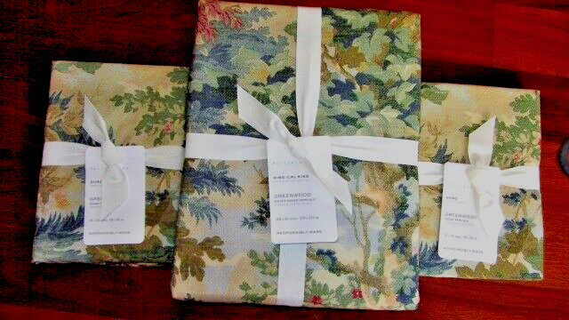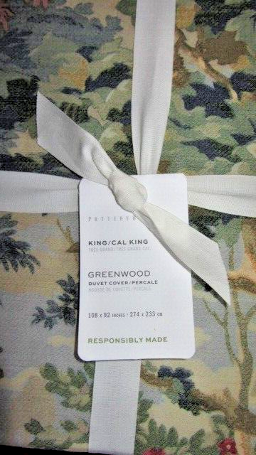 Pottery Barn Greenwood Percale King/California King Duvet & 2 Euro Shams New with Tags PB describes as: A vintage pattern inspired this design, our modern take on traditional toile. With a painterly touch, it brings a lush layer of color to the bedroom. Made of 75% organic cotton and 25% recycled cotton. Duvet features a button closure with inner ties that keep insert in place; sham features an overlap closure. OEKO-TEX® STANDARD 100: tested for 1000+ harmful substances. 14.HUS.42449 HOHENSTEIN HTTI. By choosing our cotton products, you’re supporting our investment in Better Cotton’s mission. This product is sourced via mass balance and therefore may not contain Better Cotton. Inserts are sold separately. Imported. King/California King Duvet: 92" l x 108" Euro Sham: 26" h x 26" w Machine wash in warm; gentle cycle. Only non-chlorine bleach when needed. Tumble dry on low heat; remove promptly. Warm iron, as needed. Pet & Smoke free Ships within 1 business day. Thank you