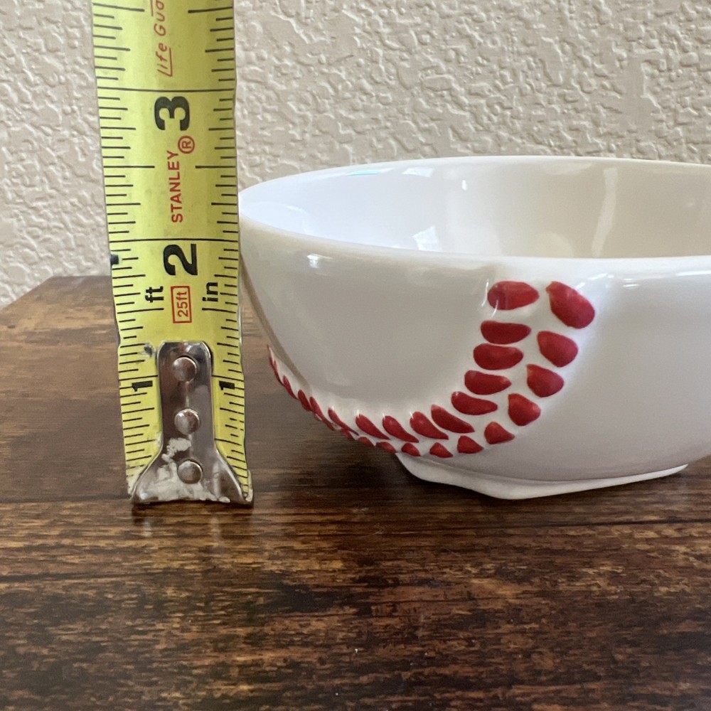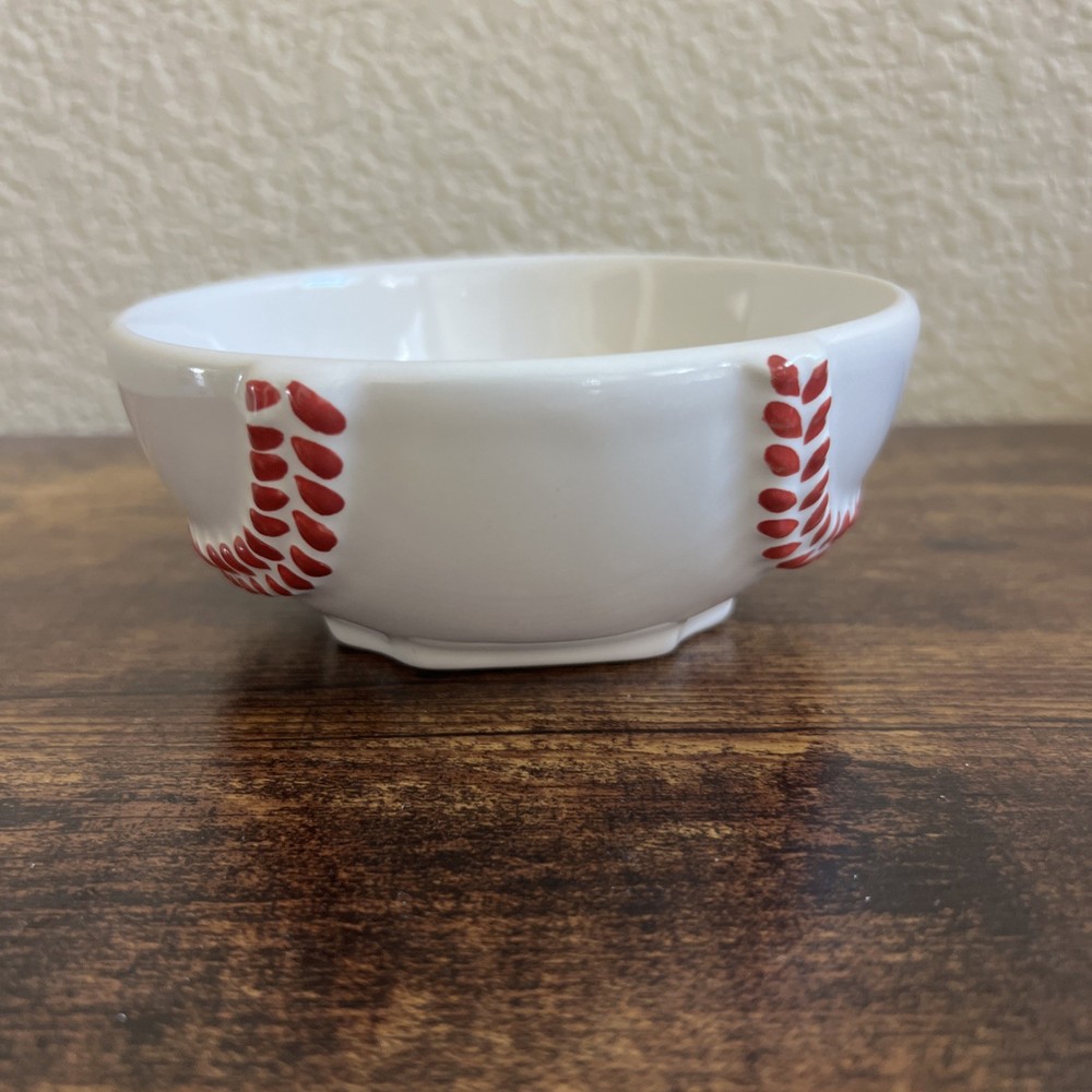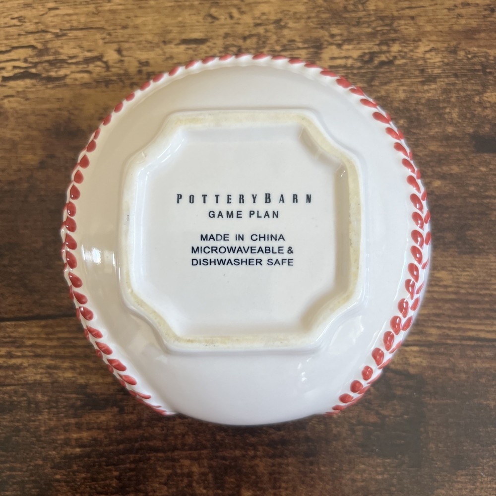 The Pottery Barn Game Plan Baseball Bowl is a stylish and unique addition to any home. Made of ceramic with a round shape and red & white color scheme, this bowl is perfect for serving snacks or salads. Its Game Plan pattern and baseball theme make it a fun and eye-catching piece for any dining table. Imported from China, this bowl combines quality craftsmanship with a playful design, ideal for those who appreciate both style and functionality in their dinnerware. This bowl has no chips or cracks.