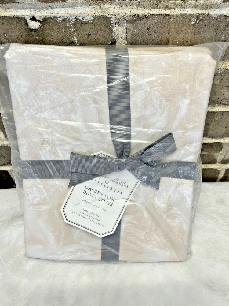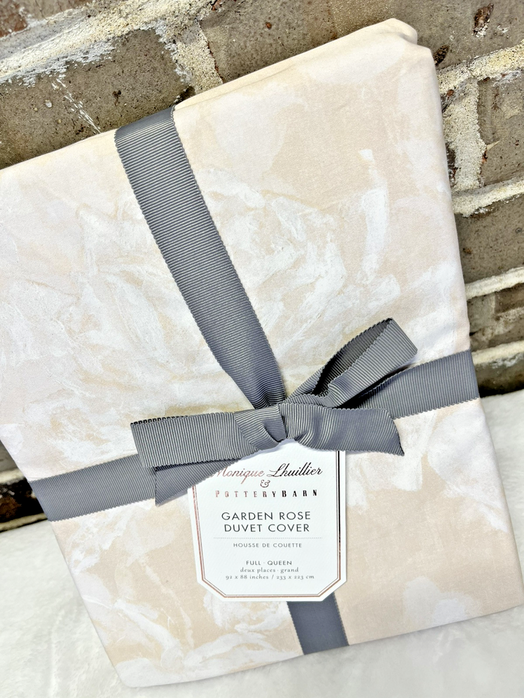 BRAND NEW WITH TAG THIS PATTERN IS GORGEOUS THIS IS THE BLUSH PINK COLOR This duvet retails for $149.00 so getting a Awesome deal here You are getting 1 full/ queen size duvet cover (NO shams). Nothing says elegance like full-blown roses and a shimmering BLUSH PINK hue. Fashion designer Monique Lhuillier blends her sophisticated style and her love of celebration in this collection for Pottery Barn Made of 100% cotton. Features a sateen weave; A sateen weave is a tightly woven weave, which gives the fabric a luxurious sheen while providing supreme softness and ultra durability. Duvet reverses to self. Duvet features a button closure with hidden ties to help keep insert in place Machine wash. Imported.