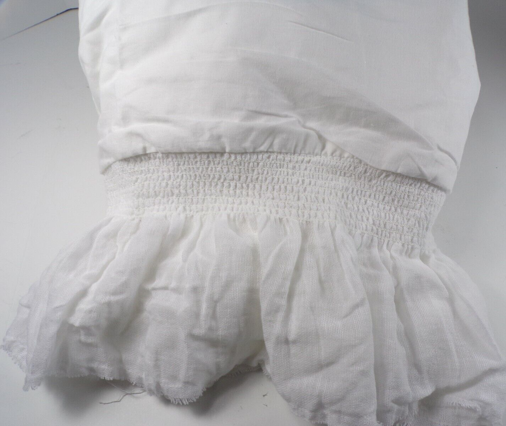 Pottery Barn Gauze Smocked Duvet Cover King White Item is new Auction includes: one duvet Made of 87% cotton, 13% linen. Duvet and sham reverse to solid white. Features a ruffle border. Duvet cover features interior ties and hidden button closure DIMENSIONS Duvet King/Cal. King: 92" long x 108" wide CARE AND MAINTENANCE Machine wash in warm water; gentle cycle. Use only non-chlorine bleach when needed. Tumble dry on low heat; remove promptly. Warm iron as needed.