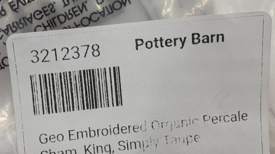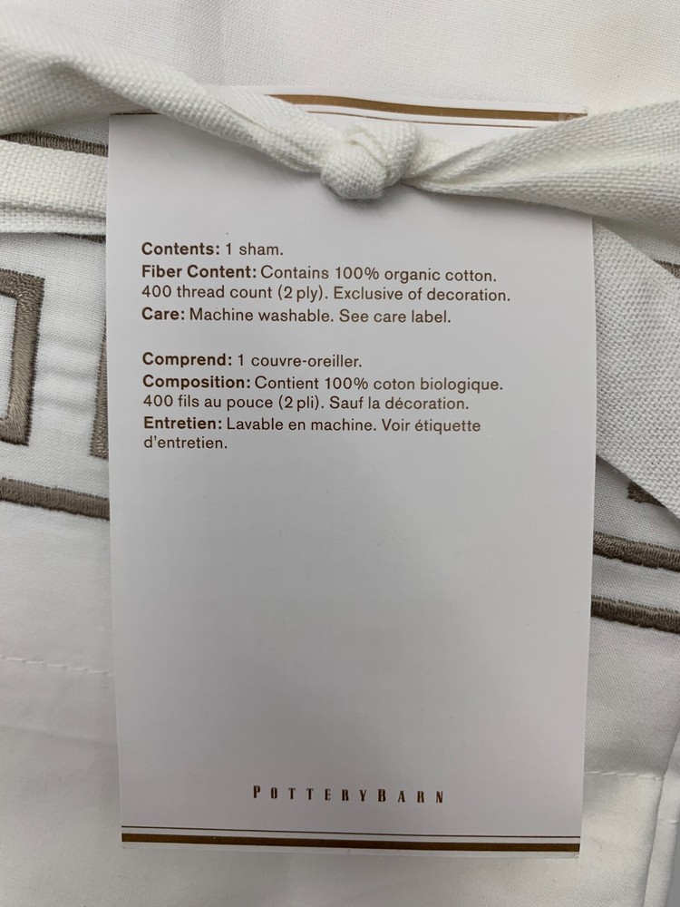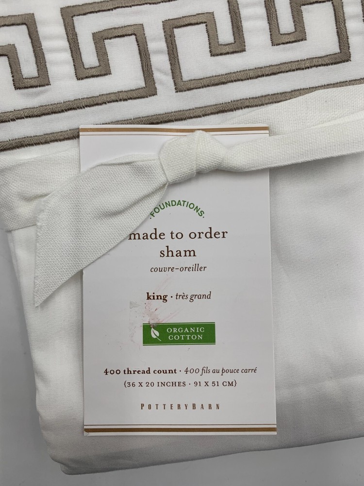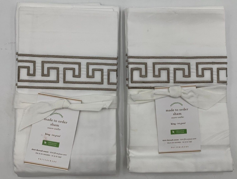 Pottery Barn Geo Embroidered Organic Percale Sham S/2 King Simply Taupe Items are brand new. Auction includes 2 shams. Woven of 100% organic cotton. Sham features an envelope closure. 400-thread count constructed with 2-ply yarns. Sham reverses to solid. Detailed with a satin-stitched embroidery. Imported. DIMENSIONS King: 20" h x 36" w CARE AND MAINTENANCE Machine wash cold; gentle cycle with like colors. Use only non-chlorine bleach if needed. Tumble dry low; remove promptly. Warm iron as needed.