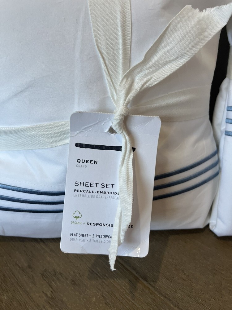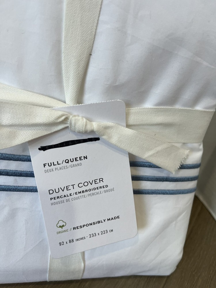 You are purchasing One Pottery Barn Grand Embroidered Duvet Cover and Sheet set in white with chambray embroidery new with tags, paper tags have a black line through the PB name Size is full/Queen on ...