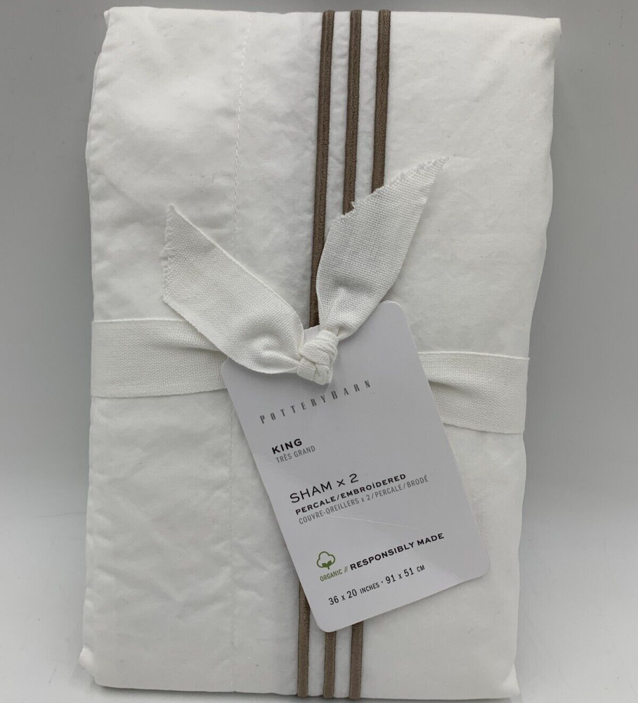 Pottery Barn Grand Organic Percale Embroidered Sham Items are brand new Auction includes: 2 shams PRODUCT DETAILS CONSTRUCTON: Made of 100% organic cotton percale. Sham has an envelope closure. Reverses to solid. 400-thread count constructed of 2-ply yarns. Shams sold in sets of 2. Sham and insert sold separately. Imported. Standard Sham: 20" h x 26" w Euro Sham: 26" sq King Sham : 20" h x 36" w Flange: 2" CARE: Machine wash in warm water; gentle cycle. Only non-chlorine bleach when needed. Tumble dry on low heat; remove promptly. Warm iron as needed.