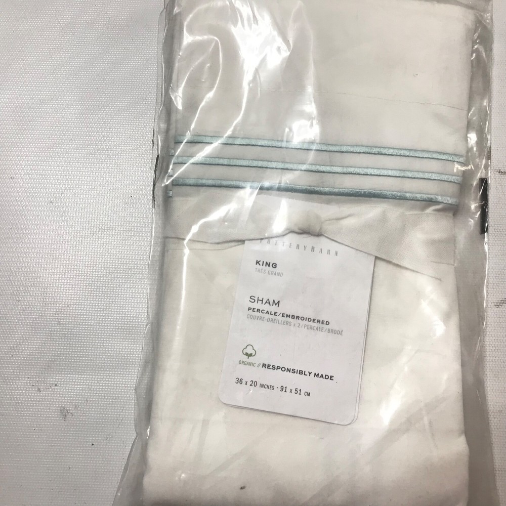 Pottery Barn Grand Percale Embroidered White/Green Blue KING Sham 36x20” New P8 EPF Packaging has stains.See pics.Item is intact.