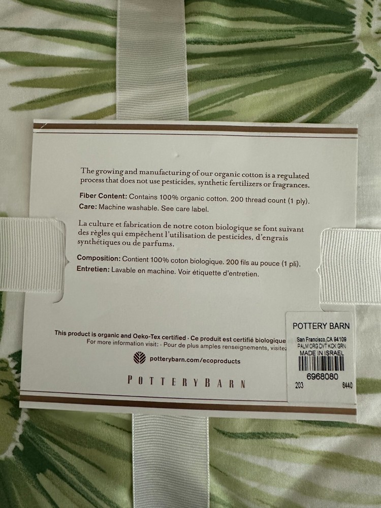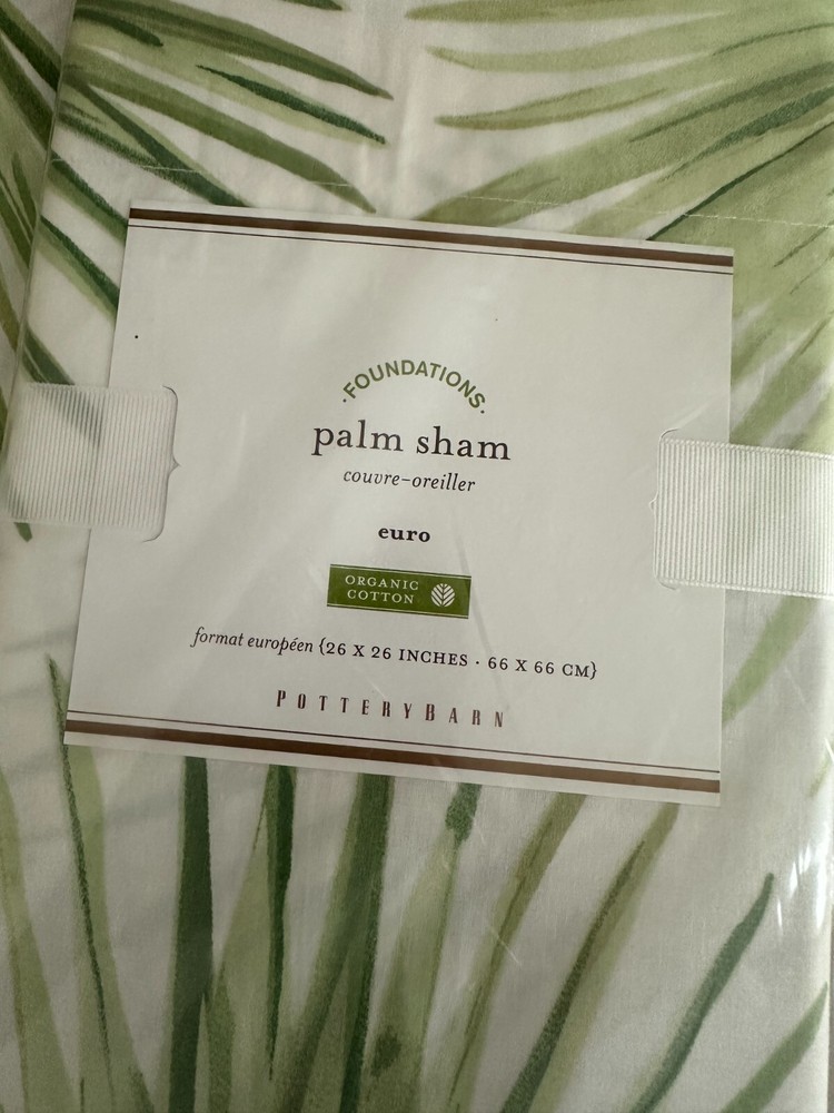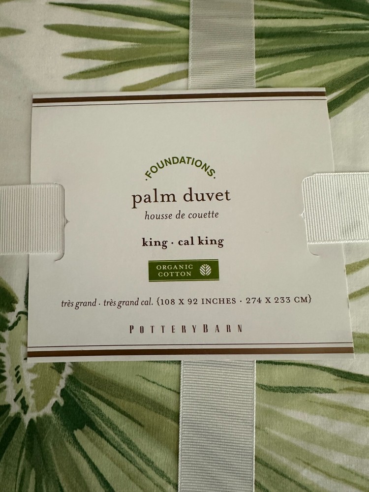 NEW 3 Piece - Pottery Barn Green Palm Frond Palmetto King/Cal King Duvet Cover with (2) Euro Shams Duvet measures 108" x 92" Euro Shams measure 26" x 26" One sham is not in the original packaging. Items from smoke free/pet free home.