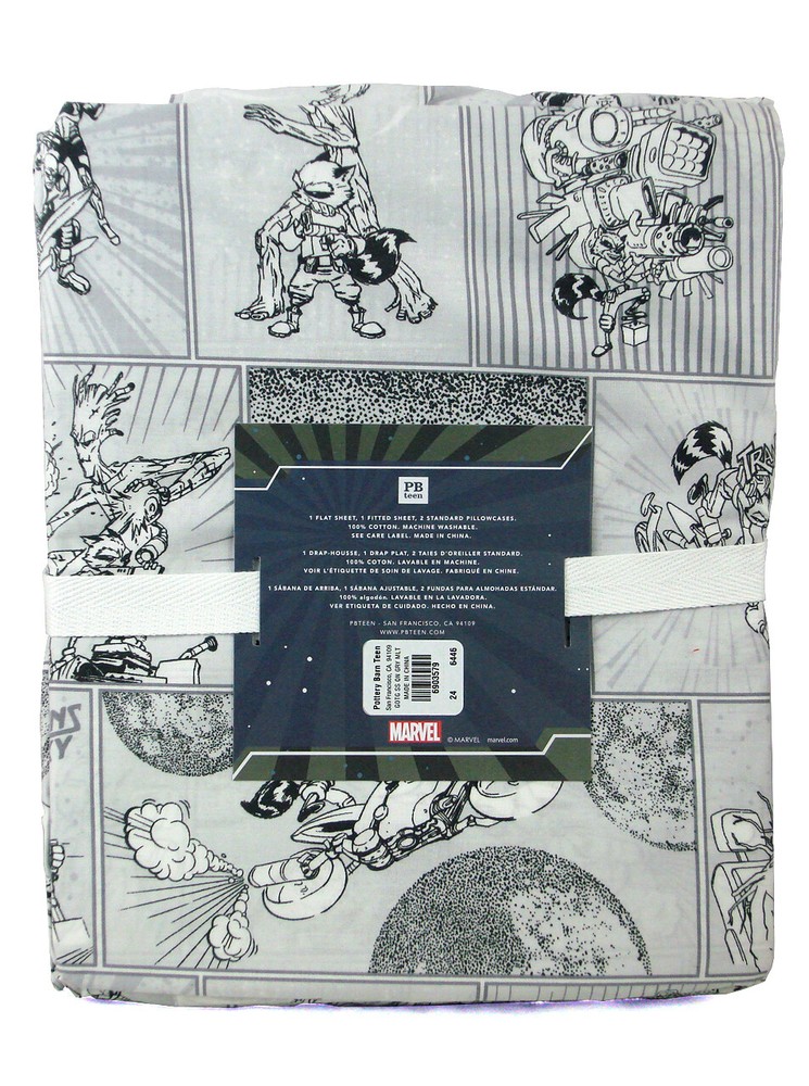 Marvel Comics POTTERY BARN GUARDIANS OF THE GALAXY SHEET SET Queen Size Brand New! Marvel Comics Pottery Barn Kids Guardians Of The Galaxy Sheet Set from 2015. Queen Size . Marvel Comics Pottery Barn Exclusive Guardians Of the Galaxy Bedding Sheet Set. Includes 1 flat sheet, 1 fitted sheet, and 1 standard pillowcase. Featuring a light grey/white sheet set with multiple Groot and Rocket Raccoon comic book panel illustrations. Give your sleep space a cinematic update with sheets featuring favorite characters from Marvel's Guardians of The Galaxy. Thoughtfully woven from pure organic cotton and Oeko-Tex certified, your bed will be as safe as it is soft. Easy care finish ensures that Pottery Barn Marvel bedding emerges smooth and soft from the dryer. Comes to you brand new. Check out our other auctions for more rare Marvel items and collectibles! Features: Dimensions: -One Flat Sheet: 96" wide x 104" long -One Fitted Sheet: 60" wide x 80" long (fits mattresses up to 12" deep) -Two Standard Pillowcase: 30" wide x 20" high -100% organic cotton percale. -Oeko-Tex Certified, which guarantees that the material has been processed without harmful chemicals or dyes. -Certified GOTS (global organic textile standards), which ensures that the material is organic in both raw fiber and finished product. It also ensures that the quality is higher. -200-Thread count. -Fitted sheet has universal elastic (elastic around the entire edge) for a snug, secure fit. -Pillowcase features an inner envelope closure to hold the pillow neatly in place. -Machine washable. We like to ship USPS Priority Mail. If you have won a single item and the shipping is calculated feel free to proceed to checkout. If you have won multiple items please await our invoice for a combined total IF APPLICABLE. Any questions feel free to contact. All items are shipped with extreme care. We prefer PayPal. Serious bidders!! Happy Bidding!!! Payment must be received within 10 days of auctions close. Items will ship within 6 business days of receipt of payment. BIDDING POLICY COMBINING ORDERS : We will gladly combine orders if you follow the guidelines below: Please wait until you have finished purchasing all of the auctions that you are interested in before sending payment. Orders cannot be combined after they have been paid for. There are no exceptions. When you go to checkout to request a total after you have made all of your purchases, Boondock Collectibles will combine your orders and apply shipping discounts based on the actual weight and/or size of the parcel. On combined orders, Please note that not all items can be combined. Most if not all Full Size Statues and larger items alike cannot be combined and must ship separately due to their size. Please email with any questions. RETURN POLICY : We guarantee that your item will arrive as stated in the auction. We only accept returns on defective or 'not as advertised' items. We do not offer returns on buyer's remorse purchases. There are NO RETURNS on Original Artwork and One-Of-A-Kind items. Please be sure that you completely understand what you are bidding on before committing to the purchase. We have found through experience that an informed buyer is usually a happy buyer. We welcome any questions that might assist you in selecting the right item for you. If an item arrives defective or 'not as advertised', the bidder/buyer must initiate contact within 5 days of having received the item. We will determine the best method for resolving the issue and return contact in a timely manner. Once a return has been authorized by Boondock Collectibles, the bidder/buyer has 10 days to return the item. If there is a problem with your purchase let us know and we will work to remedy the issue. If it is our fault, we'll fix it. Our goal is to propagate trust in on-line trading. Some of our best online transactions have been those where a customer has allowed us to fix our mistake and make it right. INTERNATIONAL SHIPPING POLICY : At Boondock Collectibles, we love our international customers. We recognize the magnificent benefit of being able to trade with just about anyone in the world, almost anywhere in the world. Of course, with international transactions come certain difficulties. Many sellers refuse to conduct business internationally because they feel that it is not as secure as domestic business. We have found that to be untrue. We believe that people are basically good regardless of geography. Please keep the following international transaction factors in mind before you bid: We can only ship USPS Express Mail International. We recognize this is expensive however it is the most efficient and safest way for us to get the item to you. Very rarely are there customs delays with this shipping method. In some rare cases delivery may get delayed and it will likely take longer to receive your item. If your local Customs does decide to hold a package you can expect delivery to take 3-4 weeks. If you have not received a package within 30 days of our shipment, please notify us and we'll issue an inquiry and get you taken care of. In most if not all cases Express Mail takes between 5-10 days from the time we ship your item. Boondock Collectibles will need to accurately declare all of its international orders with their full value. Marking our merchandise as a gift on a customs form puts us at an unnecessary risk. Ebay members with 10 feedback or less are required to contact Boondock Collectibles prior placing any bid or ultimately risk a bid retraction. Boondock Collectibles reserves the right to cancel, block, or not honor any questionable bids placed on our items. INTERNATIONAL BUYERS PLEASE NOTE Import duties, taxes and charges are NOT INCLUDED in the item price or shipping charges. These charges are the buyer's responsibility and these duties are imposed by your customs office and governmental agency. Please check with your country's custo ms office to determine what these additional costs will be prior