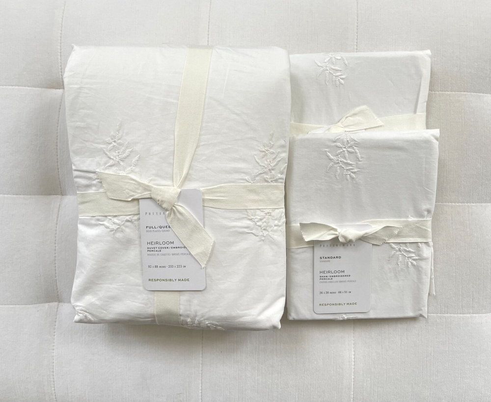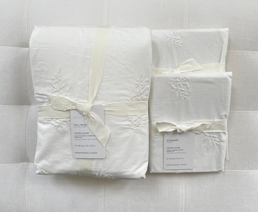 Pottery Barn Heirloom Embroidered Duvet Cover Full /Queen & 2 Standard Shams ~White~ New with Tags PB describes as: Made from 100% cotton. Reverses to same. By choosing our cotton products, you’re supporting our investment in Better Cotton’s mission. This product is sourced via mass balance and therefore may not contain Better Cotton. Duvet features a button closure with inner ties that keep insert in place; sham features an envelope closure. Inserts are sold separately. Imported. Wash before 1st use. Machine wash in warm water separately on gentle cycle. Use only non-chlorine bleach, if needed. Tumble dry on a low; remove promptly. Warm iron as needed. Full/Queen Duvet Cover: 92" l x 88" w Standard Sham: 20" w x 26" l Pet & Smoke free Ships within 1 business day Thank you!