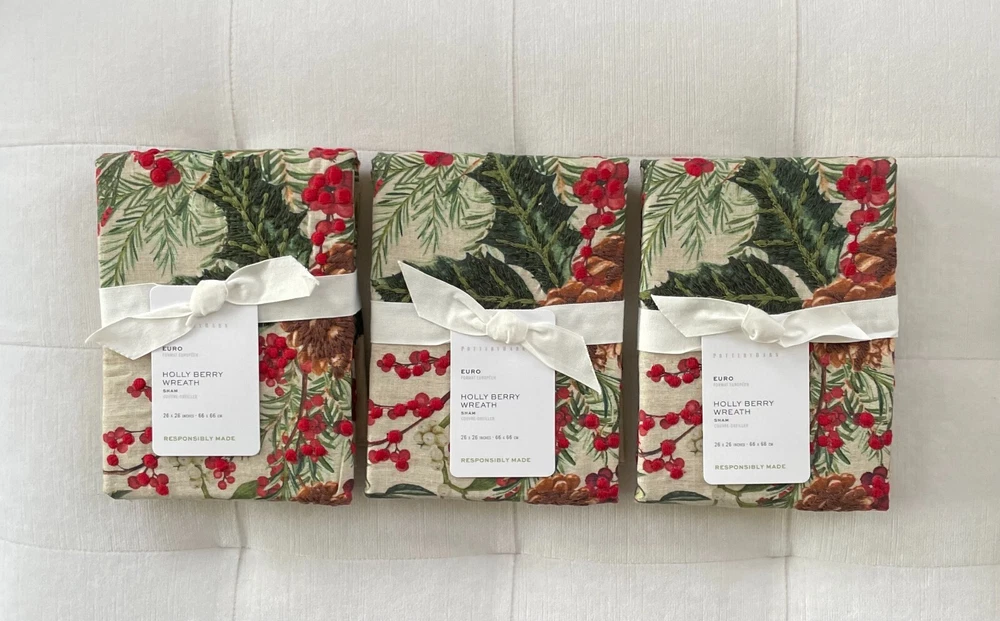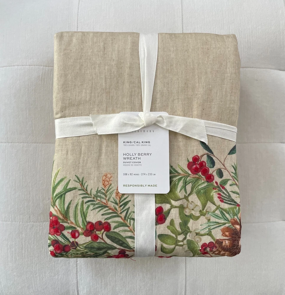 Pottery Barn Holly Berry Duvet King/California King & 3 Three Euro Shams New with Tags PB describes as: Fragrant pine branches and verdant holly leaves dotted with bright red berries: You can always count on these are defining symbols of the season to set a festive scene. Our bedding is framed with a holiday garland and decorated with embroidered details that make the artwork pop. Material: Made from 85% cotton and 15% linen. Reverses to 100% cotton. Secure Design: Duvet features a hidden button closure with inner ties that keep insert in place; sham features an envelope closure. Certification and Standards: By choosing our cotton products, you’re supporting our investment in Better Cotton’s mission. This product is sourced via mass balance and therefore may not contain Better Cotton. Place of Manufacture: Imported. Machine wash in warm water; gentle cycle. Use only non-chlorine bleach, if needed. Tumble dry on low; remove promptly. Warm iron as needed. King/Cal. King Duvet: 92" l x 108" w Euro Shams: 26" sq Pet & Smoke free Ships within 1 business day Thank you