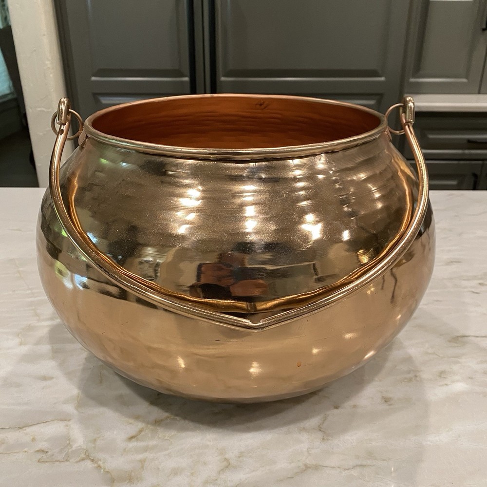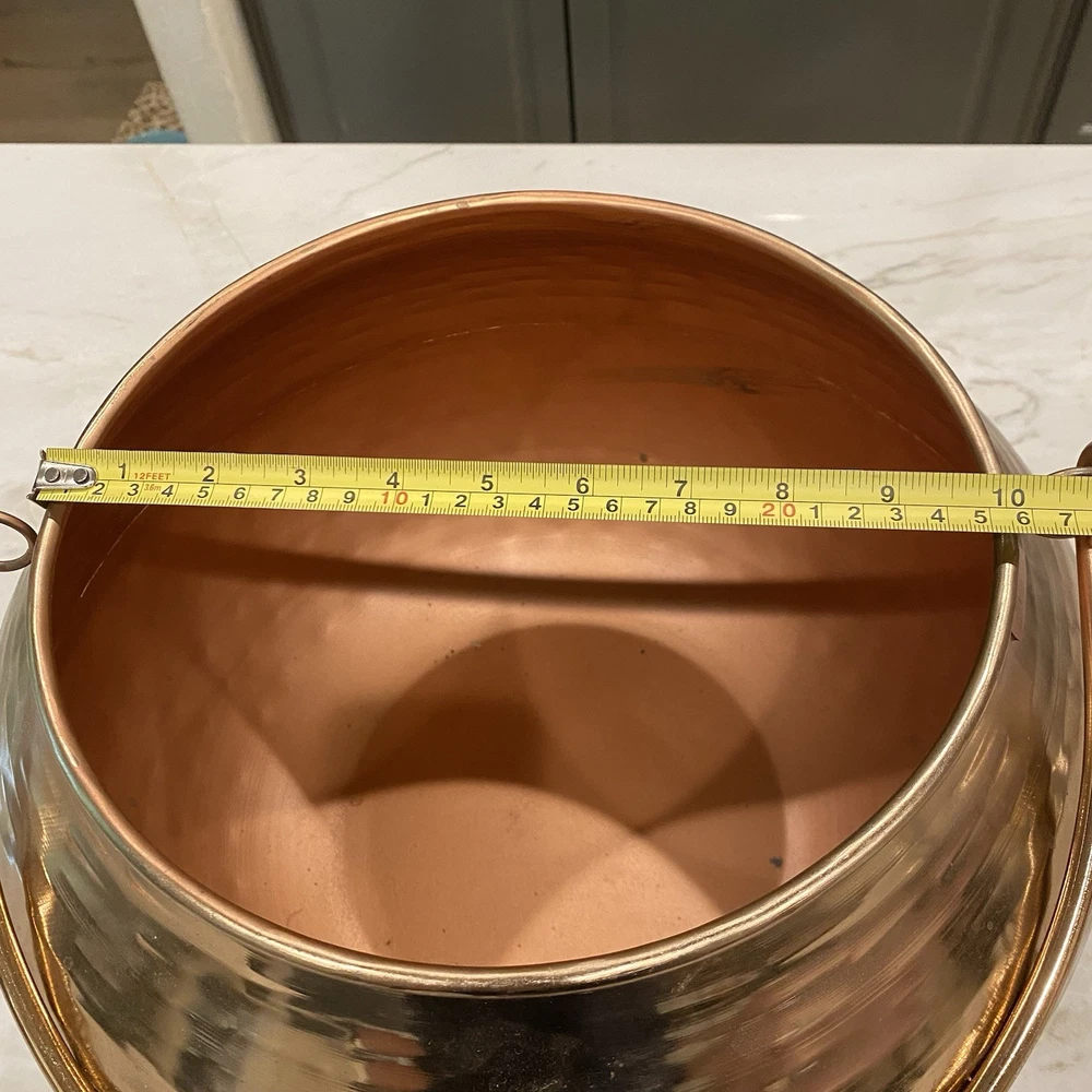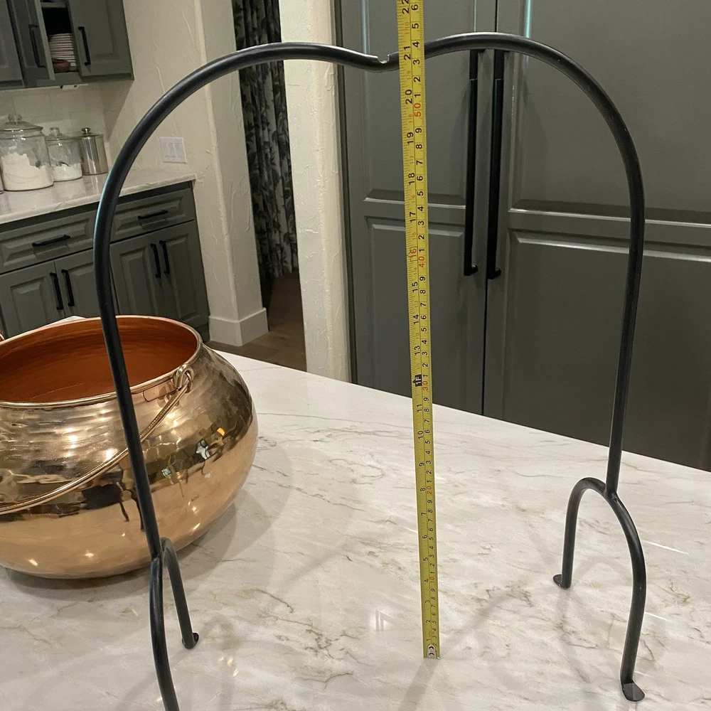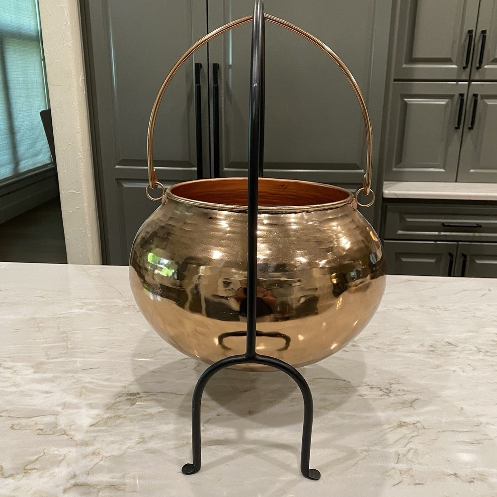 Pottery Barn Halloween Copper Candy Cauldron with Stand Serving Rare Server. Frame measures 21” tall and 16” wide. Cauldron has a 10” diameter opening and 15” at its widest point. Hangs by the handle or you could get an S hook for it to hang horizontally (not included). There are some scratches and wear (see pics) Overall great condition. Great for candy on Halloween, or as a planter in a porch!