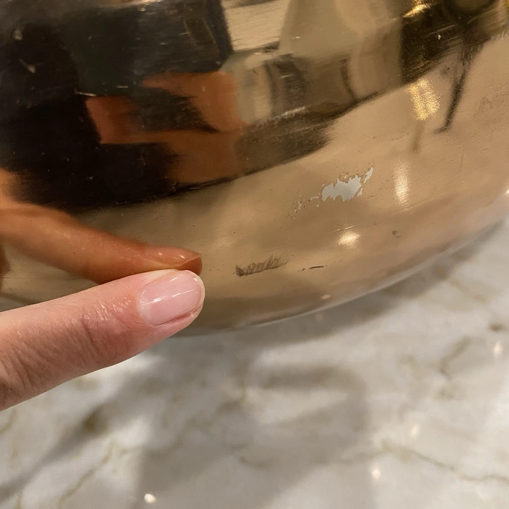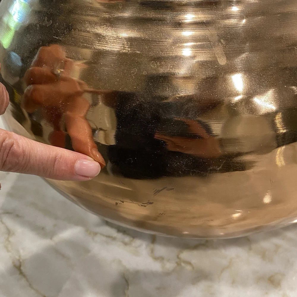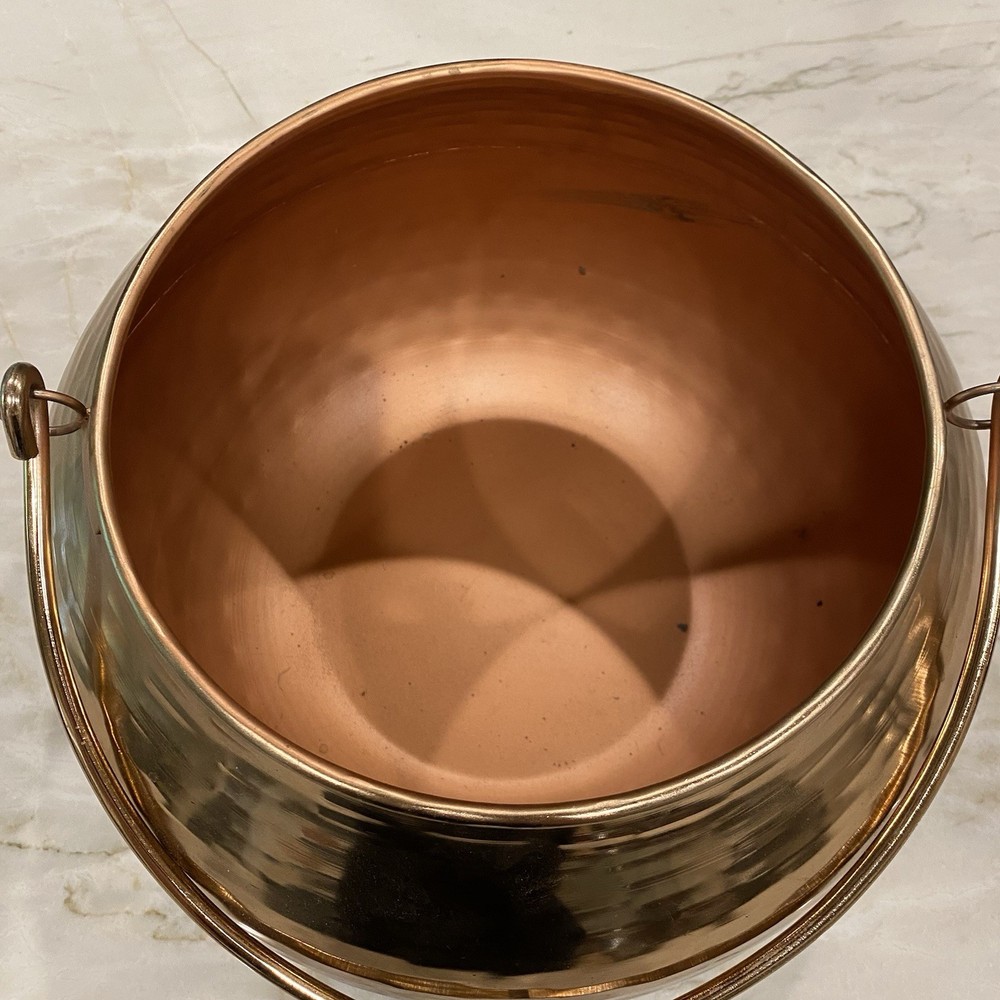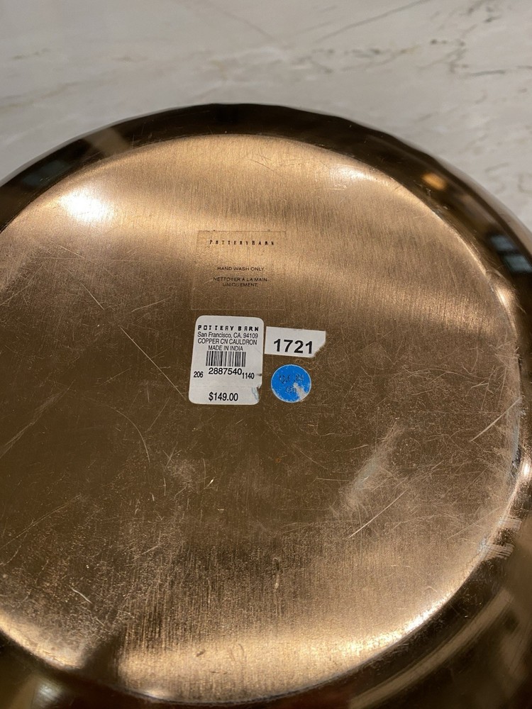 Pottery Barn Halloween Copper Candy Cauldron with Stand Serving Rare Server. Frame measures 21” tall and 16” wide. Cauldron has a 10” diameter opening and 15” at its widest point. Hangs by the handle or you could get an S hook for it to hang horizontally (not included). There are some scratches and wear (see pics) Overall great condition. Great for candy on Halloween, or as a planter in a porch!
