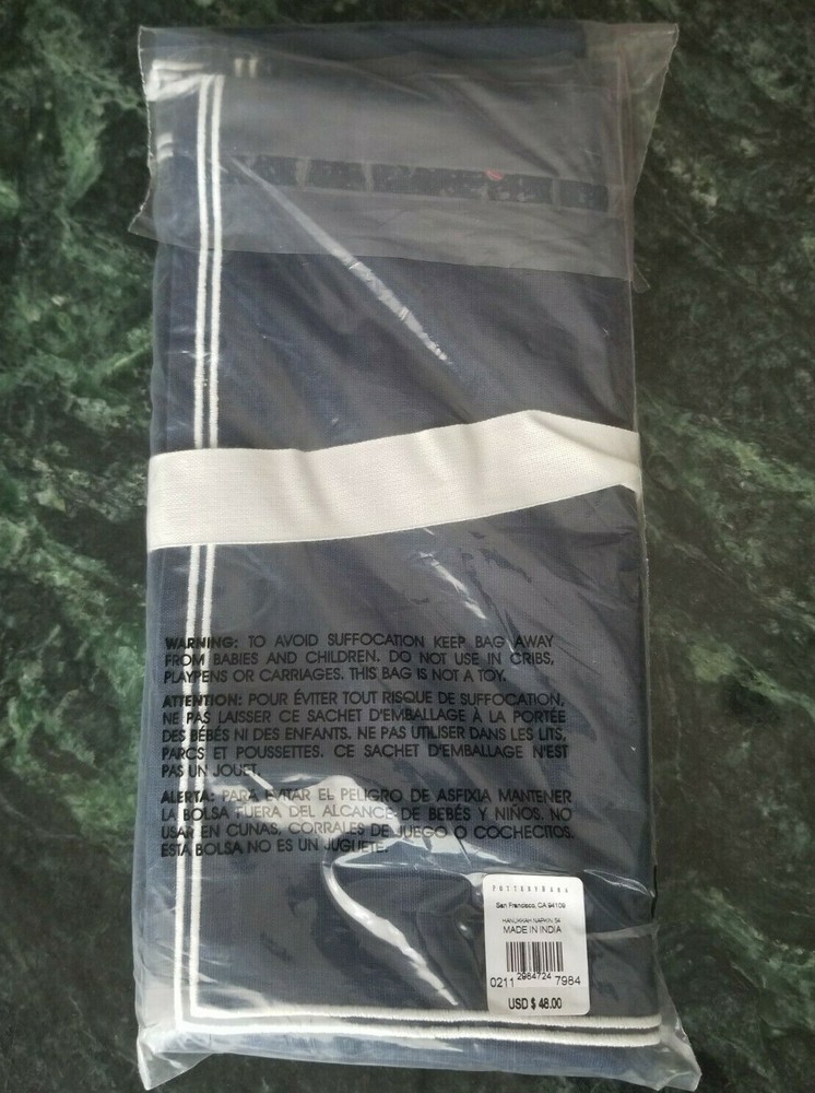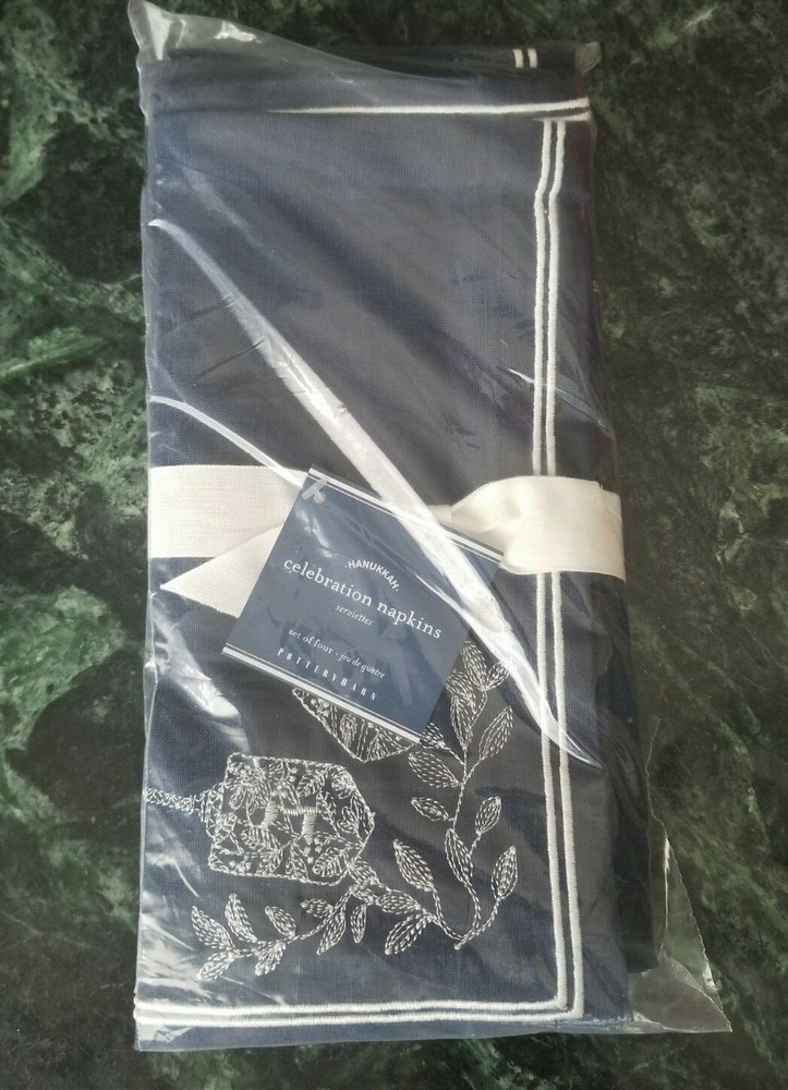 Pottery Barn Hanukkah Celebration Napkins Retail $48 NEW Free Shipping Beautiful for the holidays. Pottery Barn Hanukkah napkins set of four. 4 napkins, Deep-blue napkins, finished with white embroidered motifs. Front is made of 85% cotton and 15% linen. Reverse is 100% cotton. Features white border with floral embroidery. Imported. Overall: 20" square Machine wash cold water, gentle cycle, Tumble dry on low heat; Warm iron as needed. Please look at photos for more description. See Pottery Barn website for more info. New Stock. Smoke-free. Free Shipping in the Continental USA only. Thank you!
