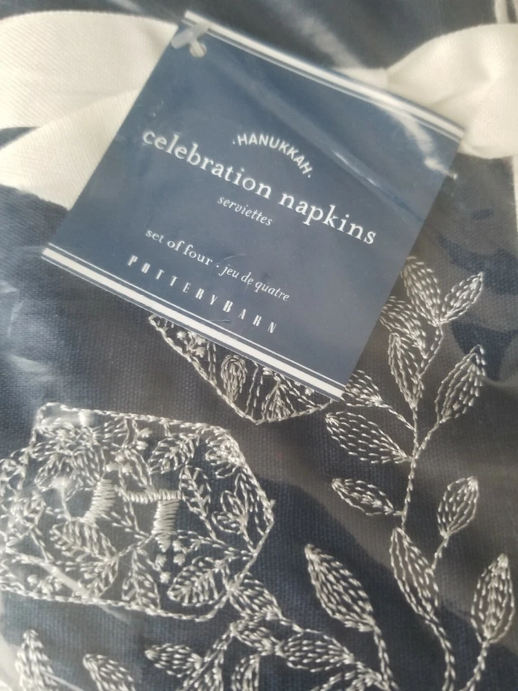 These Pottery Barn Hanukkah napkins are absolutely stunning—the deep blue and crisp white embroidery make them perfect for holiday gatherings. The cotton-linen blend feels luxurious, and the floral details add an elegant touch. They wash well and hold up beautifully. A great festive upgrade for your table setting!