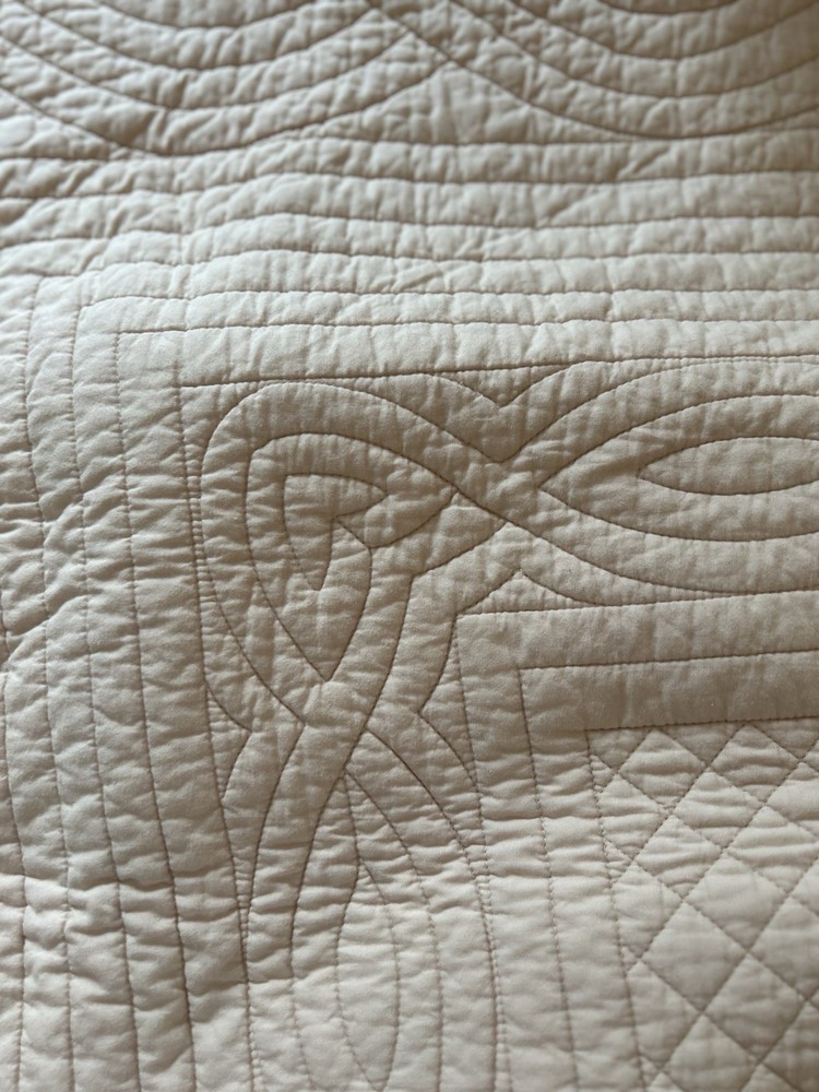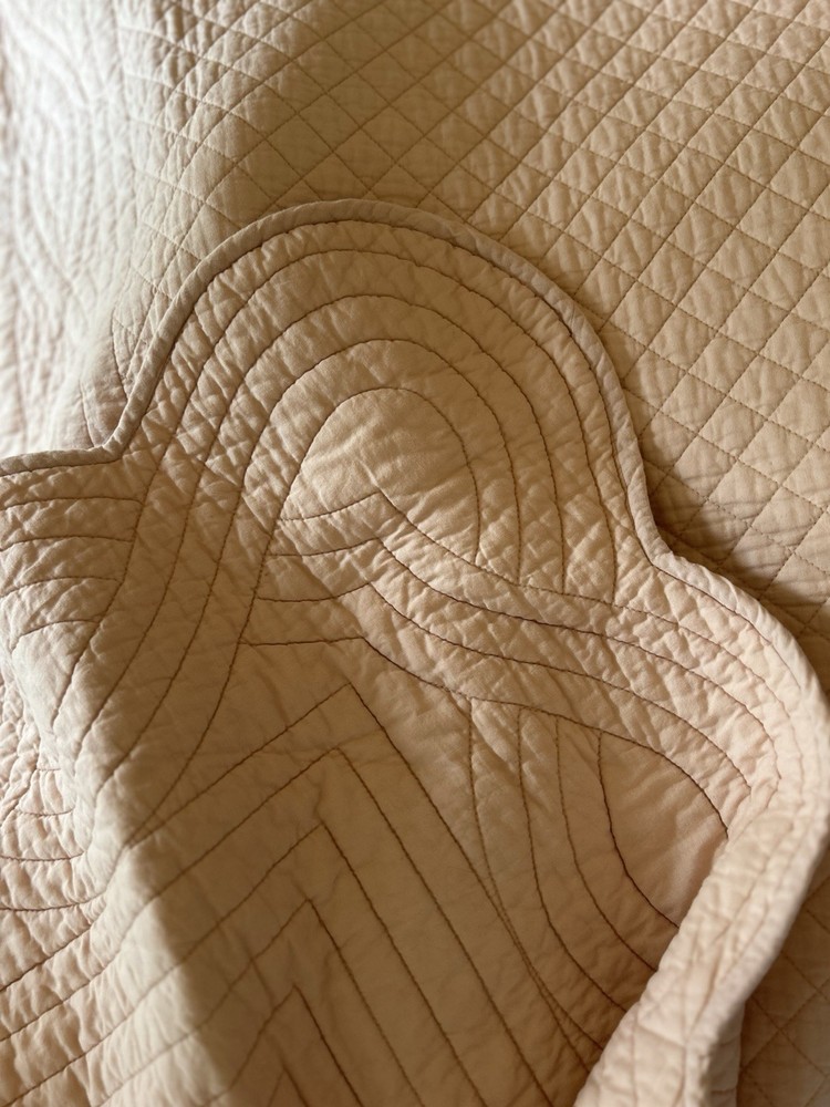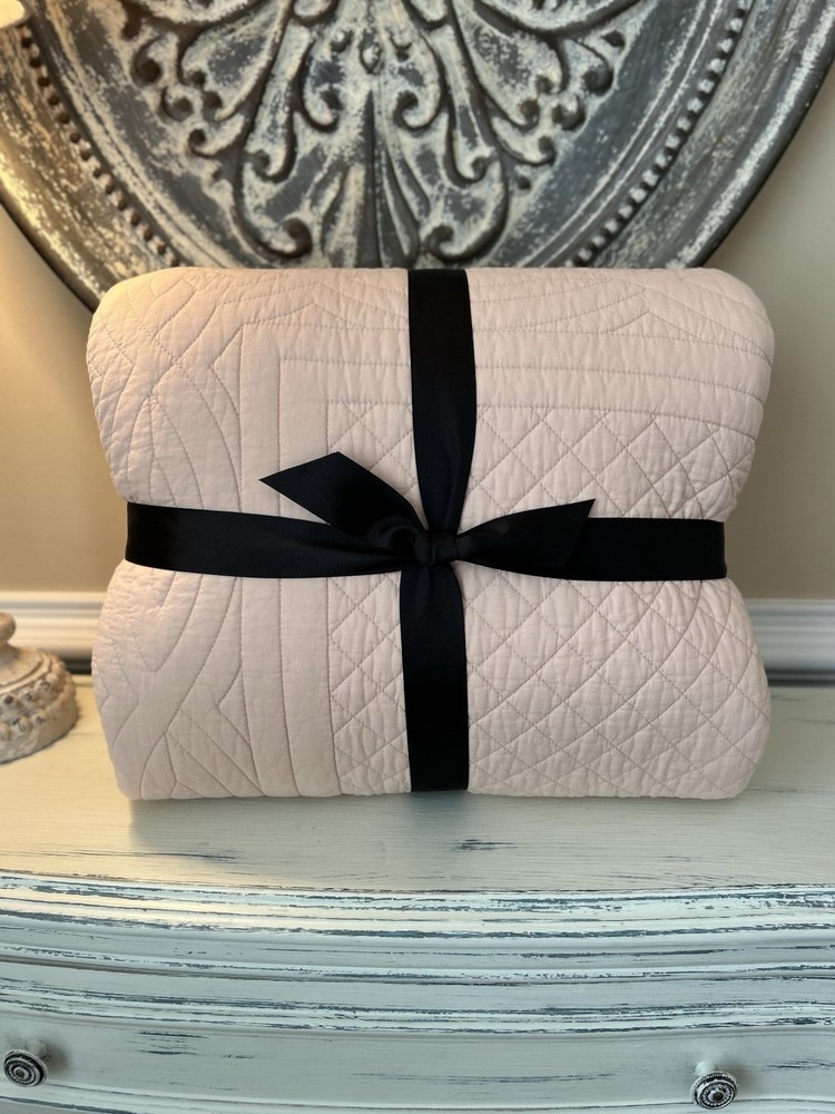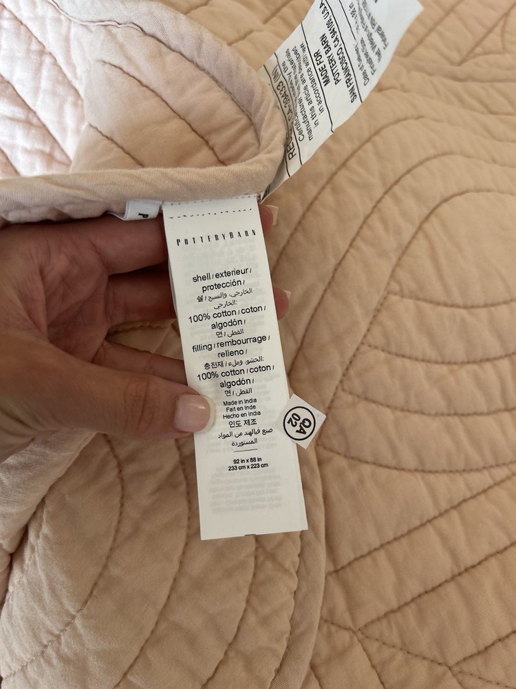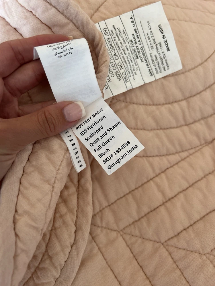 Pottery Barn Heirloom Scallop FULL/QUEEN Quilt Blush PRE-OWNED READ Pre-owned, there are small little holes in one spot of the quilt located on the front, please reference all photos! - Size full/queen in the color blush