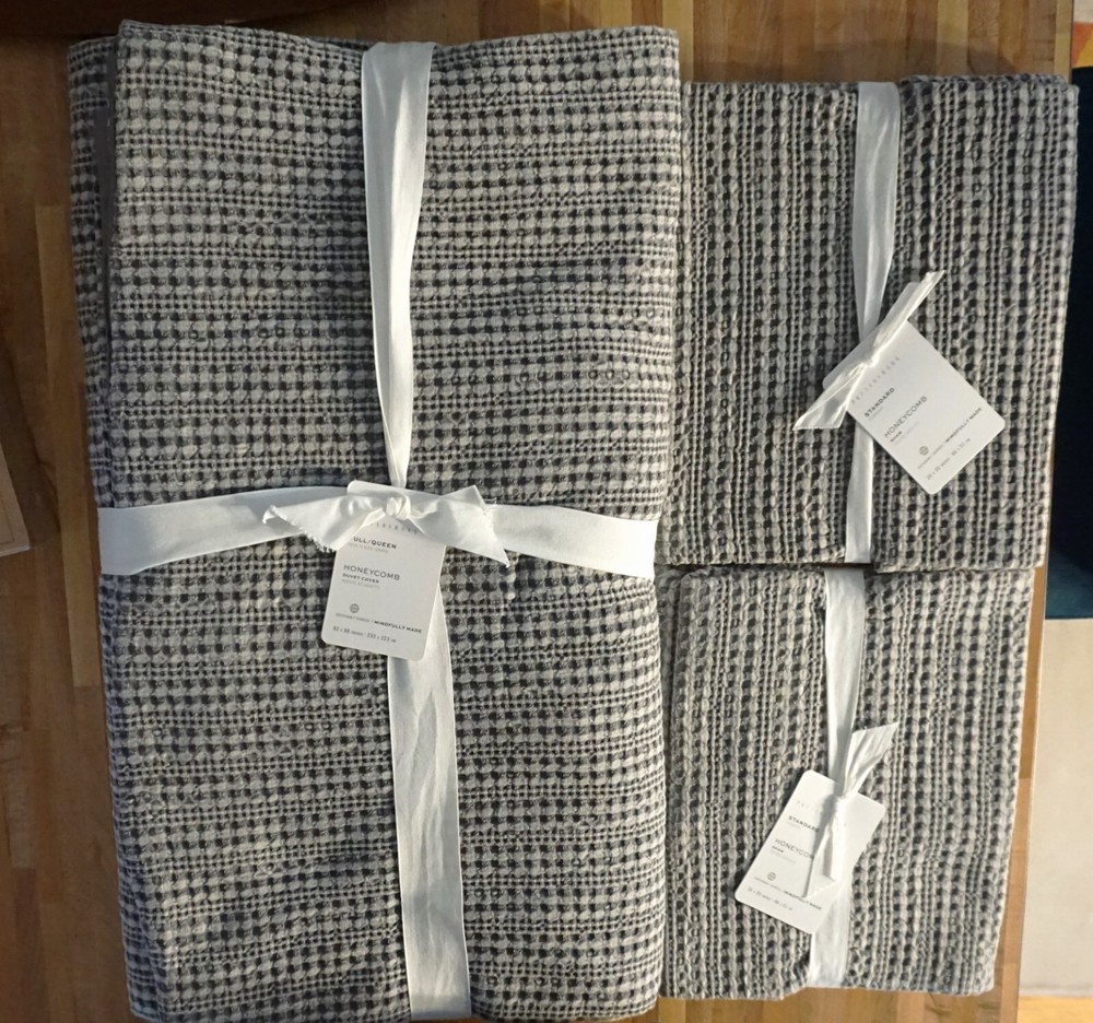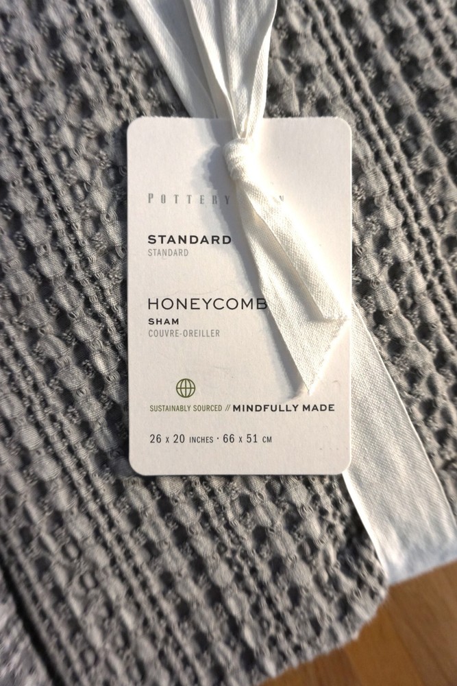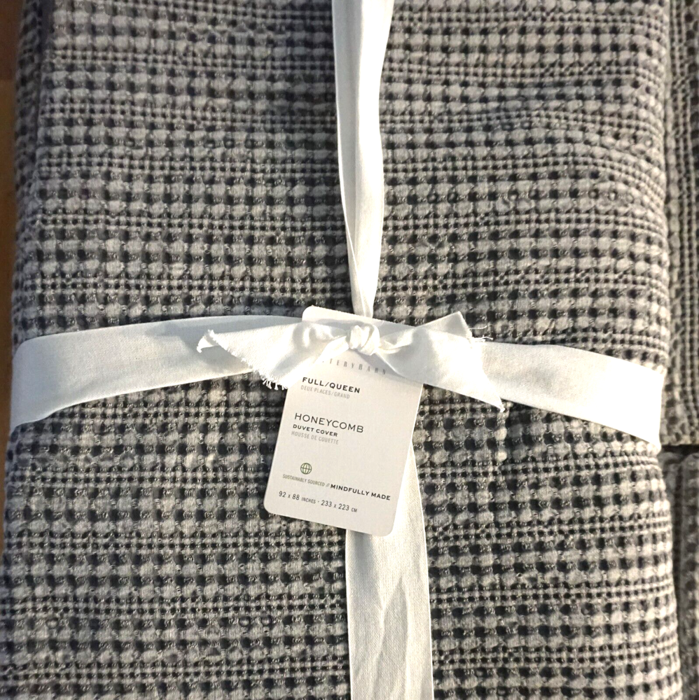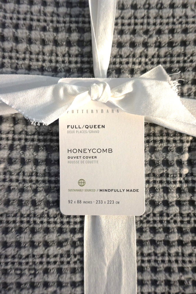 New Pottery Barn Gray Honeycomb Full/Queen Duvet Cover and 2 Standard Shams Duvet Cover measures 92" x 88" Standard Shams measure 26' X 20" Fabric is 100% Cotton Additional notes ~ Items offered for sale are vintage, pre-owned, and used (unless otherwise indicated). Because of the vintage nature of our items, varying levels of wear from age and use is expected and accepted. Pictures are taken for illustration purpose, colors will vary according to the lighting of the room and its surroundings. Please be sure to look at, and enlarge all photos as they are an integral part of the item description. We usually ship through USPS but reserve the right to ship through UPS or FedEX for larger and heavier items. If you should have any questions or concerns, please contact us before leaving feedback. International customers - Import duties, taxes, and charges are not included in the item price or shipping cost. These charges are the buyer's responsibility. Your business is greatly appreciated - THANK YOU! See my other listings for more great items!