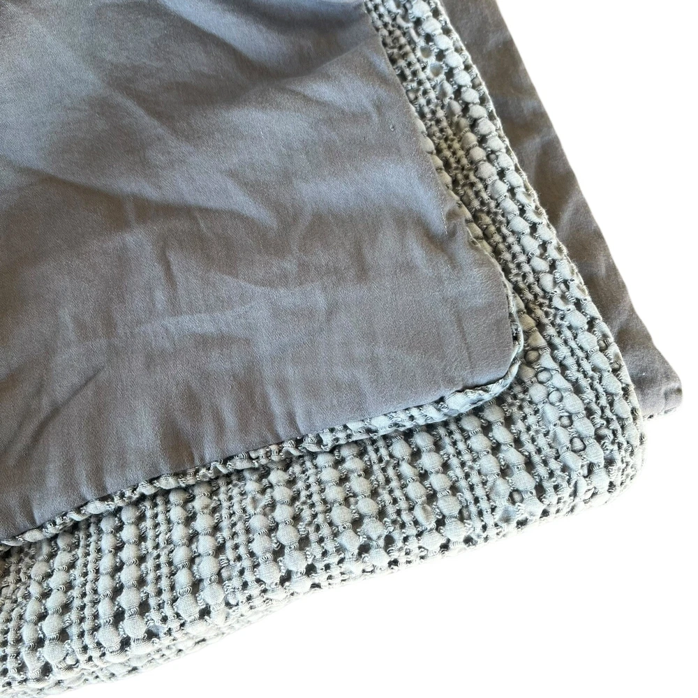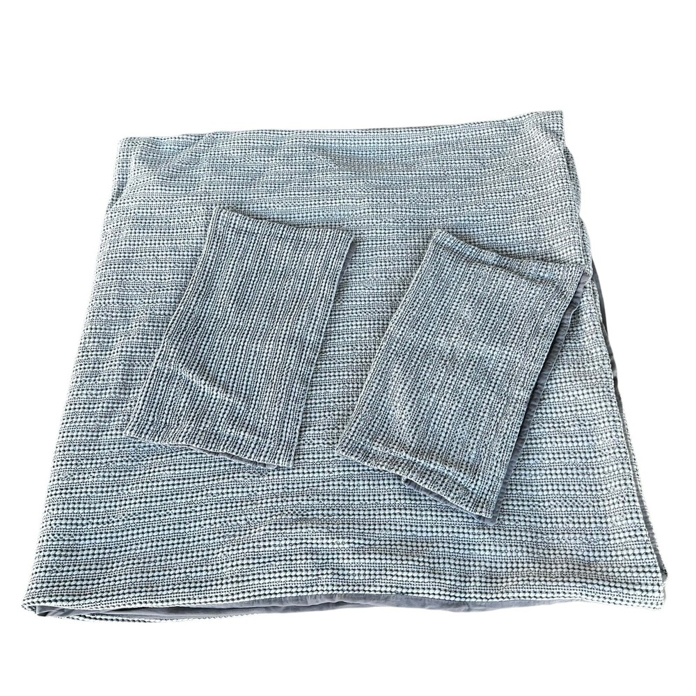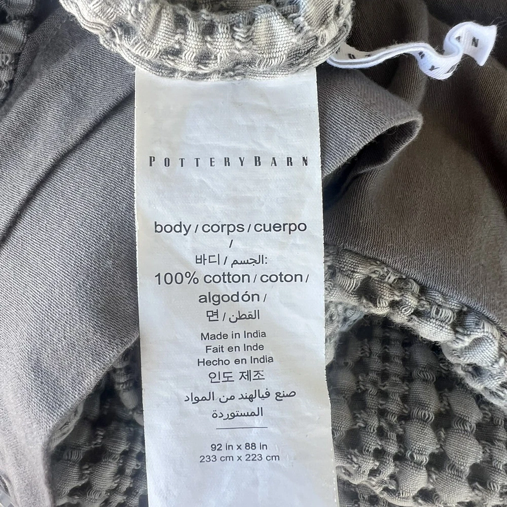 Pottery Barn Honeycomb Waffle Weave Textured 3-Piece Duvet Set. Full/Queen size. Color is a washed Gray. Top side has a textured honeycomb weave, the bottom side is flat. Button closure, interior ties. Listing includes: (1) Full/Queen duvet cover (2) Standard size flanged shams Good preowned condition with light wash wear. No flaws found. ✨5 Star Seller!✨ Ships quickly from a smoke-free home.