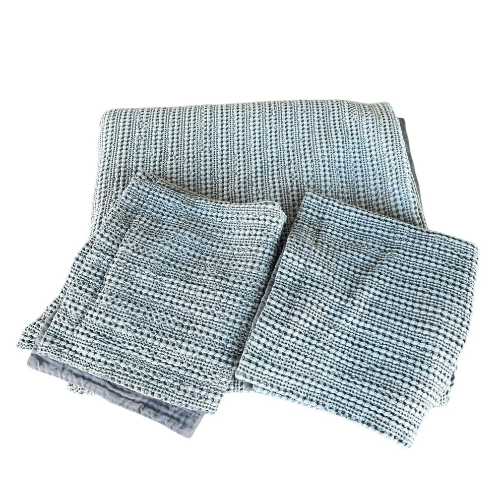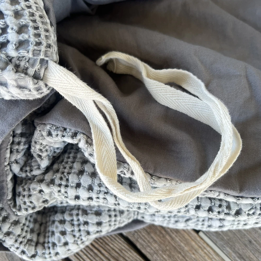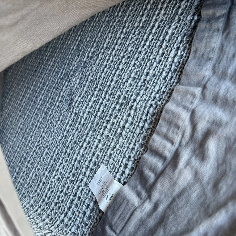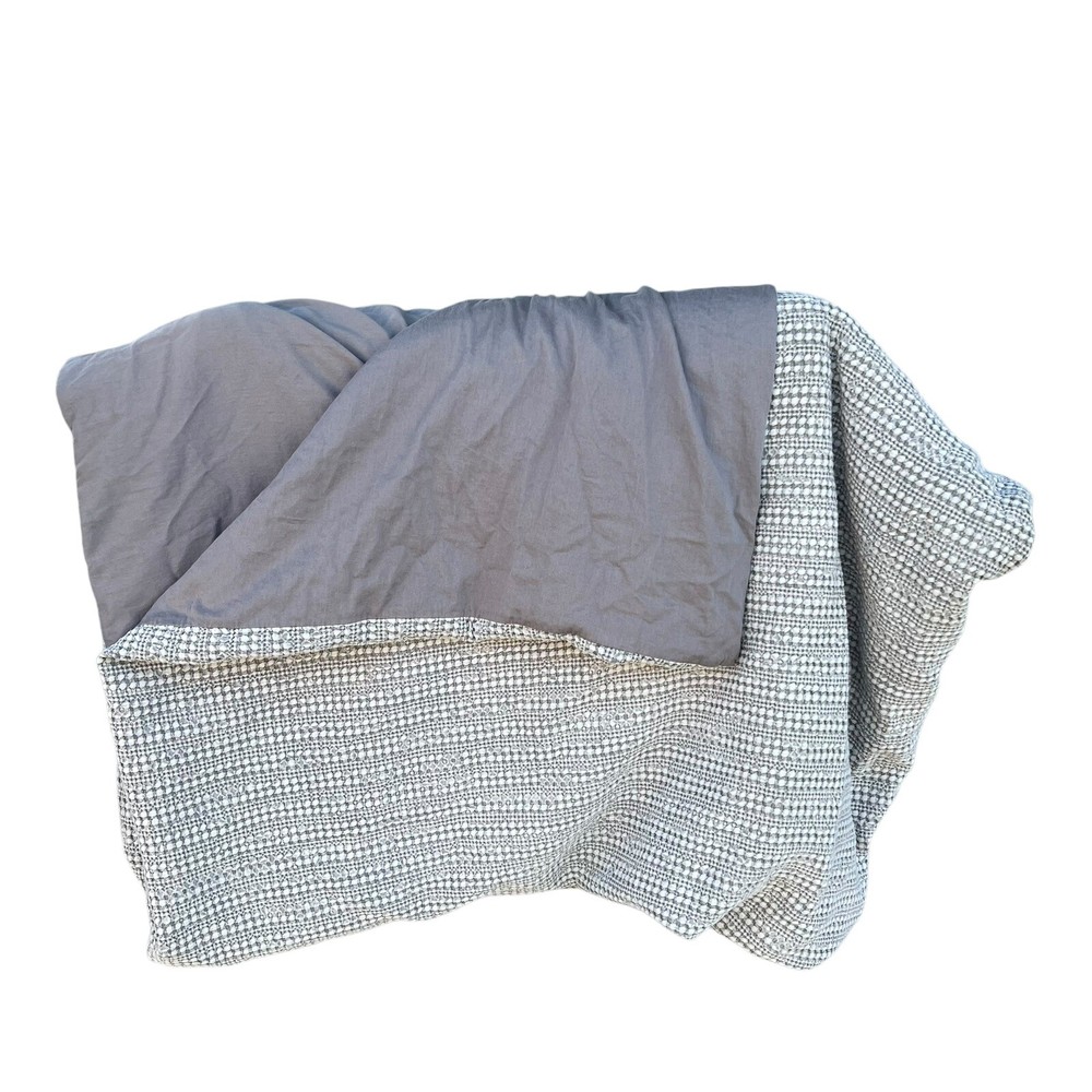 Pottery Barn Honeycomb Waffle Weave Textured 3-Piece Duvet Set. Full/Queen size. Color is a washed Gray. Top side has a textured honeycomb weave, the bottom side is flat. Button closure, interior ties. Listing includes: (1) Full/Queen duvet cover (2) Standard size flanged shams Good preowned condition with light wash wear. No flaws found. ✨5 Star Seller!✨ Ships quickly from a smoke-free home.