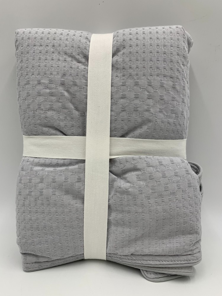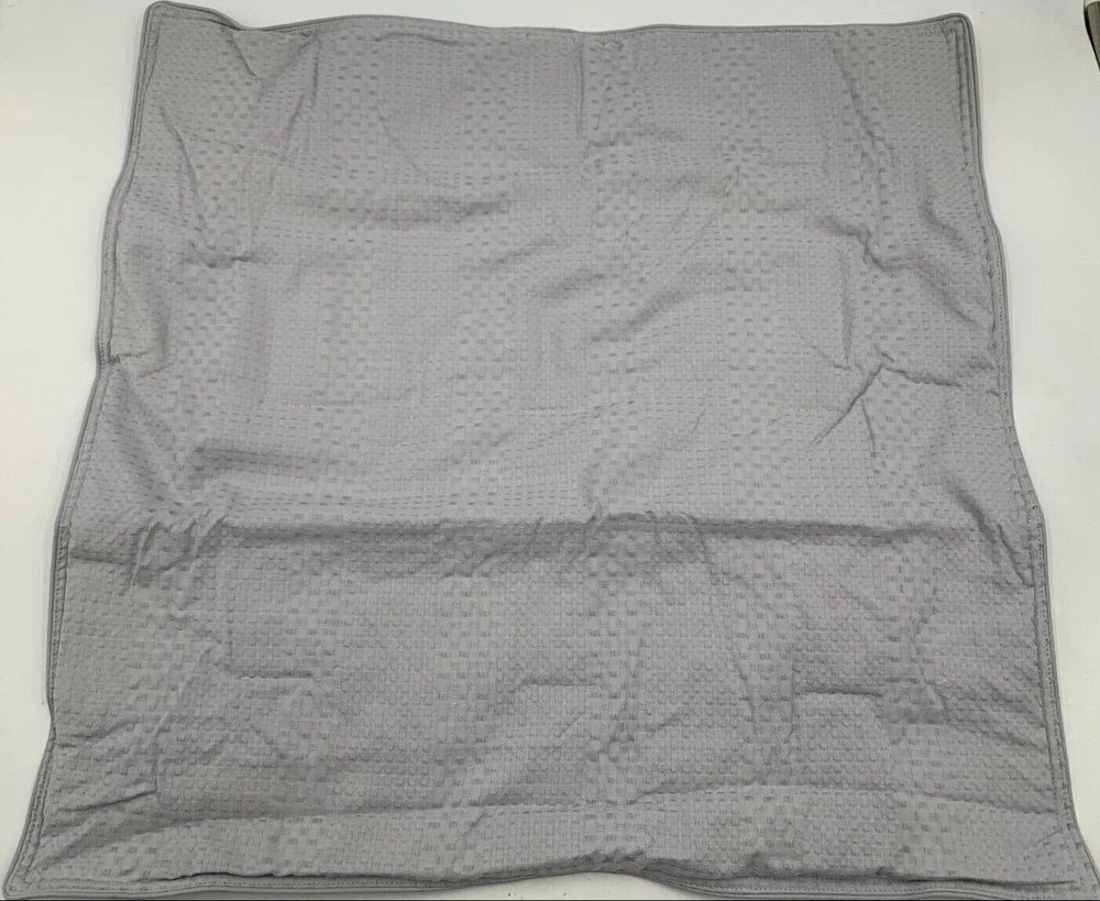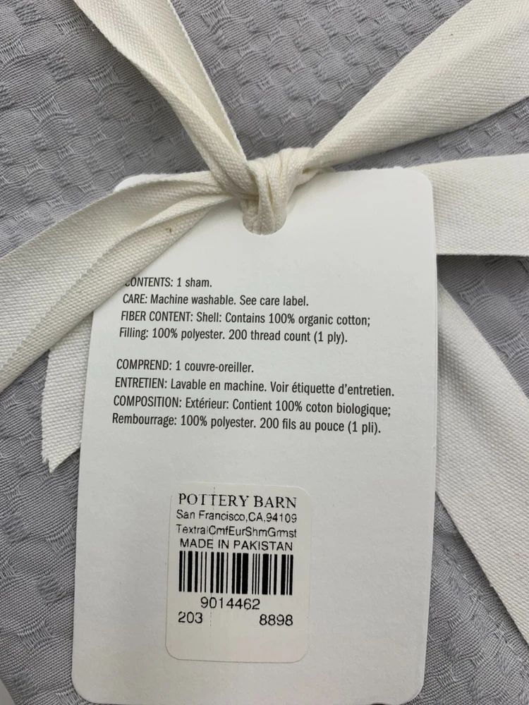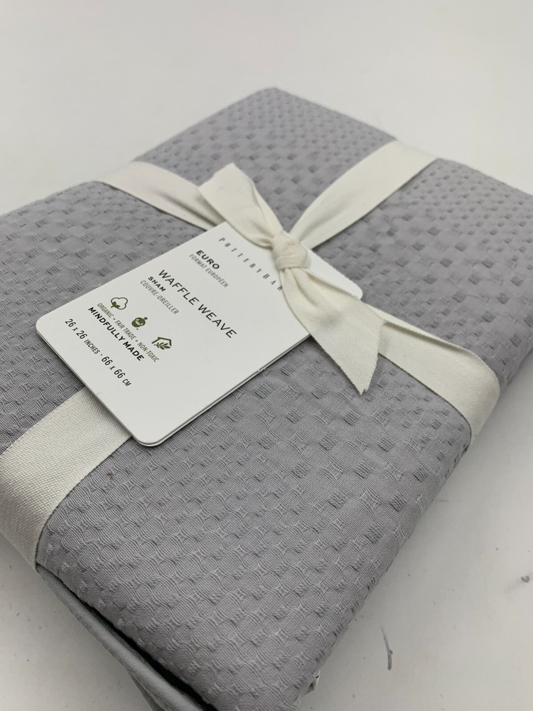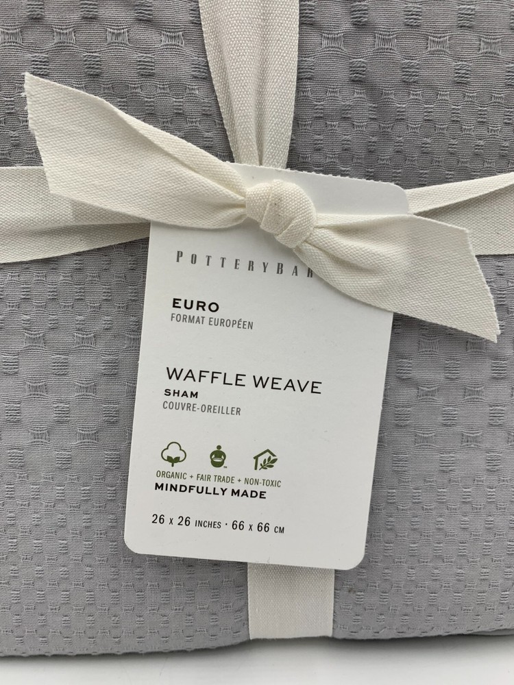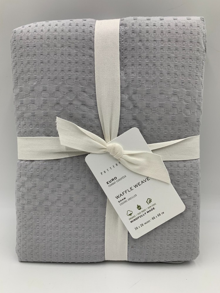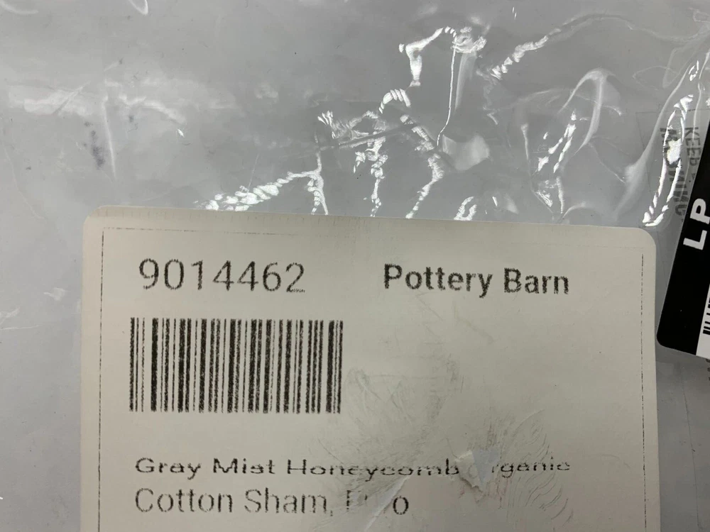 Pottery Barn Honeycomb Waffle Weave Organic Cotton Sham Euro Gray Mist Item is brand new. Auction includes 1 euro sham. Shall woven of 100% organic cotton percale. Sham features an envelope closure. Reverses to same. Machine washable. Imported. DIMENSIONS Euro: 26" sq CARE AND MAINTENANCE Machine wash in warm water; gentle cycle. Only non-chlorine bleach when needed. Tumble dry on low heat; remove promptly. Warm iron as needed.