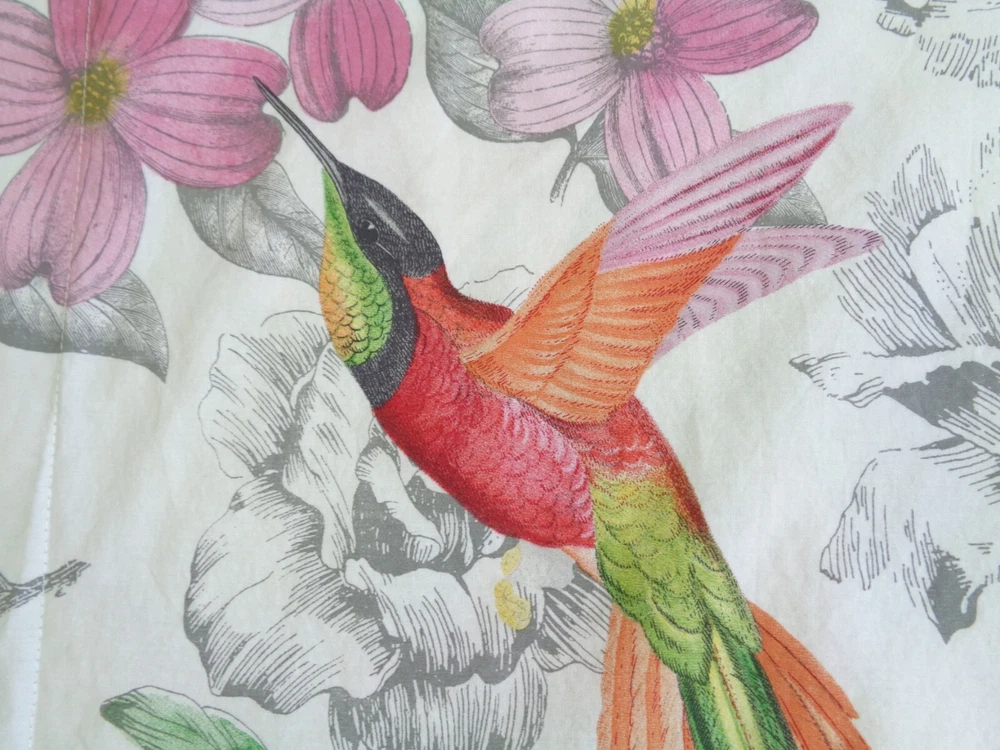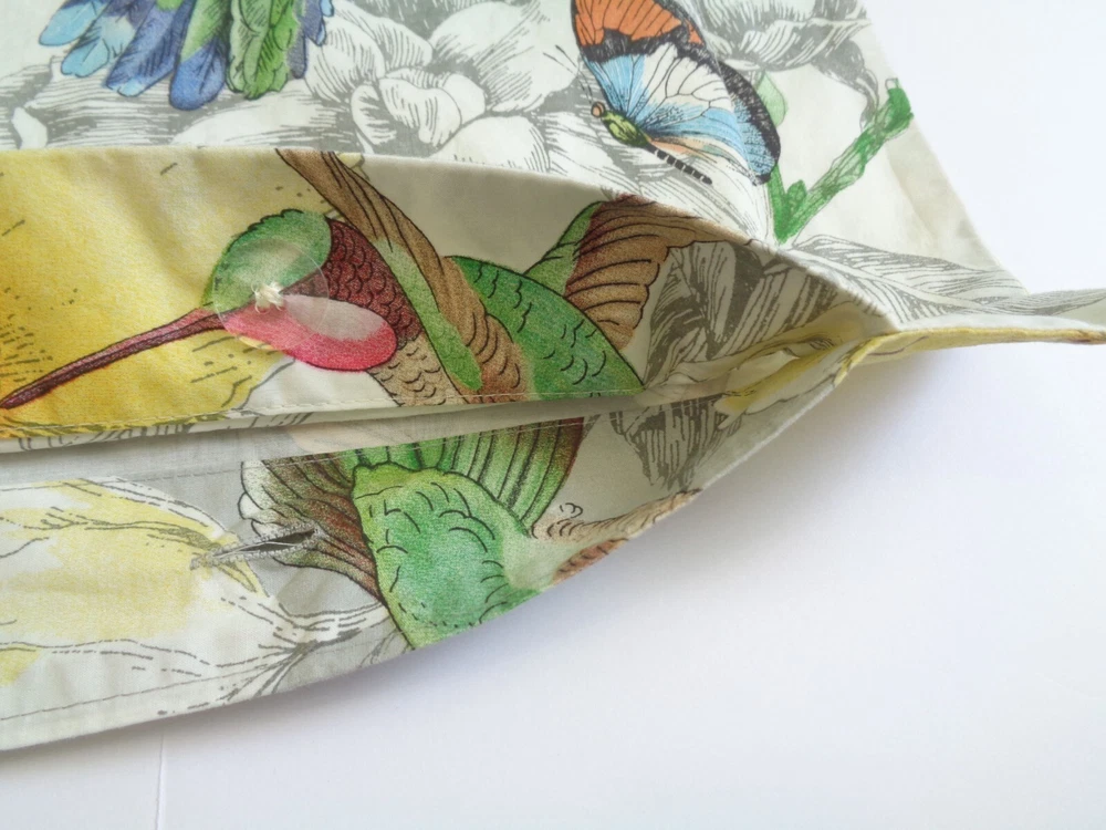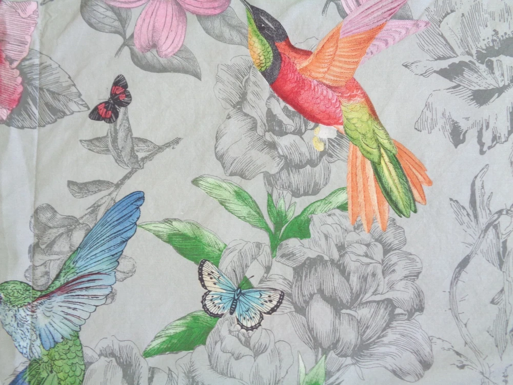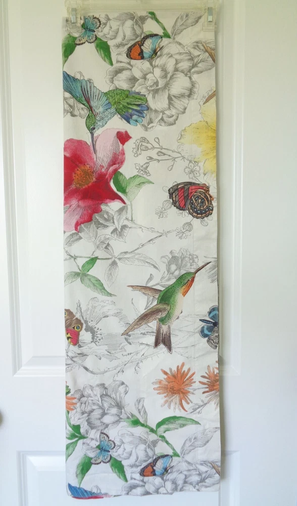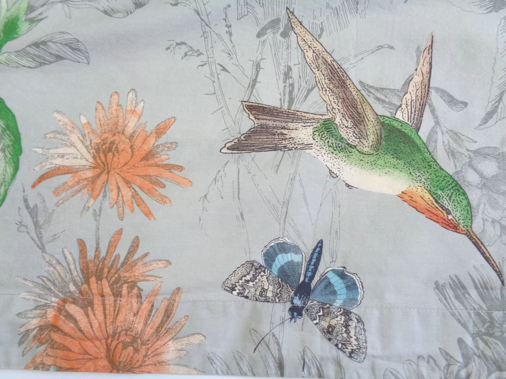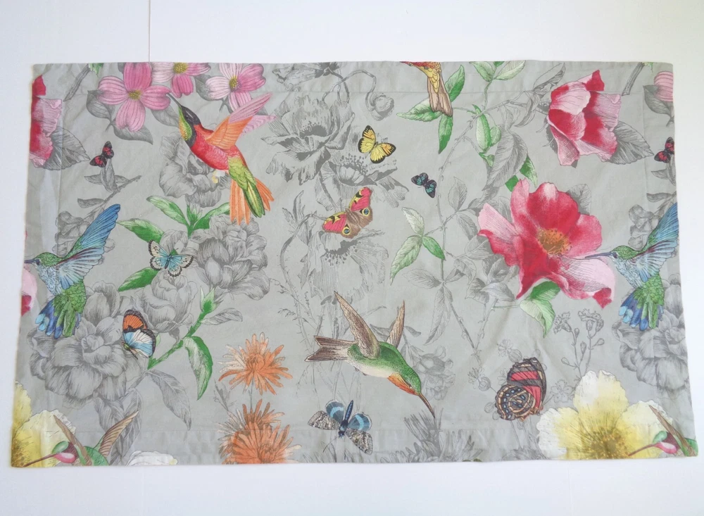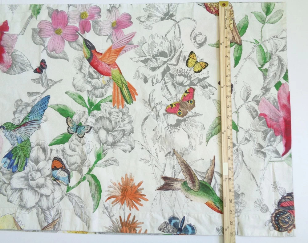 This pair of Pottery Barn hummingbird king size shams are a colorful and vibrant addition to any bedroom. Made from cotton with 5% organic cotton, the shams have a beautiful floral pattern with hummingbird and butterfly design. The multicolor palette with flowers and leaves adds a touch of nature to the room. These are reversible with one side having an off-white background and the reverse have a light gray background. These have a rectangular shape and button closure. Approximate outside measurement: 23 x 38.5 inches Approximate inside measurement: 20 x 35 inches Button closure Excellent condition - I noted two minute imperfections in the last two photos, but overall they are in great condition. D8