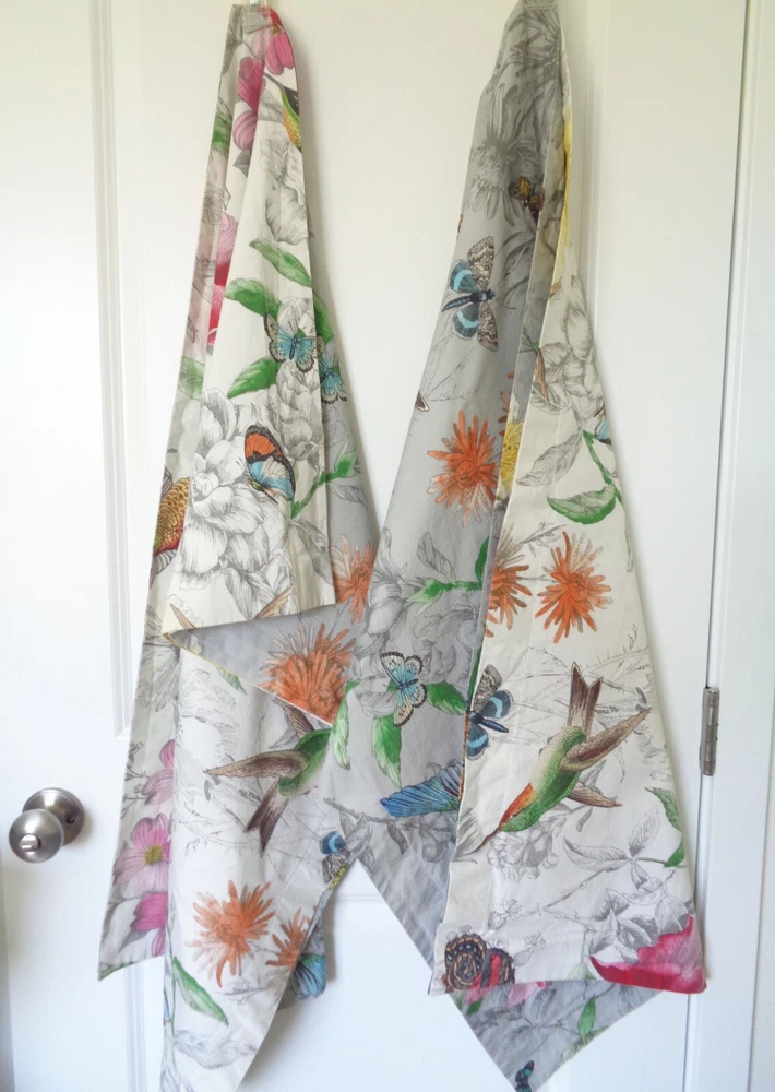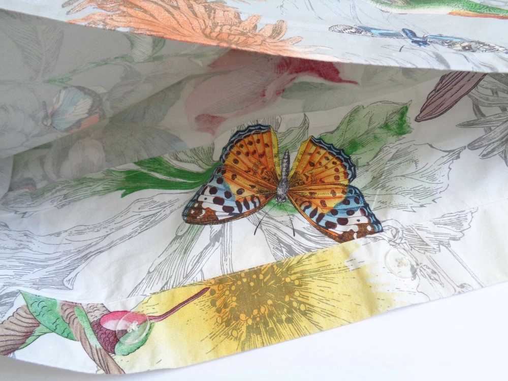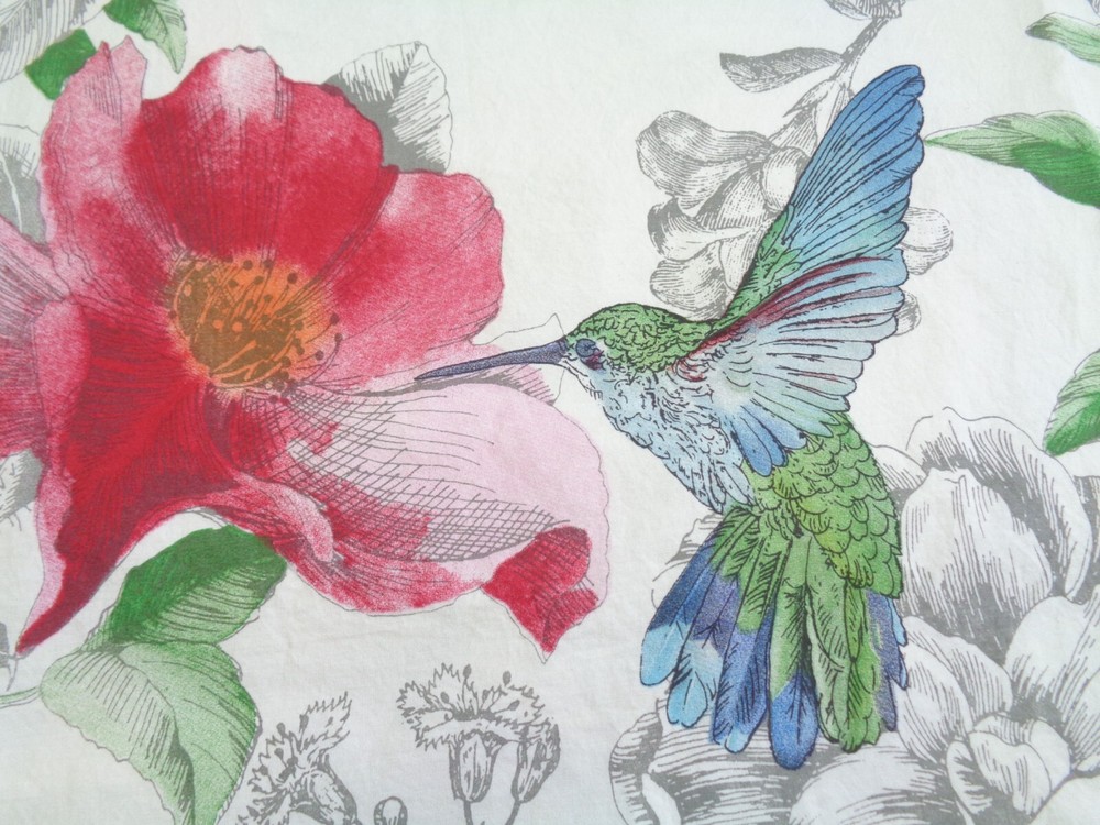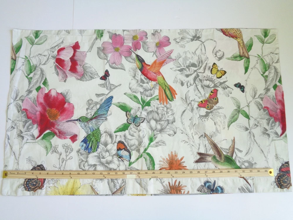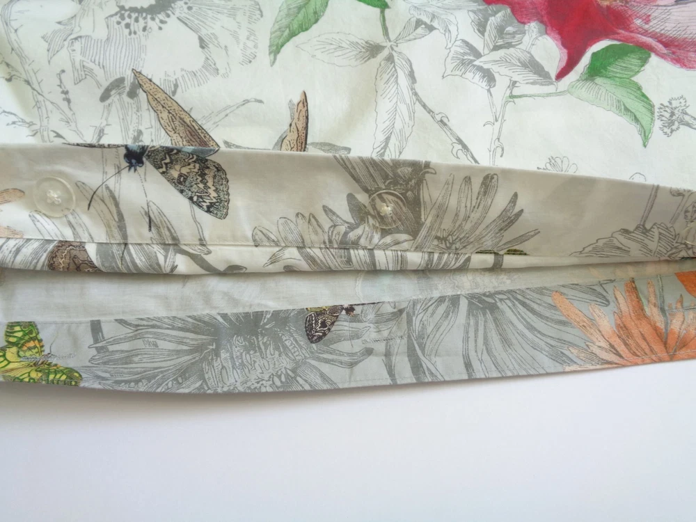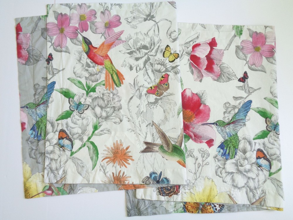 This pair of Pottery Barn hummingbird king size shams are a colorful and vibrant addition to any bedroom. Made from cotton with 5% organic cotton, the shams have a beautiful floral pattern with hummingbird and butterfly design. The multicolor palette with flowers and leaves adds a touch of nature to the room. These are reversible with one side having an off-white background and the reverse have a light gray background. These have a rectangular shape and button closure. Approximate outside measurement: 23 x 38.5 inches Approximate inside measurement: 20 x 35 inches Button closure Excellent condition - I noted two minute imperfections in the last two photos, but overall they are in great condition. D8