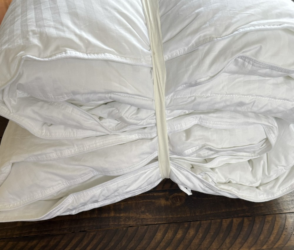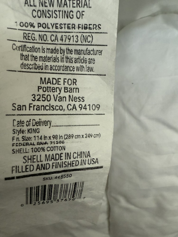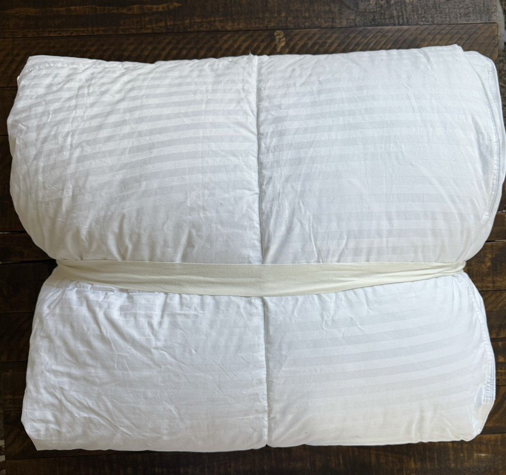 The original tags were removed and the bag label has been sharpie out- but this item is new Enhance your sleep experience with this premium Pottery Barn Hydrocool® Moisture Wicking Down Alternative Duvet Insert. The king-sized rectangular insert is made from 100% cotton with a 300-thread count, ensuring a soft and comfortable feel. Its solid white color gives a clean and modern look that matches any bedroom decor. The duvet insert features double-needle stitch sewn through box quilting, providing durability and long-lasting use. It is machine washable in cold water with a gentle cycle for easy care. This model is perfect for adults looking for a high-quality and stylish bedding accessory.