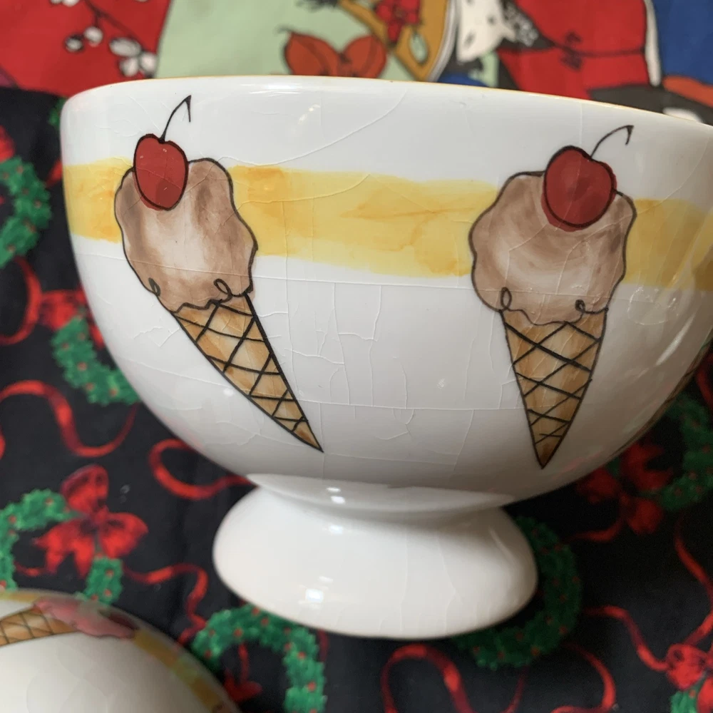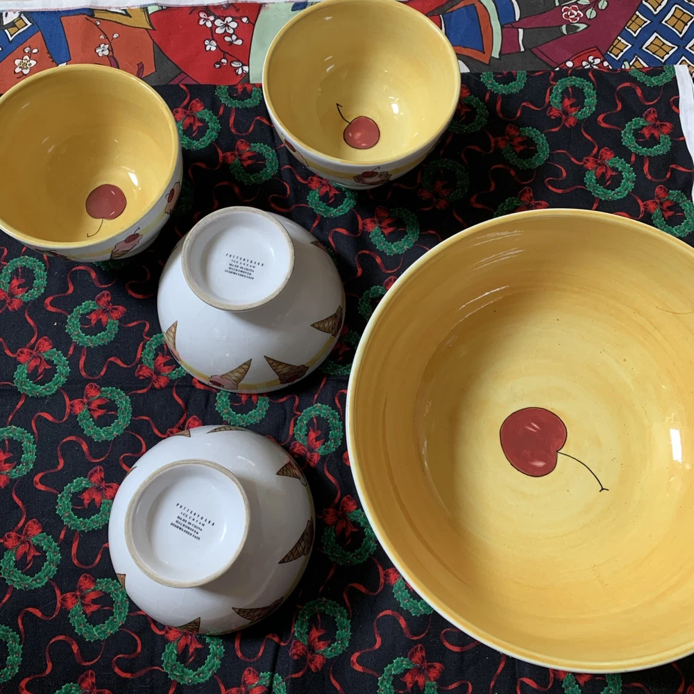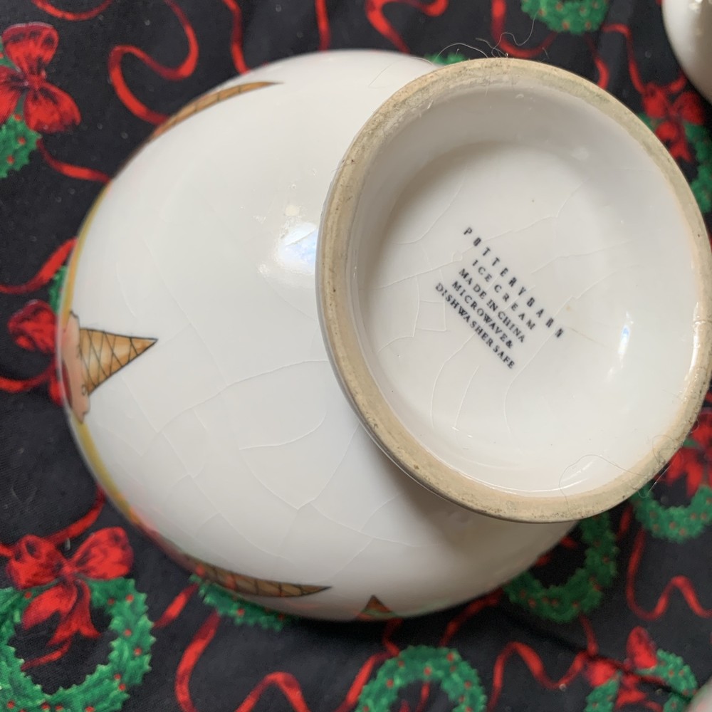 This elegant Pottery Barn serving bowl is the perfect addition to your table. The ceramic bowl features a delightful ice cream pattern in white, blue, and green, making it a hit with both adults and children. The bowl measures 10 inches in diameter and comes with four smaller bowls, making it perfect for serving ice cream to a group. The bowl has a painted backstamp and is part of the Pottery Barn product line. The bowl is a great example of American Empire style and is made using traditional pottery techniques. It is a contemporary piece that will add a touch of sophistication to any table setting. The bowl is handmade and was produced in China in 2020 or later. It is not vintage and is not a one-of-a-kind piece. Please see the pictures for more details on the condition, all you see are what I have, let me know if you have questions T2 free shipping
