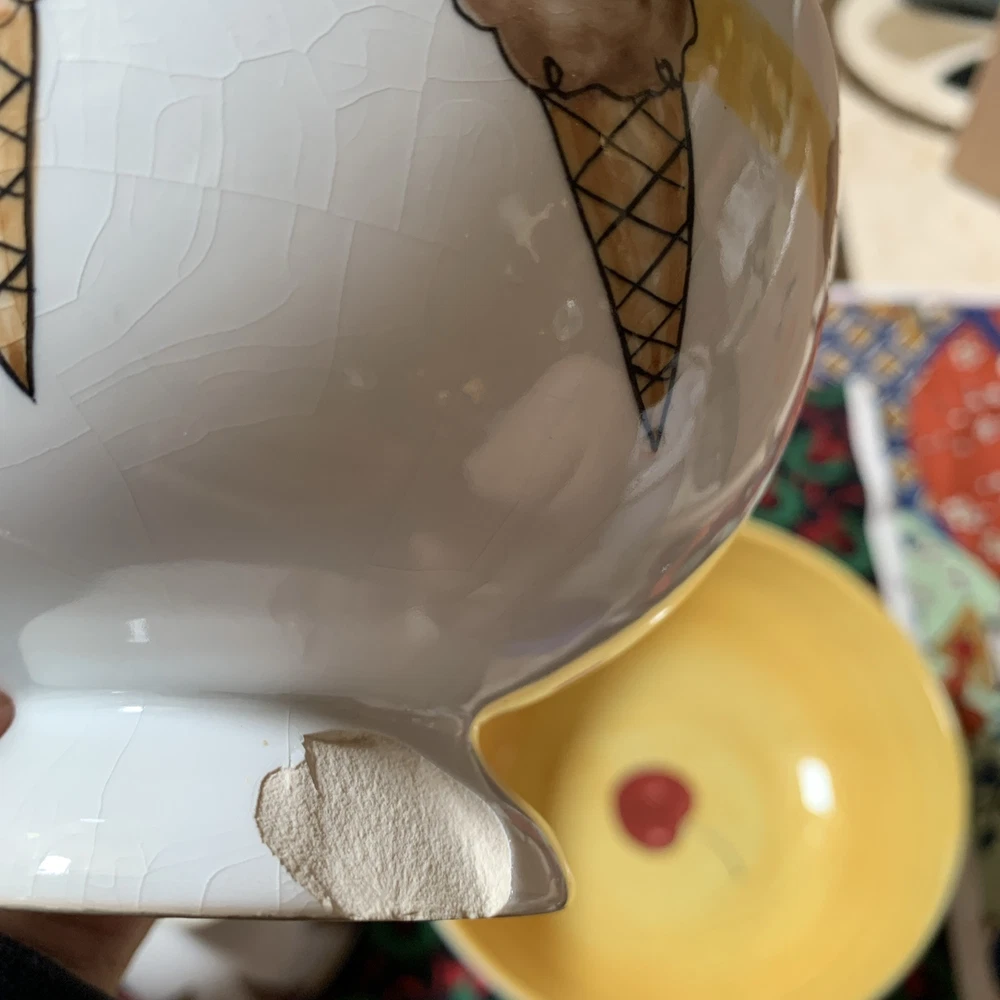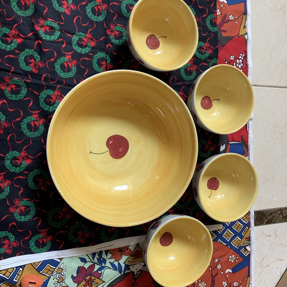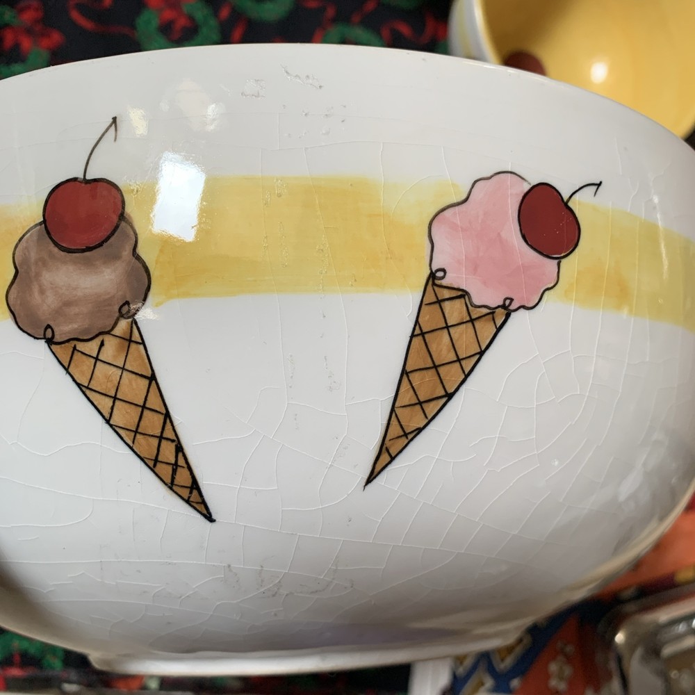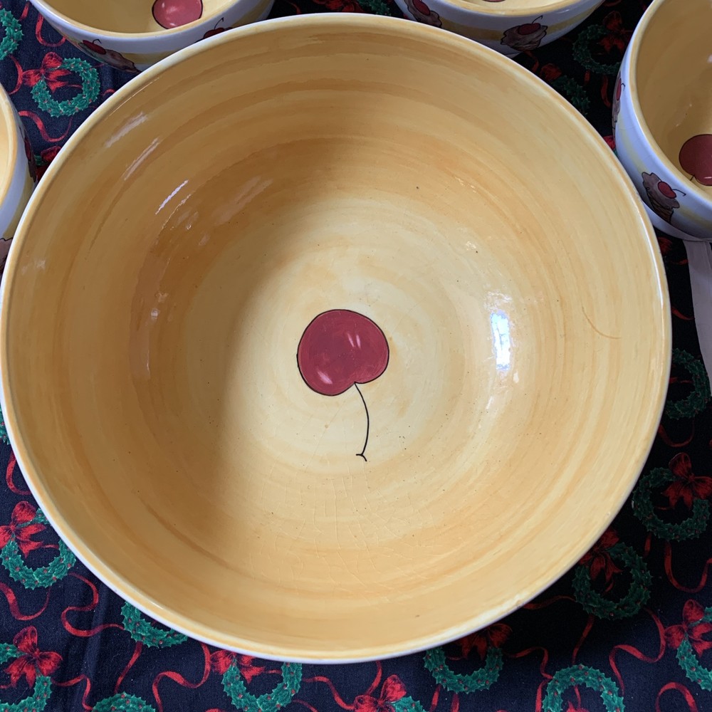 This elegant Pottery Barn serving bowl is the perfect addition to your table. The ceramic bowl features a delightful ice cream pattern in white, blue, and green, making it a hit with both adults and children. The bowl measures 10 inches in diameter and comes with four smaller bowls, making it perfect for serving ice cream to a group. The bowl has a painted backstamp and is part of the Pottery Barn product line. The bowl is a great example of American Empire style and is made using traditional pottery techniques. It is a contemporary piece that will add a touch of sophistication to any table setting. The bowl is handmade and was produced in China in 2020 or later. It is not vintage and is not a one-of-a-kind piece. Please see the pictures for more details on the condition, all you see are what I have, let me know if you have questions T2 free shipping