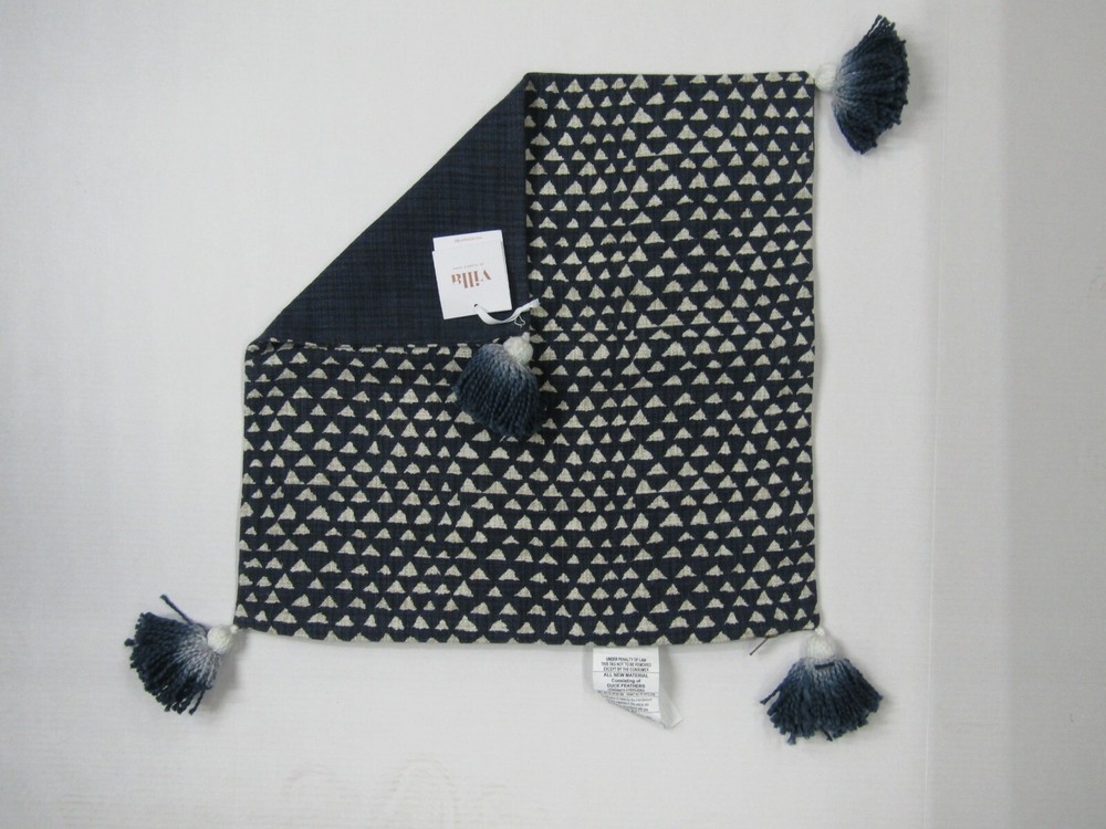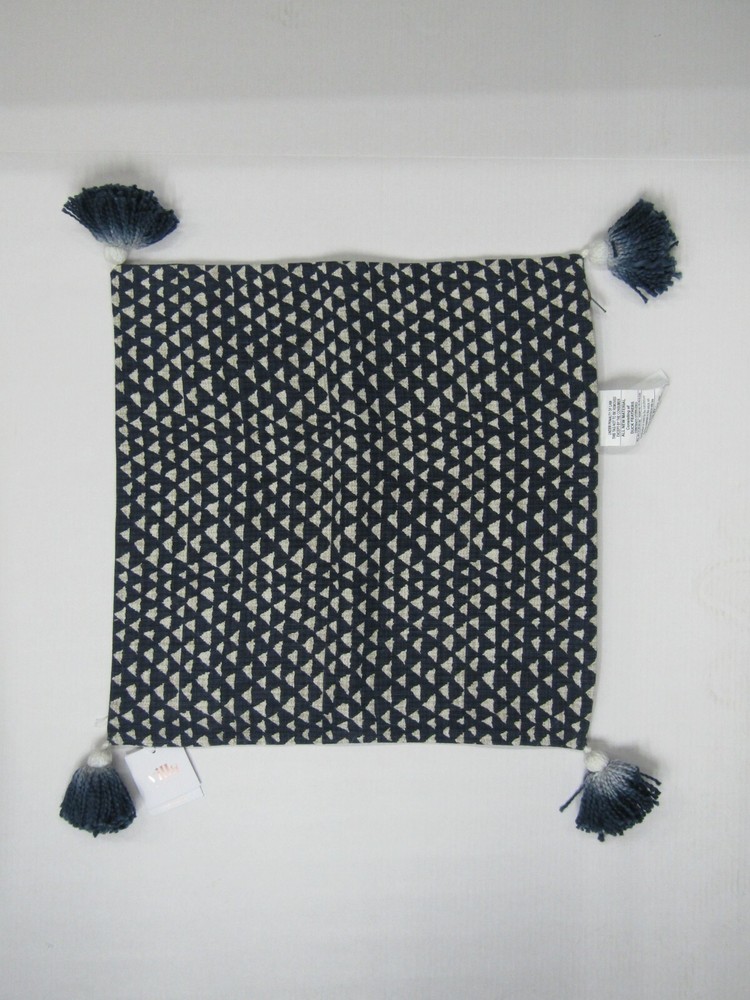 Pottery Barn Idelle Printed Pillow Cover With Tassels 20" sq Indigo #A191 Item is brand new! Auction includes: 1 Pillow Cover Made of 100% handspun cotton. Yarn-dyed fiber has incredibly rich color that holds its vibrancy over time. Reverses to solid indigo. Zipper closure. Accommodates a 20" square insert; sold separately. Spot clean. Imported. DIMENSIONS Overall: 20" sq Tassel (4): 2.5" dia, 4" l Zipper: 19" l CARE AND MAINTENANCE Spot clean with soft, damp cloth. Blot to remove excess water. Air dry.