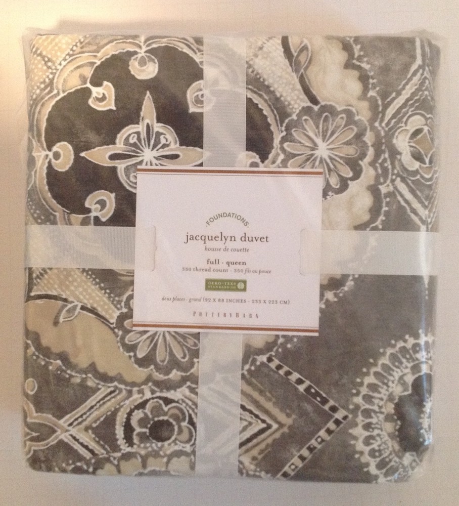 This NEW Pottery Barn Jacquelyn Full/Queen Duvet Cover Set includes a duvet cover and 2 standard shams in a pattern featuring grays, light brown, and multi-color. Striking medallions are printed in rich colors. It's made of 100% cotton (5% is organic) with sateen weaves and has a 350 thread count.of 350. This set is Oeko-Tex® certified and machine washable. The full/queen duvet measures 88x92 inches and the standard shams are 26x20 inches. Fast shipping from a smoke-free, pet-free home. Thank you for looking. Feedback from buyers: * "This is, by far, the best shopping experience I’ve had ever. Period. This seller went above and beyond to make sure she did every single thing possible to get me the sheet set I’d ordered. And then she followed up with a generous thank you. I’ve never had so much fun buying something!" * "The seller could not have made it any easier to make a purchase. The communication concerning the status of shipping and any follow up questions was quickly answered. This is what real customer service feels like. I would purchase from this seller again!" * "So so sorry for the belated feedback. This was the best seller I have ever encountered on eBay or anywhere for that matter, so kind, thoughtful, personable, accommodating. Went out of her way to get me the items even faster than ASAP w/out upcharge. Everything was pristine, beyond perfect, impeccably wrapped, I am so grateful and was thrilled to have the items needed for my first post COVID dinner party. She is a model for all sellers, her customer service is beyond compare, incredible actually."
