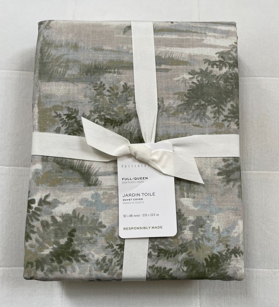 Pottery Barn Jardin Toile Duvet Cover Full/Queen ~Green New with Tags Pottery Barn describes as: Classic toile is given a painterly hand in this luxurious duvet. The soothing palette of blues brings incredible versatility and effortless style. Woven from cotton, it’s invitingly soft and cool to the touch. For a classic look, pair with textures and coordinating hues. Made with 100% cotton. Reverses to same. Duvet features a hidden zipper closure with inner ties that keep insert in place; sham features an overlap closure. We're a proud member of the Better Cotton Initiative (BCI). Machine wash. Imported. Full/Queen: 88" w x 92" l Pet & smoke free Ships within 1 business day Thank you!