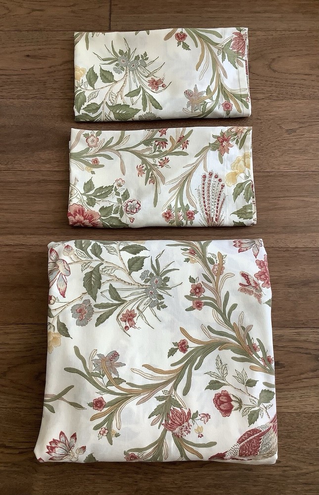 Add a touch of elegance to your bedroom with this Pottery Barn Jacobean Bird Floral Duvet Cover. The green, ivory, and red floral pattern is perfect for any room decor. This queen/full size duvet cover is made with high-quality materials to ensure durability and comfort. It's perfect for any bedroom and will give it a luxurious feel. The set includes two shams and is branded with the Pottery Barn logo. Add this stunning duvet cover to your collection today! Measurements: Duvet - 88” long x 83” wide / Shams - 29” x 28” Button closure on Duvet and envelope closure on shams. Linen Blend fabric Good used condition! Not perfect (small minor flaws that can only been seen if you are looking very very close) but still beautiful and has many years left in it.