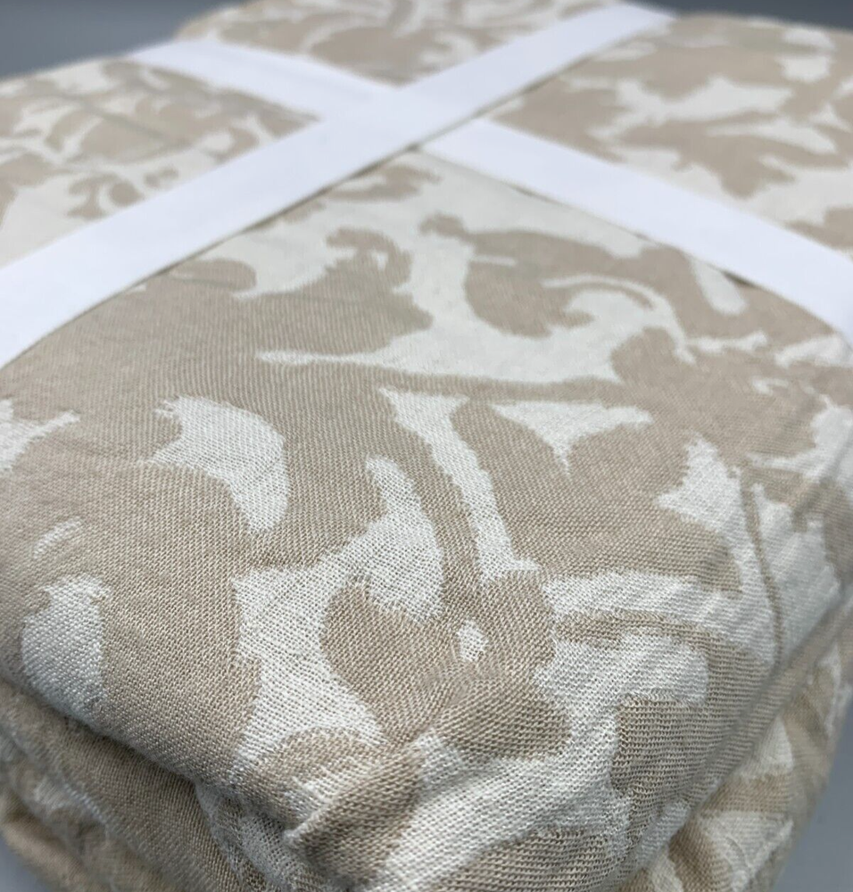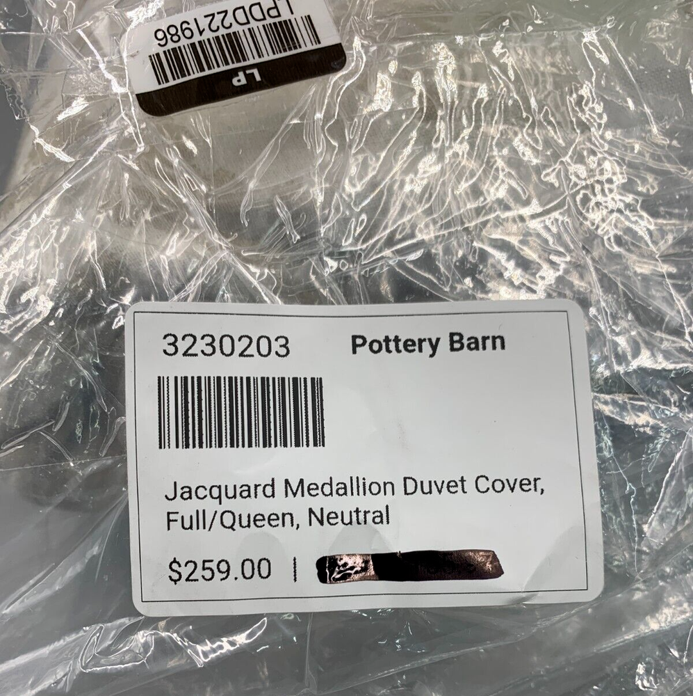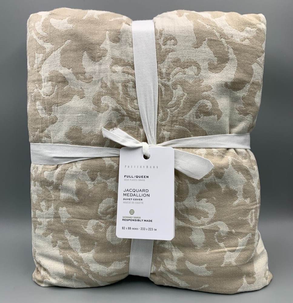 Pottery Barn Jacquard Linen Medallion Duvet Cover Item is brand new Auction includes: 1 duvet cover DIMENSIONS: Duvet Cover Full/Queen : 88" l x 92" w King/Cal. King: 92" l x 108" w Sham Standard: 20" h x 26" w Euro: 26" sq King: 20" h x 36" wide Flange: 1.5" CARE AND MAINTENANCE: Machine wash in warm water; gentle cycle. Only non-chlorine bleach when needed. Tumble dry on low heat; remove promptly. Warm iron as needed.