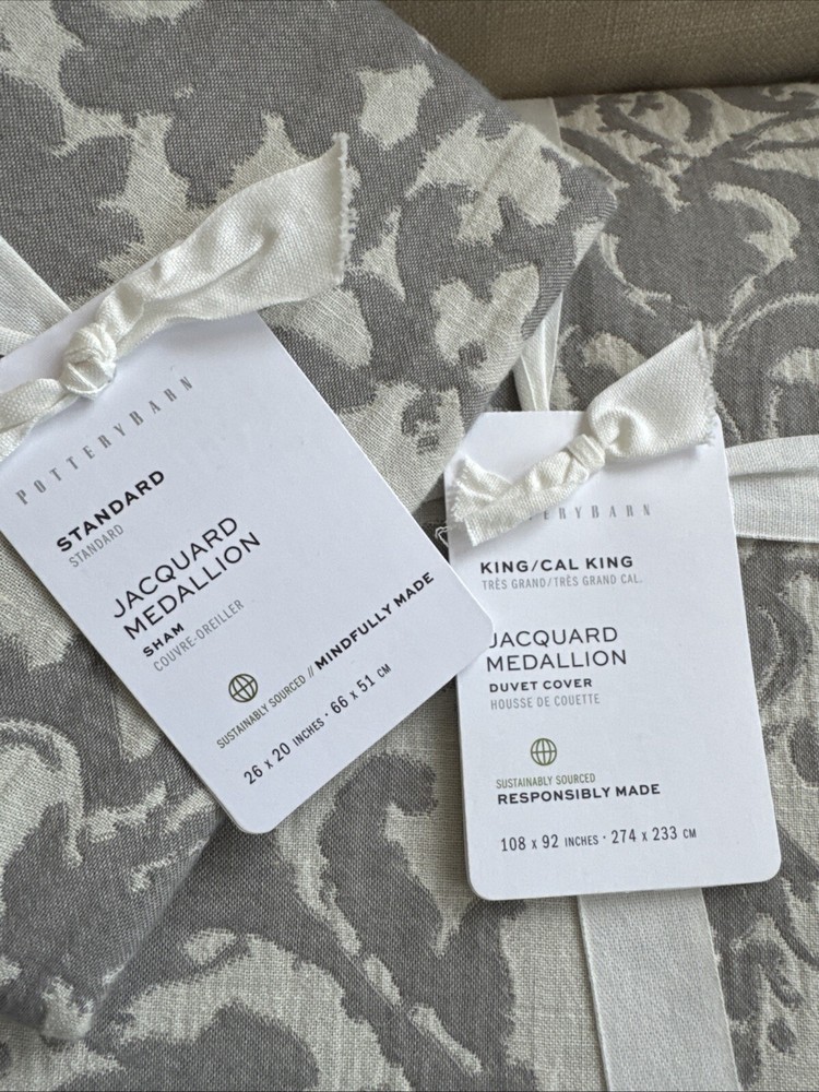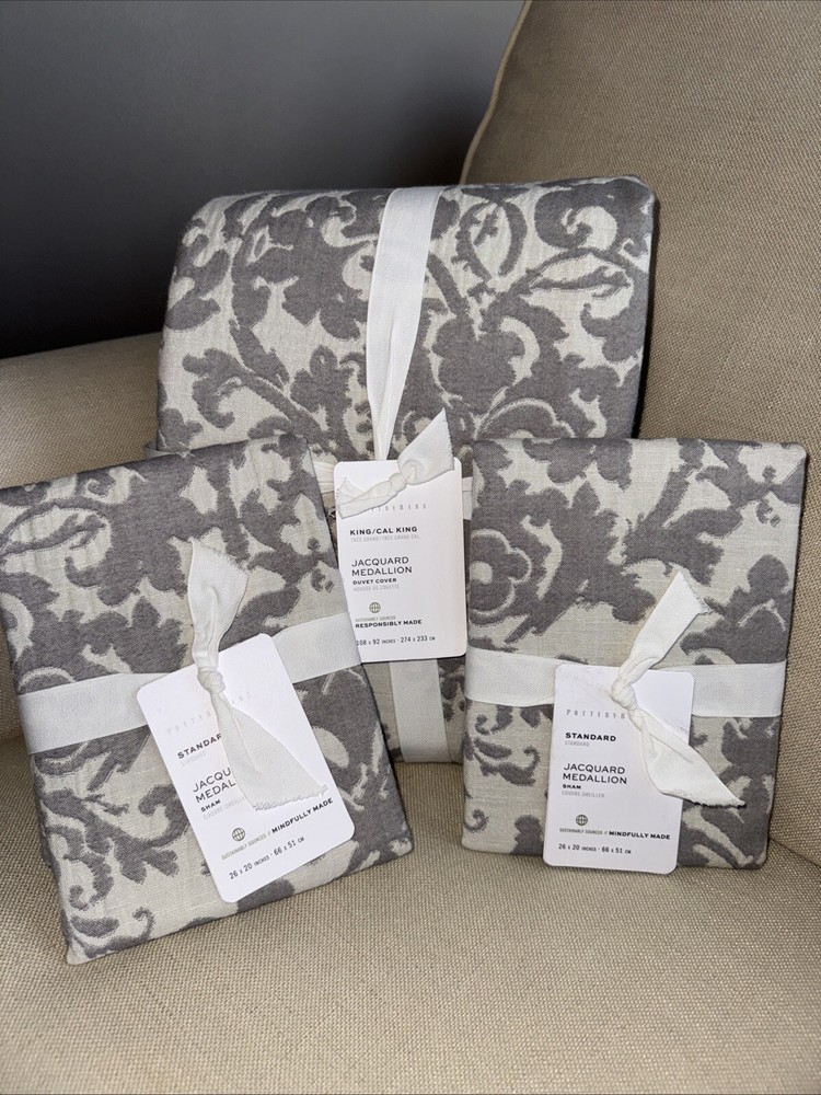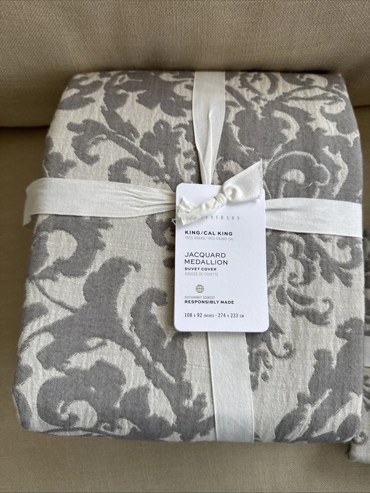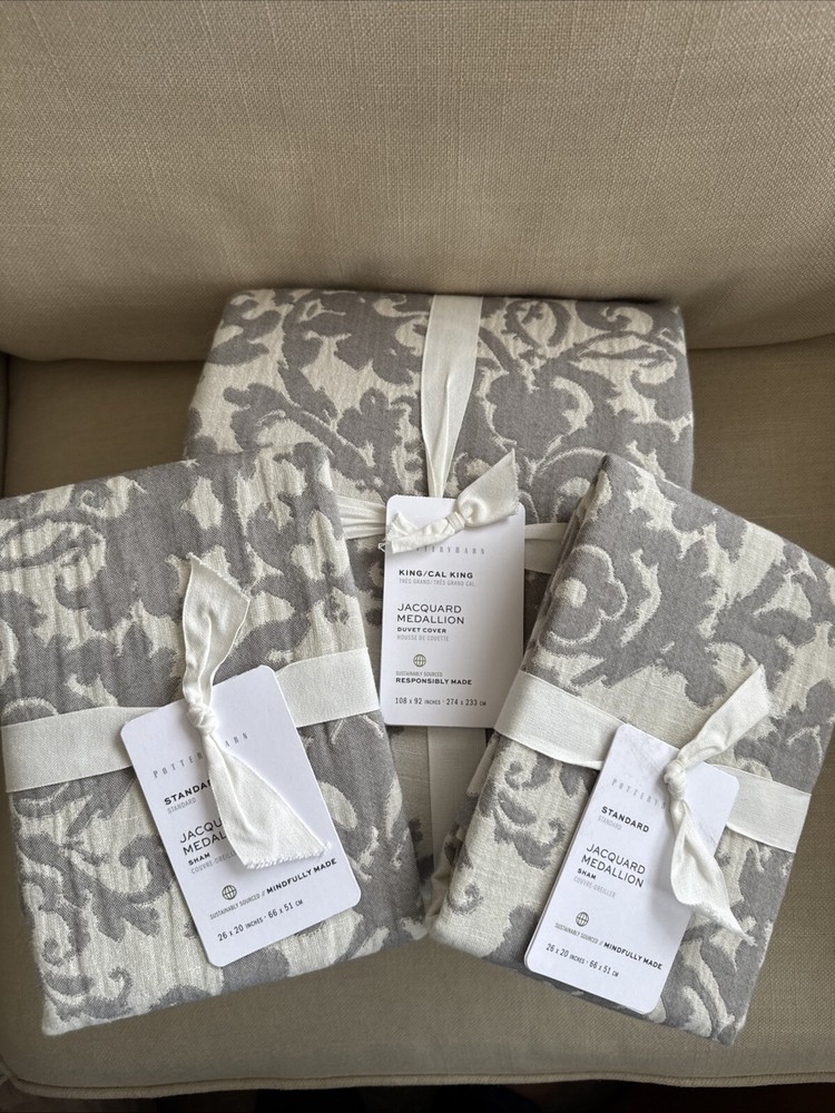 Pottery Barn Pottery Barn, a division of Williams-Sonoma, provides casual furnishings and textiles designed to delight and inspire the imagination. King / Cal King Duvet Cover & 2 Standard Pillow Shams Front Fabric: 45% Rayon, 38% Cotton, 17% Linen Reverse Fabric: 100% Cotton Solid Care: Machine washable This posting is for a duvet cover and 2 pillow shams, the insets and other items are not included. The photo's are of the actual item(s) Please ask all questions prior to purchase Stored in a smoke free environment Photos: We try our best to adjust the lighting to capture colors accurately; however colors can differ in photos depending on lighting and the devise used for viewing. Before purchasing, we recommend reviewing the item on the products website. Shipping: Shipping is offered to the confirmed address on record. Please make sure the shipping address is accurate before making a purchase. For your convenience tracking numbers are uploaded to eBay once shipped. Product may be shipped with Signature Confirmation. Returns: Please contact us if there is a problem with the item(s) you receive within 14 days of receipt of the item. Refunds are offered if returned in the original package (as packaged by the manufacture), unused and with tags attached. Shipping costs will be subtracted from the refund. International Shipping: eBays Global Shipping Program is offered for International Shipping. Import duties, taxes and charges are not included in the item price or shipping costs. These charges are the buyer's responsibility. Please check with your county's customs office to determine what these additional costs will be prior to bidding or buying. Thank you for looking!