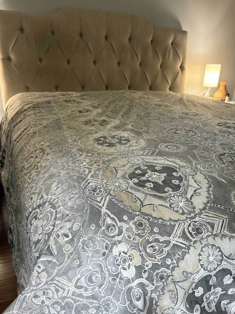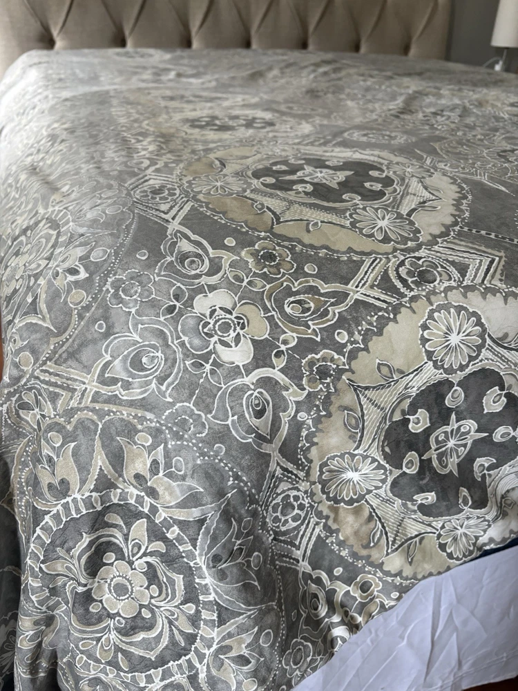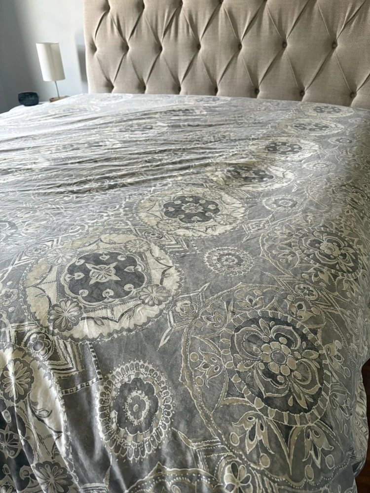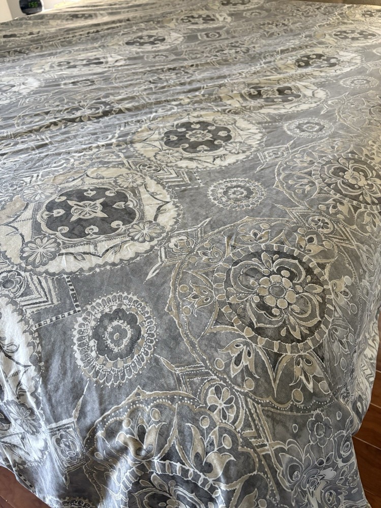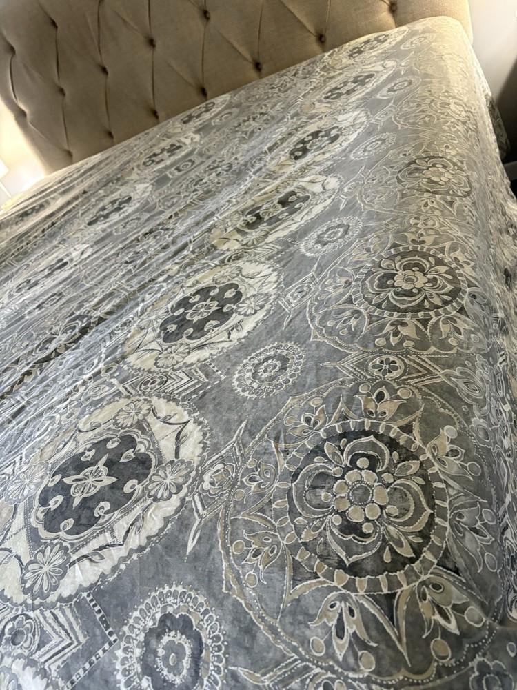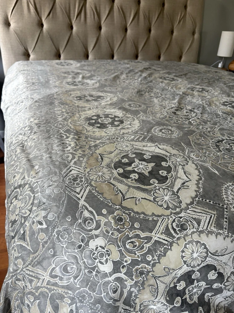 The Pottery Barn Jacquelyn Medallion Duvet Cover in Gray is a luxurious addition to any bedroom. Made from 100% cotton, this king-sized duvet cover features a beautiful medallion pattern in a soothing gray color. With a roomy length of 104 inches and width of 90 inches, this duvet cover from the Pottery Barn Jacquelyn collection is both stylish and comfortable. Easy to care for with machine wash instructions, this duvet cover is a perfect choice for anyone looking to add a touch of elegance to their bedroom decor. The measurements were approximate laying flat on the king size bed. There are no visible flaws.